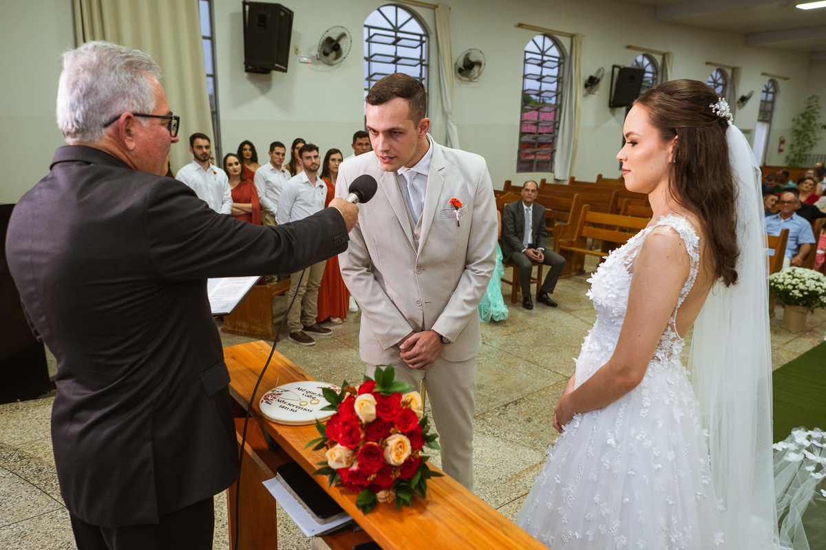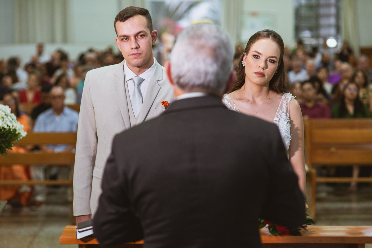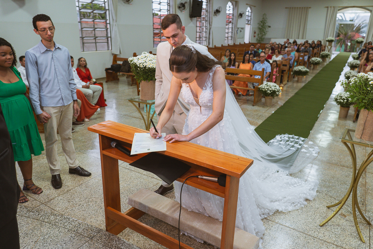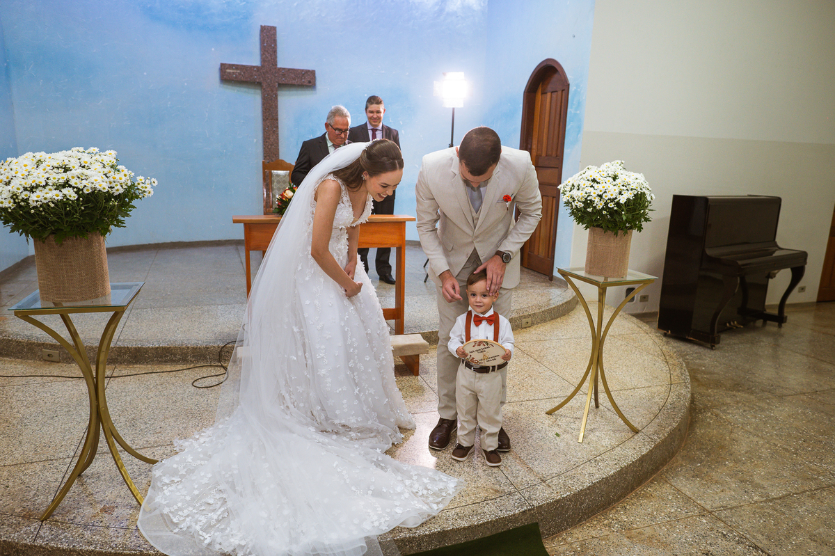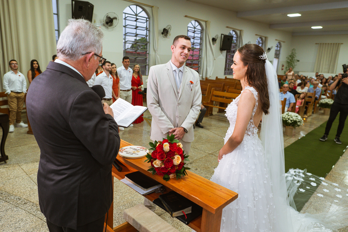 Juntinhos, os dois caminharam rumo ao altar. O presbítero os recebeu com todo carinho e até os fez sorrir durante a ministração da palavra, que foi dividida em dois momentos. Um dos pastores realizou a cerimônia e o outro os ungiu. Eles assinaram os documentos de casamento e trocaram seus votos. As alianças foram convidadas a entrar e foram trazidas por outro pajem, que arrancou sorrisos de todos ao chegar no altar. Sem saber muito o que fazer, ele ficou ali em meio aos noivos. Eles sorriram e pegaram o porta-alianças com a escrita "Até que Jesus volte, seremos um só". Esther e Paulo trocaram as alianças e com um beijo em cada uma das mãos, eles fecharam aquele momento com todo carinho. O pastor os declarou casados perante Deus e as testemunhas e disse que estavam liberados para que o noivo beijasse a noiva.