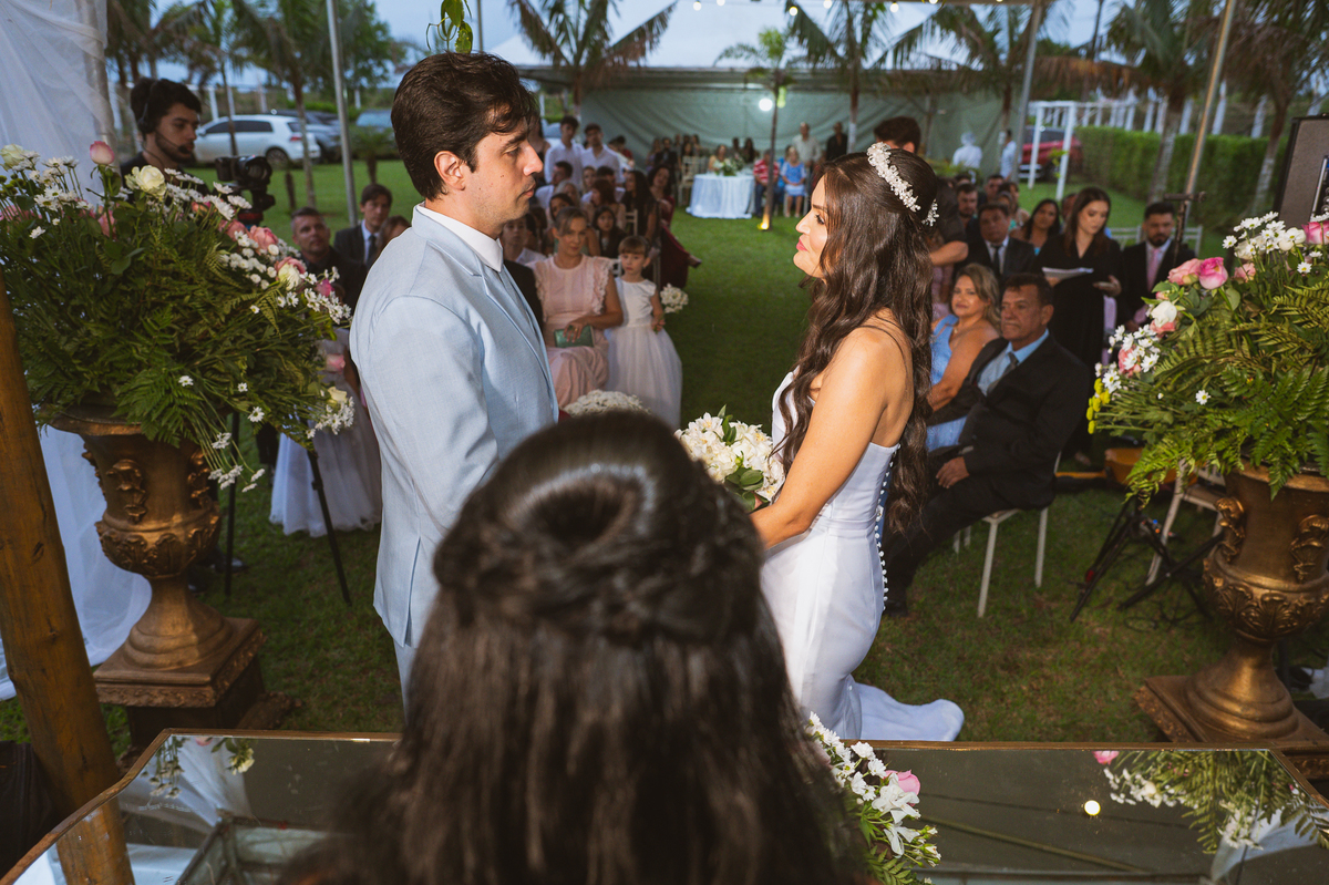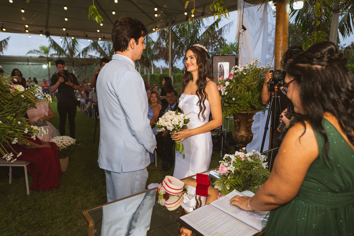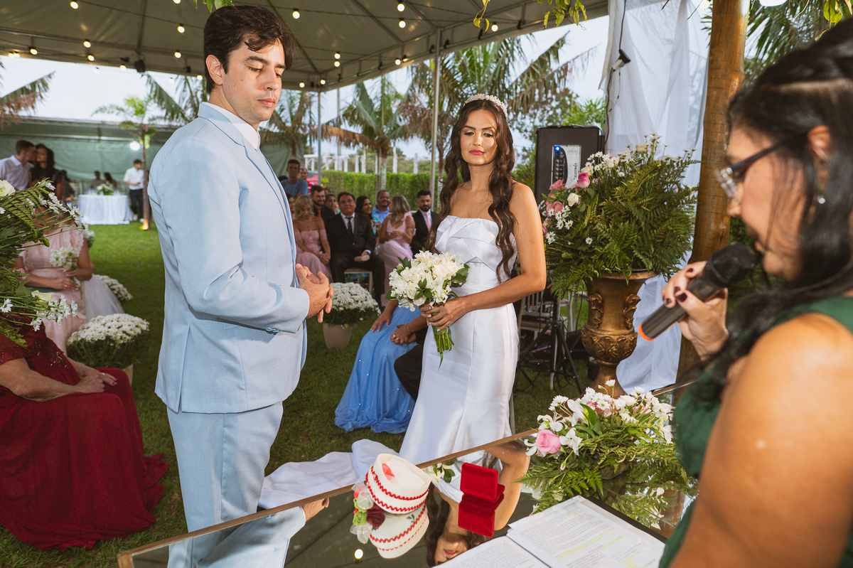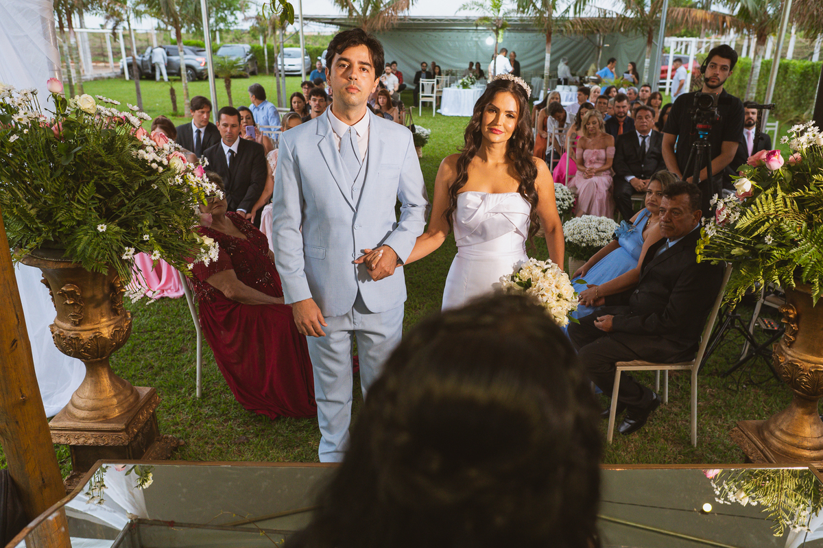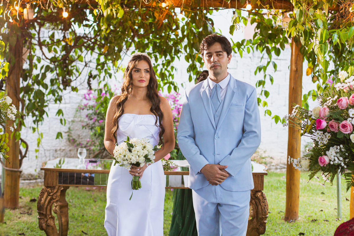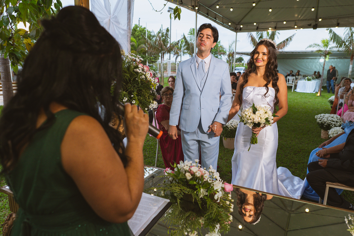 Eles caminharam juntos rumo ao altar, para a celebração do seu matrimônio. A celebrante os recebeu carinhosamente os saudando com muita alegria. Ela trouxe uma reflexão linda que envolveu os dois, os fazendo virar para seus convidados e ver um por um. Depois, pediu para que eles olhassem para seus pais e também lembrassem daqueles que se foram e que gostariam muito de estar ali. Posteriormente, ela realizou os proclames de casamento e questionou os dois acerca da sua espontânea vontade de se casar um com o outro. O sim foi instantâneo. Agora, era hora de trocar as alianças e as juras de amor para sempre. Quando pensávamos que a emoção havia passado, chegara a hora dos votos.