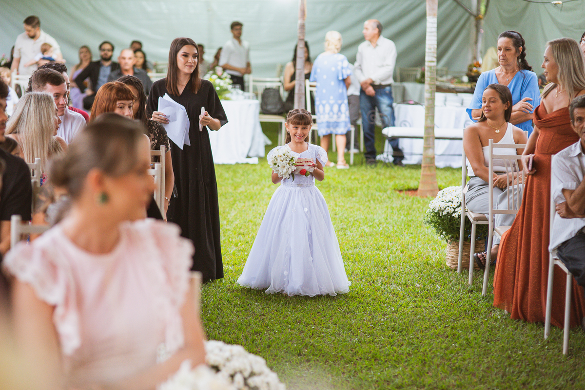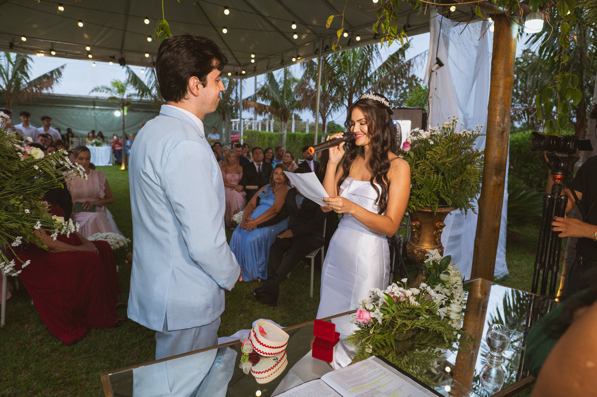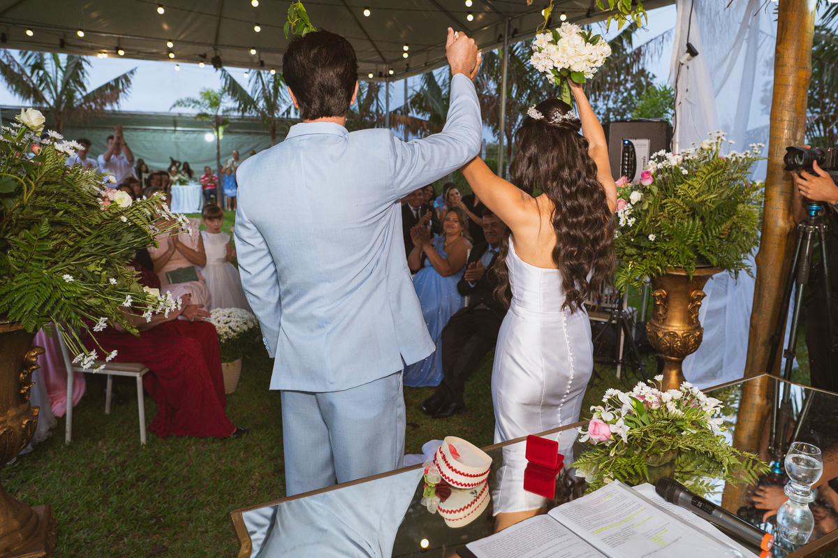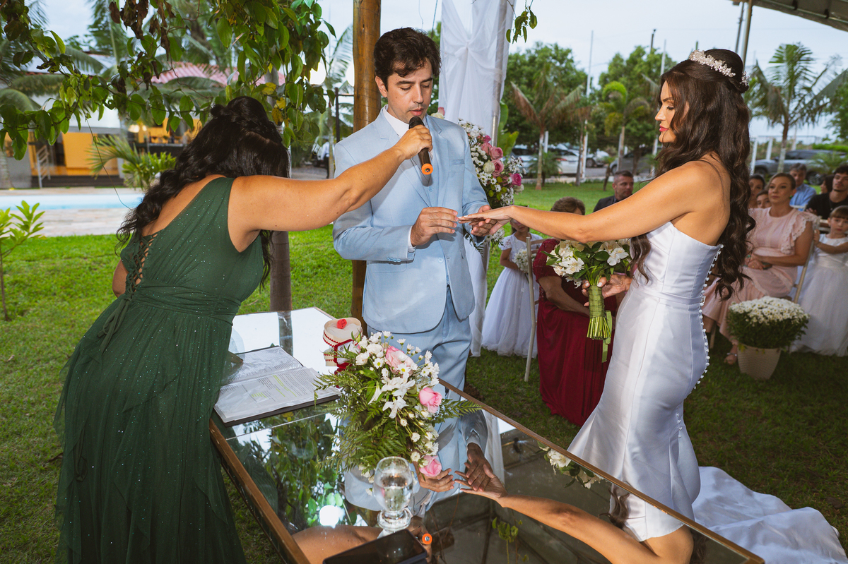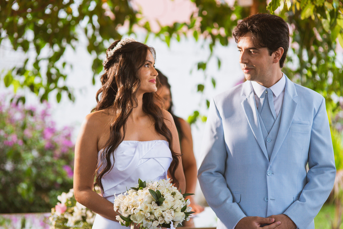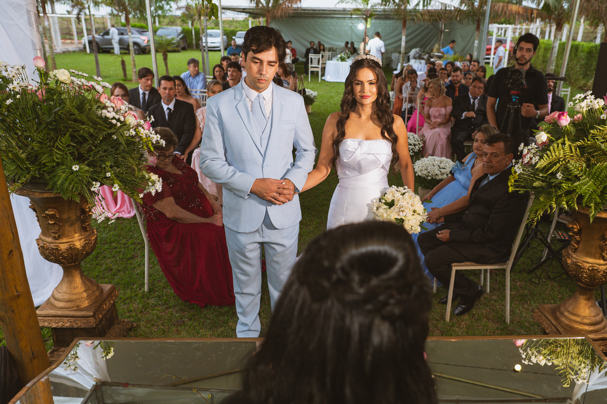 Eles caminharam juntos rumo ao altar, para a celebração do seu matrimônio. A celebrante os recebeu carinhosamente os saudando com muita alegria. Ela trouxe uma reflexão linda que envolveu os dois, os fazendo virar para seus convidados e ver um por um. Depois, pediu para que eles olhassem para seus pais e também lembrassem daqueles que se foram e que gostariam muito de estar ali. Posteriormente, ela realizou os proclames de casamento e questionou os dois acerca da sua espontânea vontade de se casar um com o outro. O sim foi instantâneo. Agora, era hora de trocar as alianças e as juras de amor para sempre. Quando pensávamos que a emoção havia passado, chegara a hora dos votos.