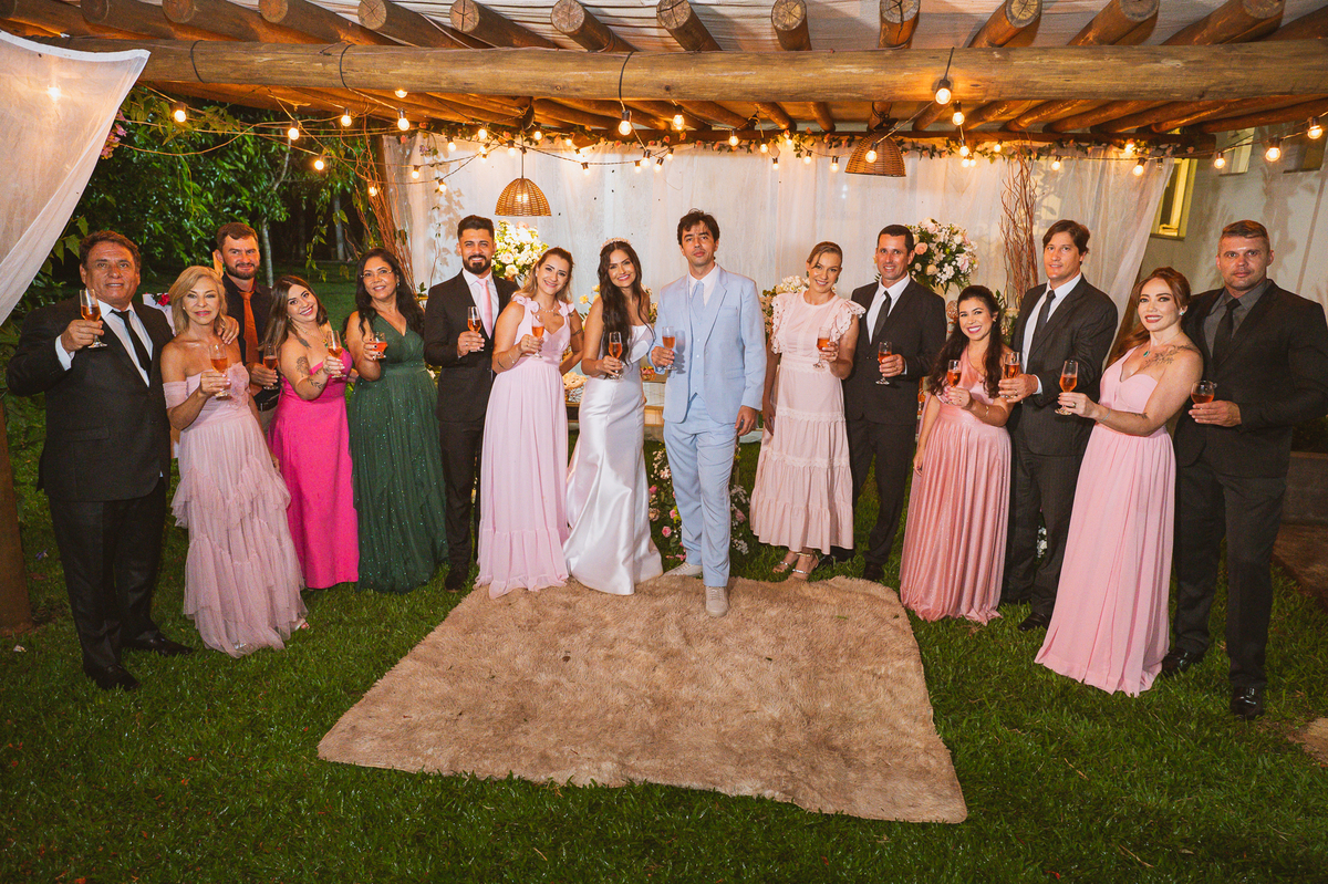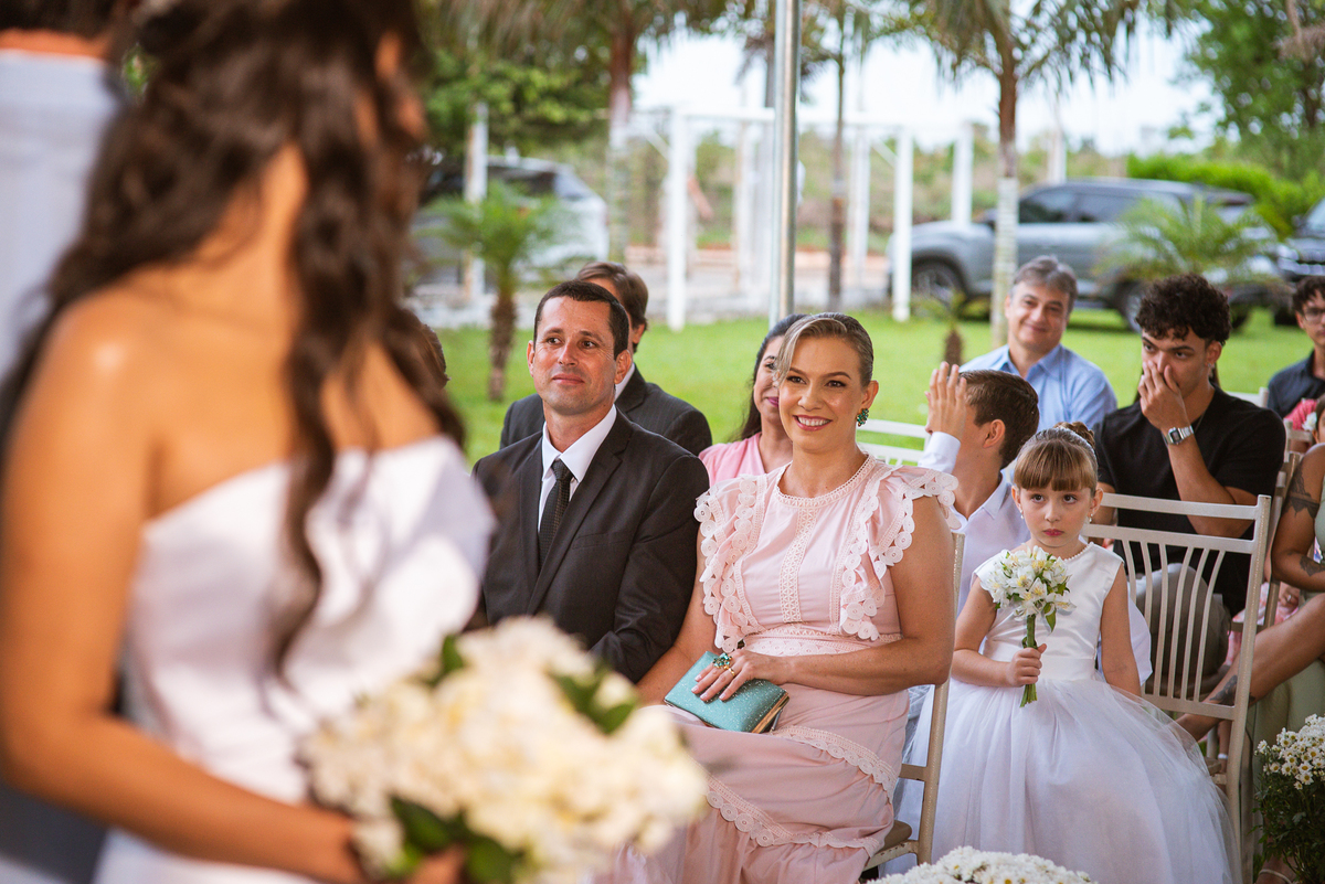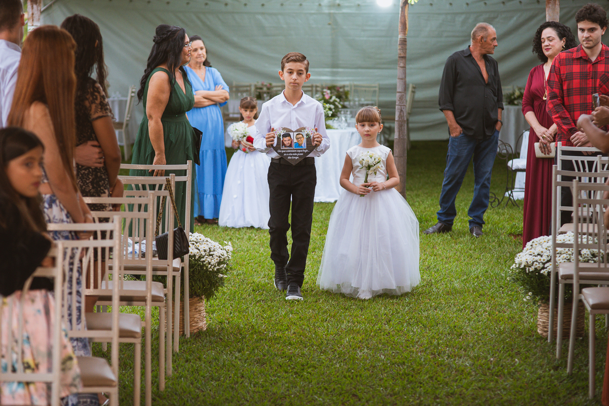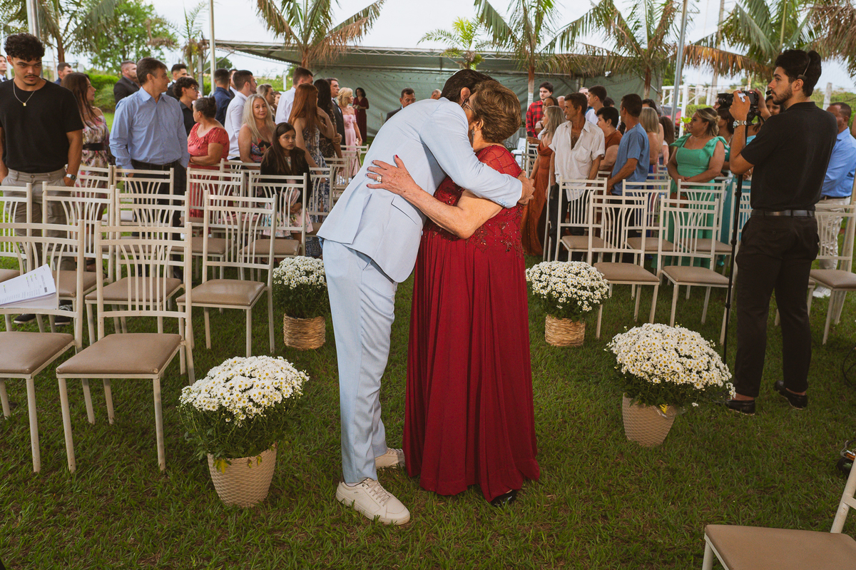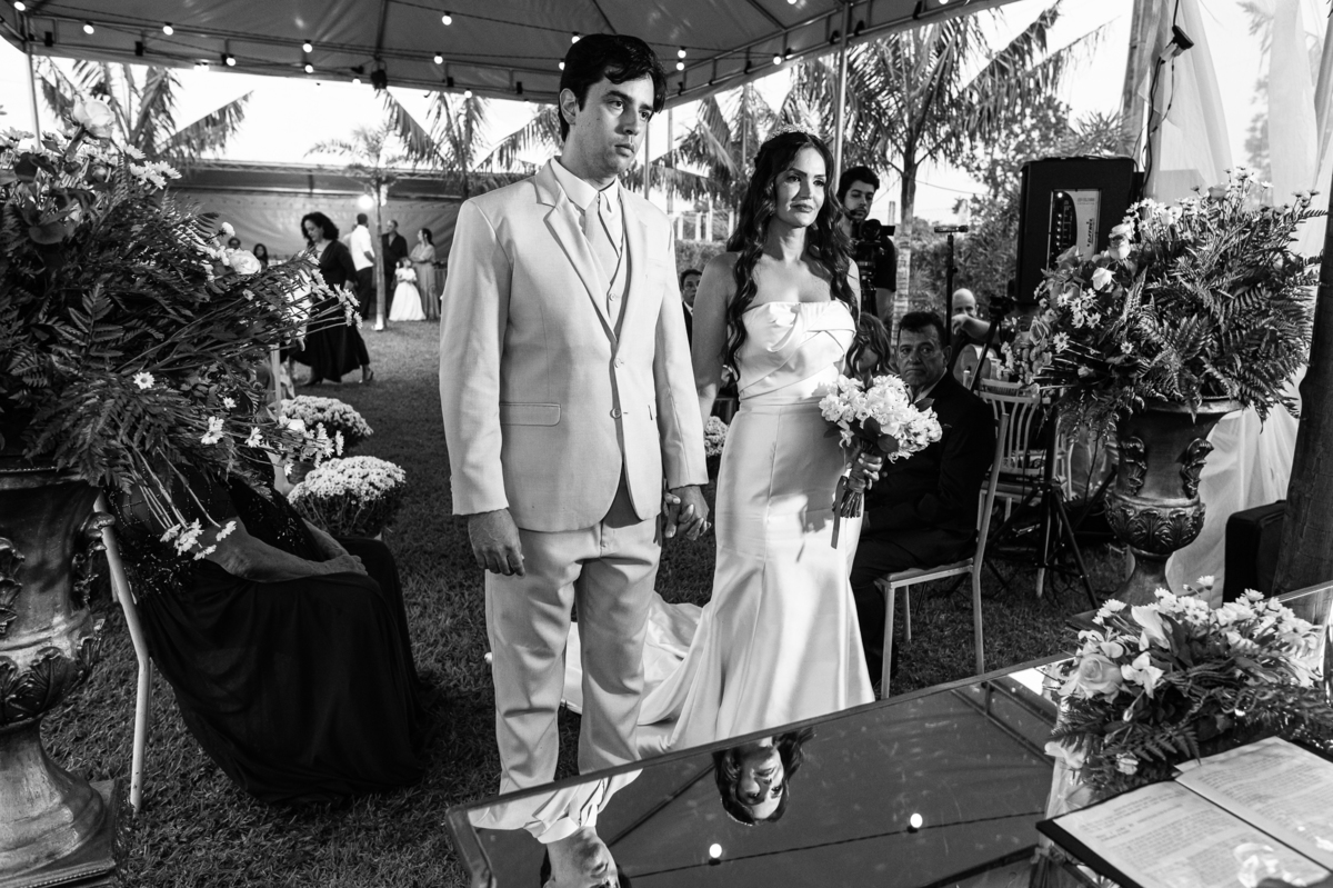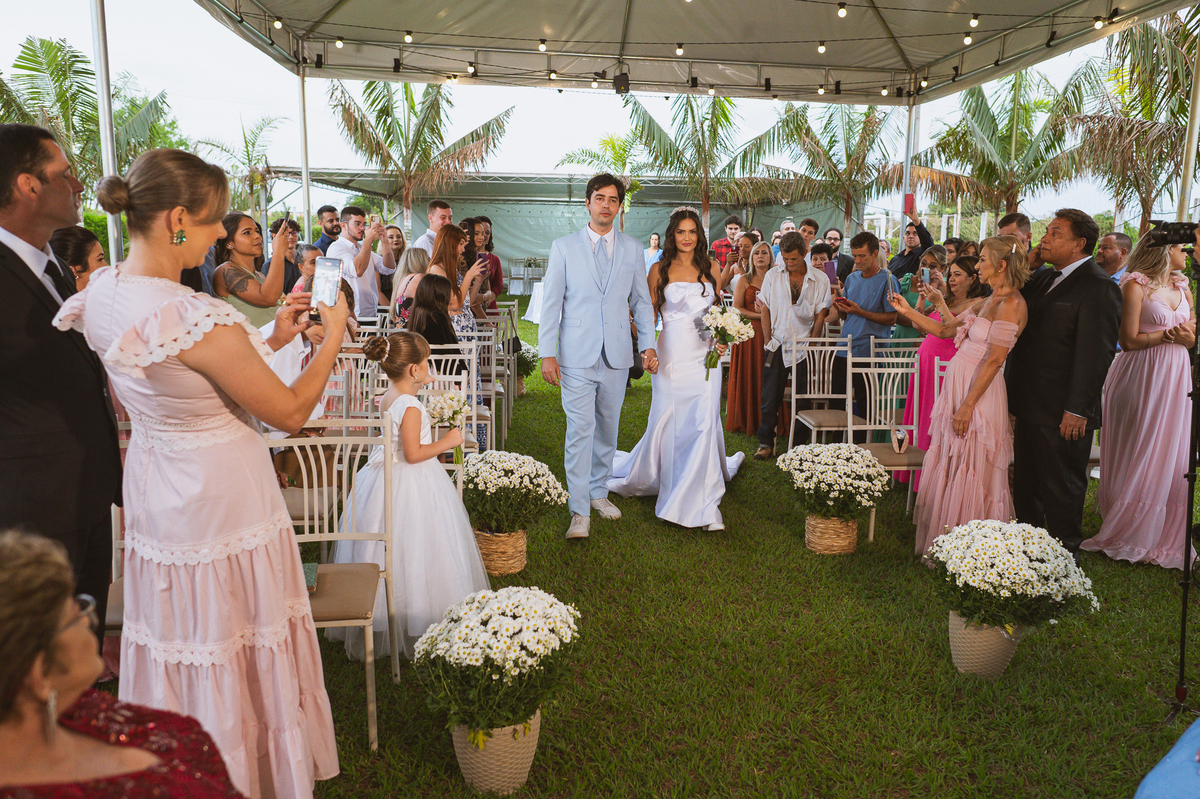 Eles caminharam juntos rumo ao altar, para a celebração do seu matrimônio. A celebrante os recebeu carinhosamente os saudando com muita alegria. Ela trouxe uma reflexão linda que envolveu os dois, os fazendo virar para seus convidados e ver um por um. Depois, pediu para que eles olhassem para seus pais e também lembrassem daqueles que se foram e que gostariam muito de estar ali. Posteriormente, ela realizou os proclames de casamento e questionou os dois acerca da sua espontânea vontade de se casar um com o outro. O sim foi instantâneo. Agora, era hora de trocar as alianças e as juras de amor para sempre. Quando pensávamos que a emoção havia passado, chegara a hora dos votos.