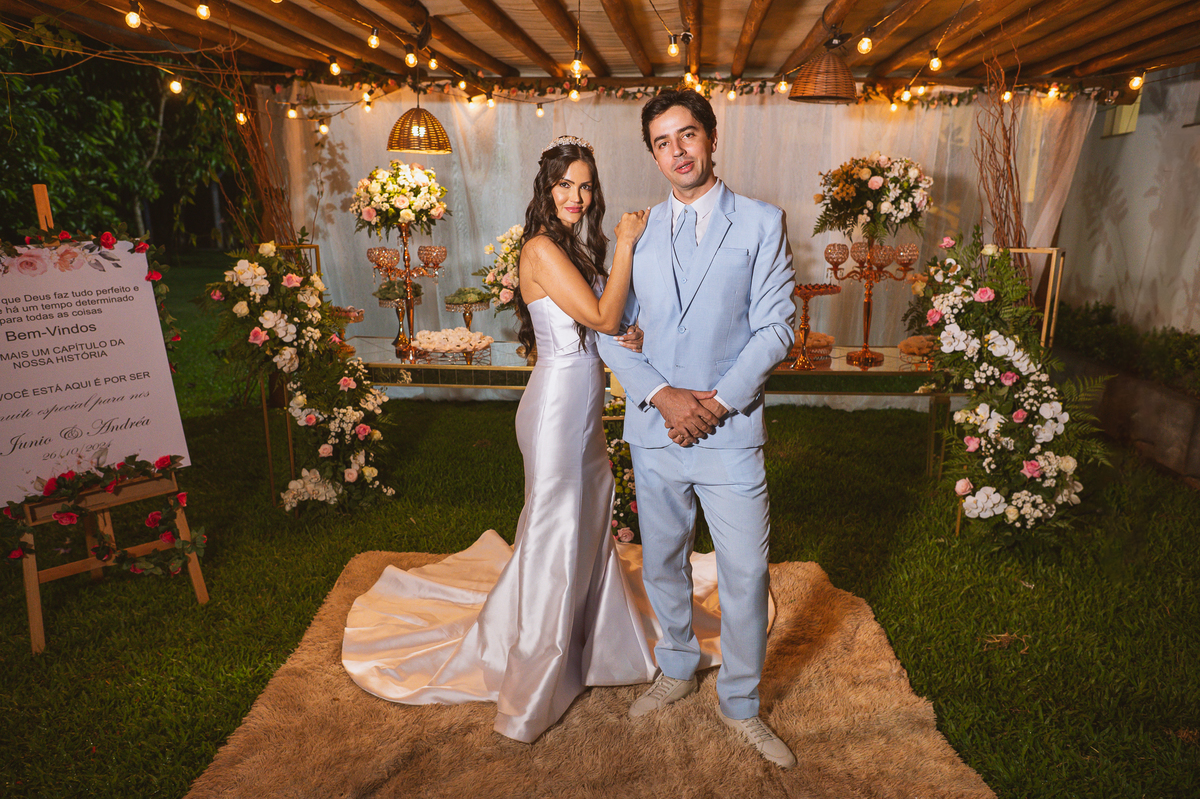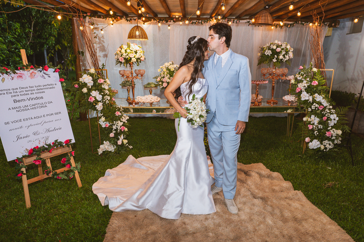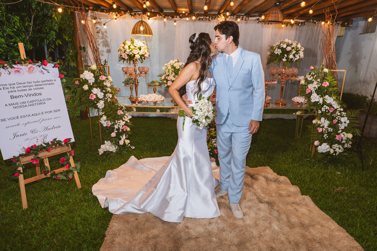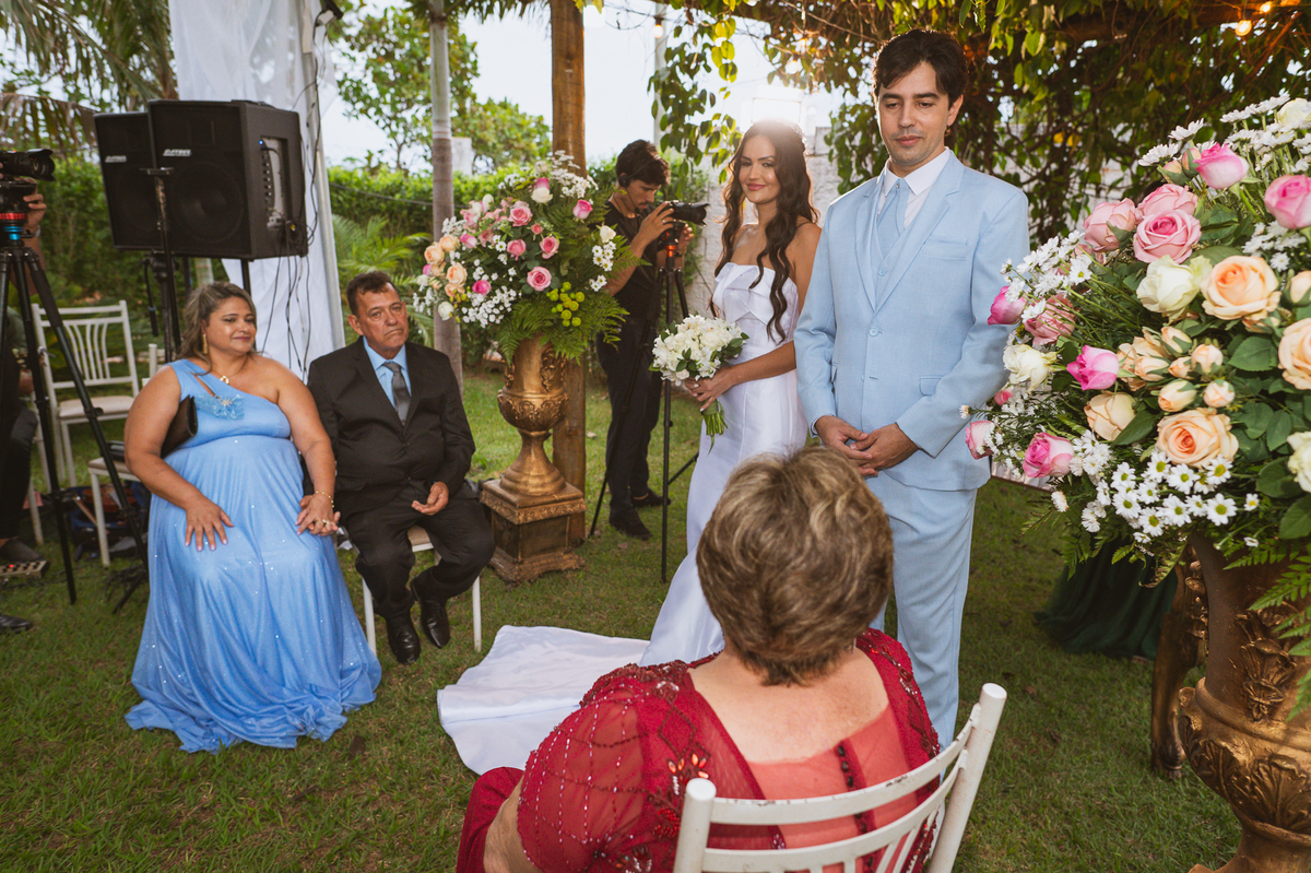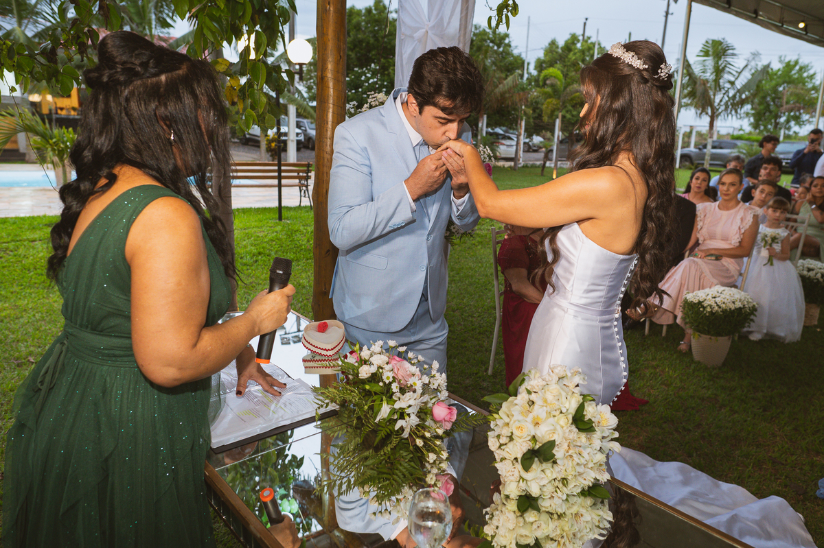 Cada um dos dois pegou seu papel e começou a contar parte da história linda dos dois. Cada detalhe emocionava todos os presentes e também quem recebia a declaração. Junio começou e posteriormente Andréa fez sua declaração. Bastante emocionada, ela contou sobre como gosta do jeitinho de Junio e sobre como seu cuidado com ela a fez ter certeza de que ele era a pessoa certa para passar o resto de sua vida junto. Por fim, uma oração e votos de felicidades de todos para os recém-casados. Fizemos as fotografias de praxe com os padrinhos e encerramos a cerimônia. Na saída, bastante animação e um beijo de cinema quase que de surpresa, dado pelos dois em comemoração.