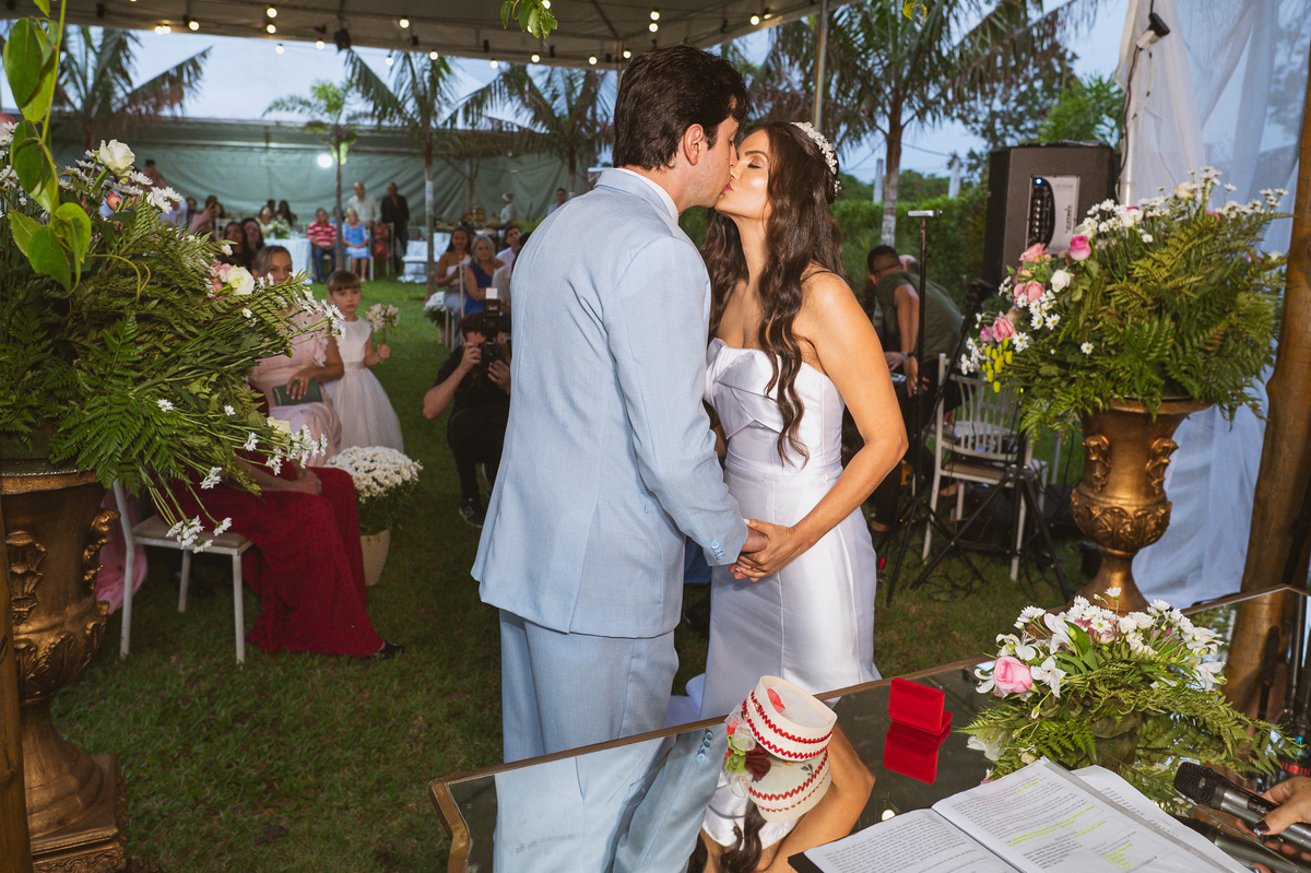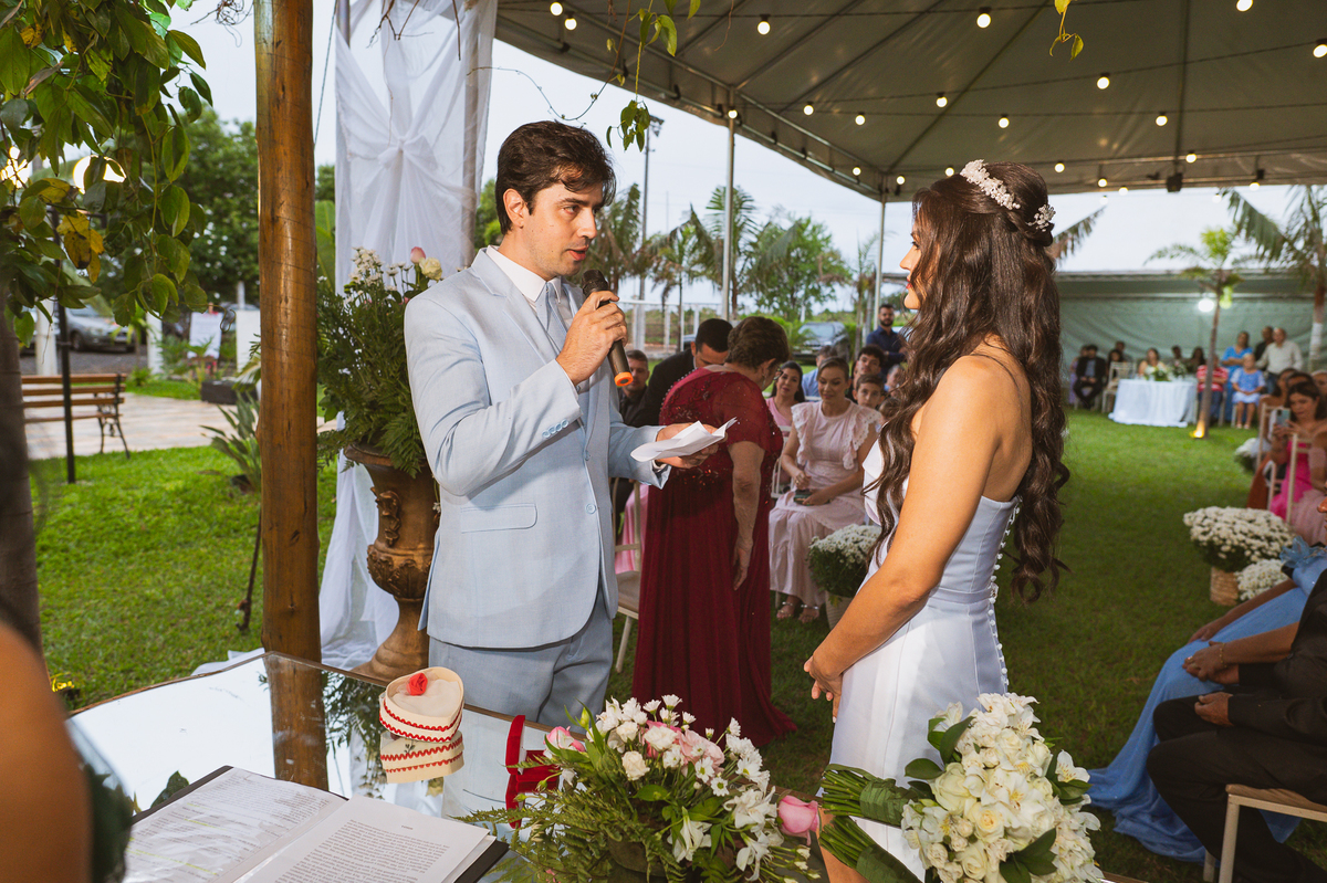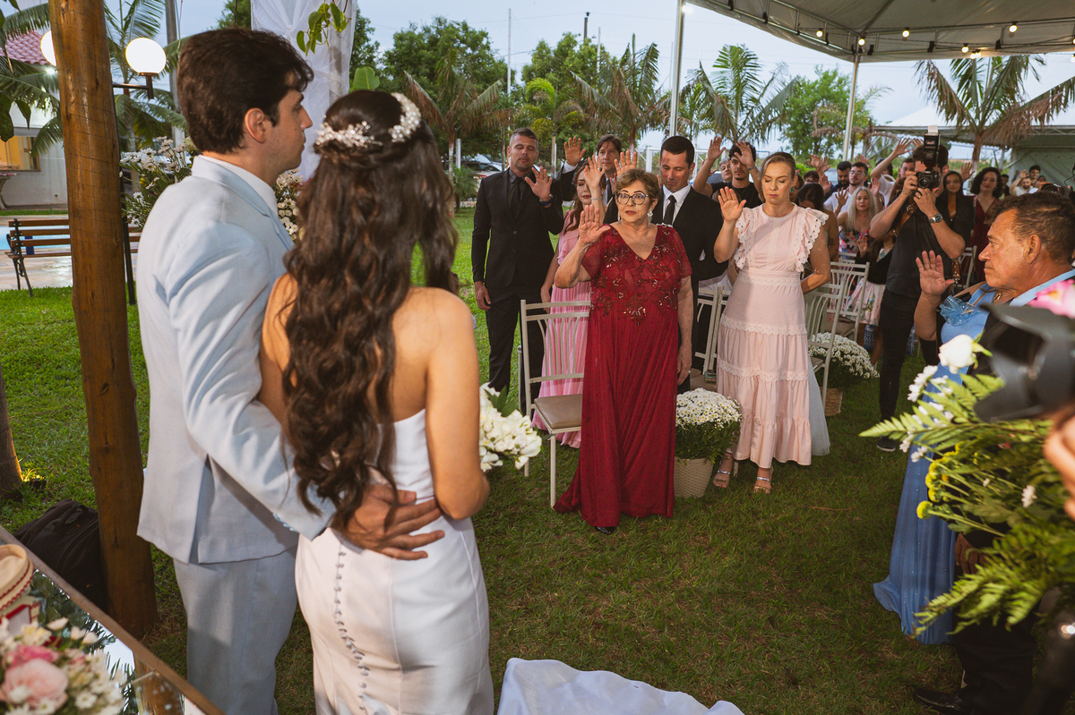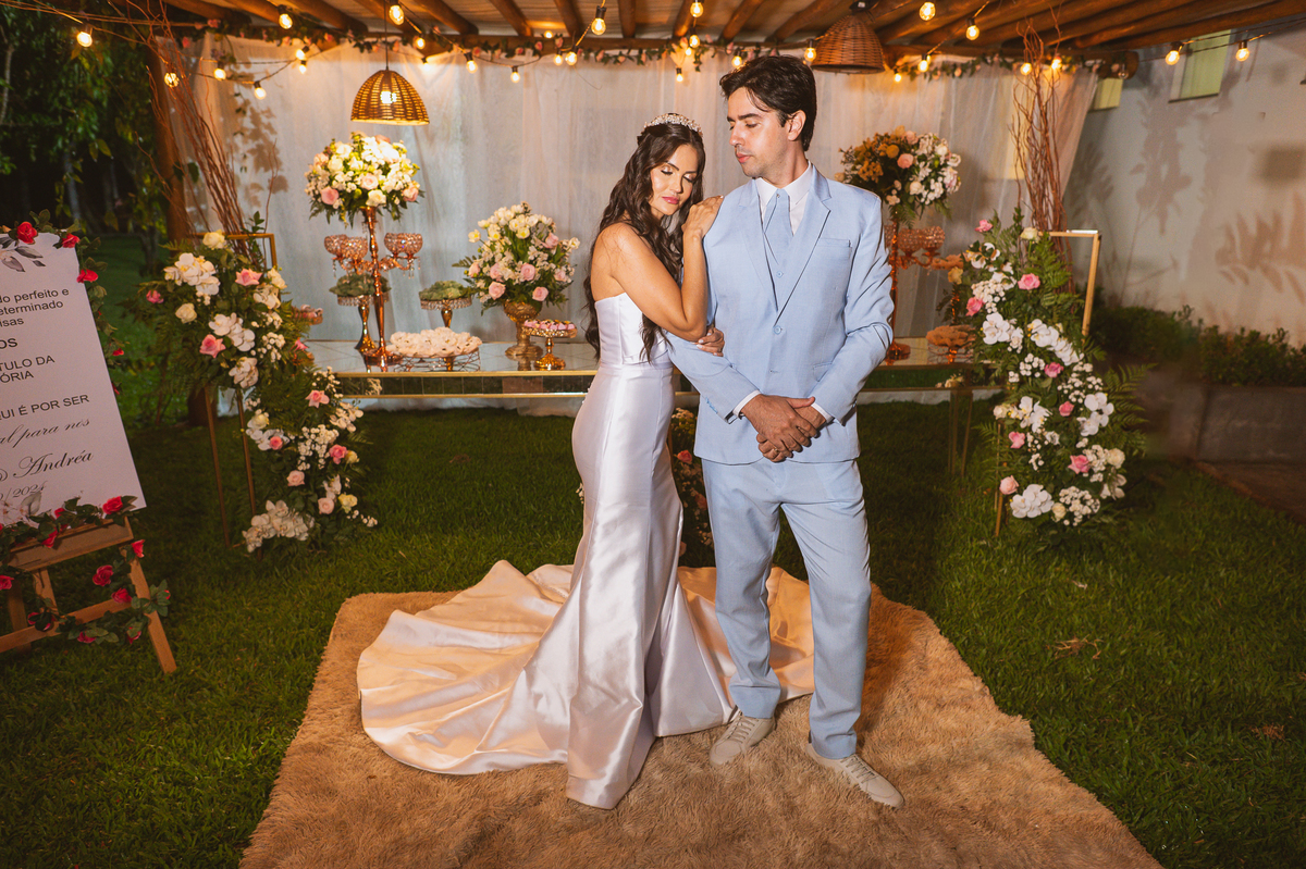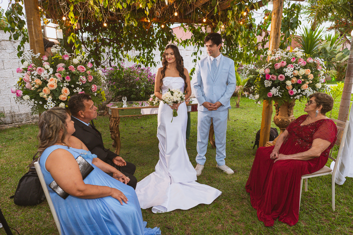 Cada um dos dois pegou seu papel e começou a contar parte da história linda dos dois. Cada detalhe emocionava todos os presentes e também quem recebia a declaração. Junio começou e posteriormente Andréa fez sua declaração. Bastante emocionada, ela contou sobre como gosta do jeitinho de Junio e sobre como seu cuidado com ela a fez ter certeza de que ele era a pessoa certa para passar o resto de sua vida junto. Por fim, uma oração e votos de felicidades de todos para os recém-casados. Fizemos as fotografias de praxe com os padrinhos e encerramos a cerimônia. Na saída, bastante animação e um beijo de cinema quase que de surpresa, dado pelos dois em comemoração.