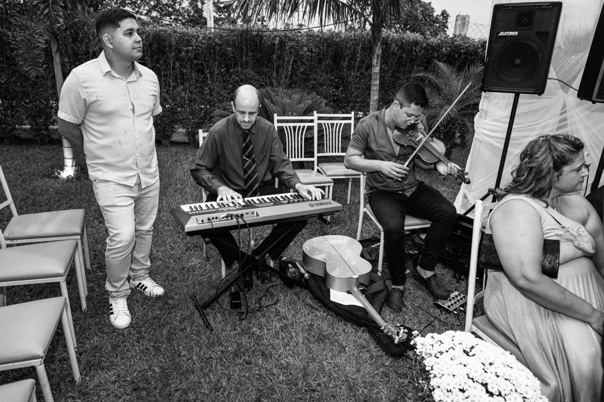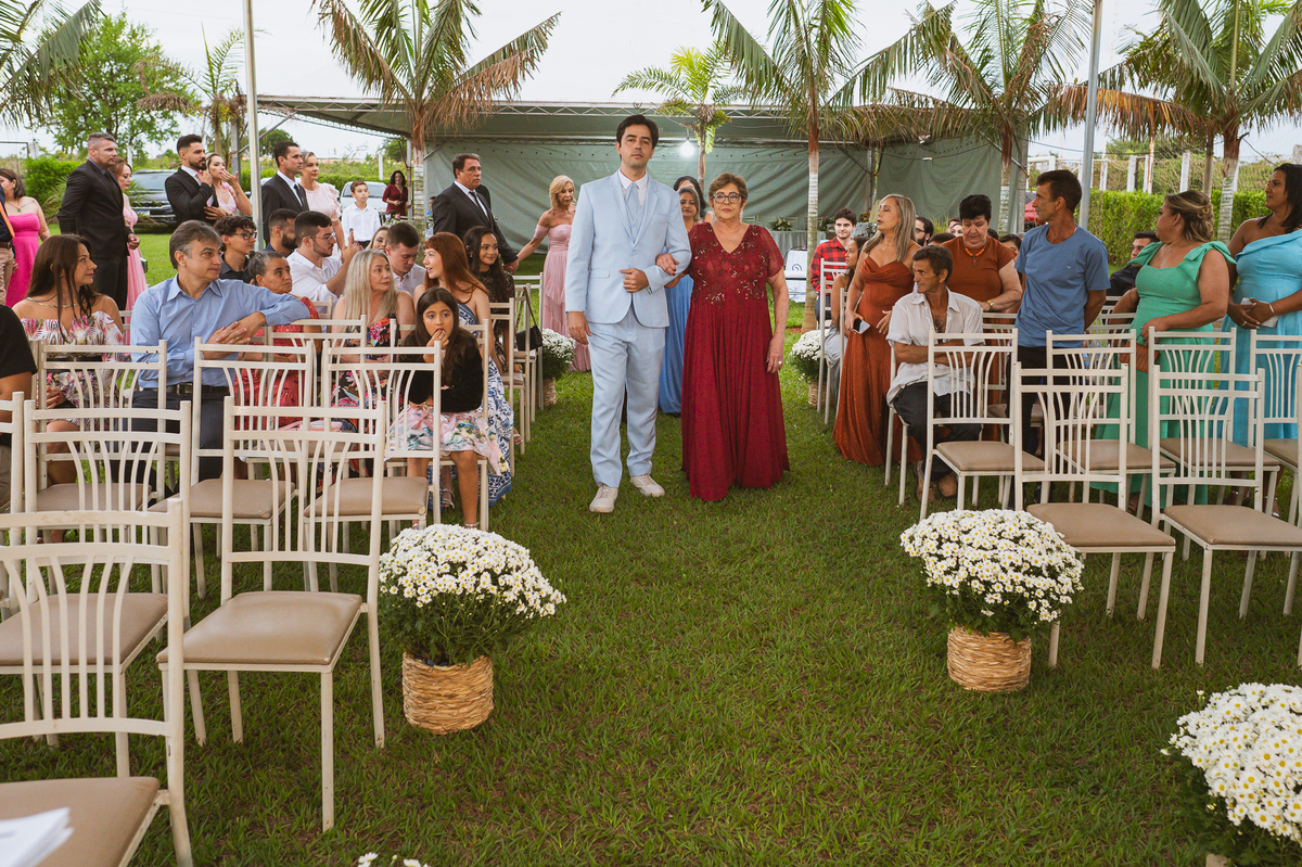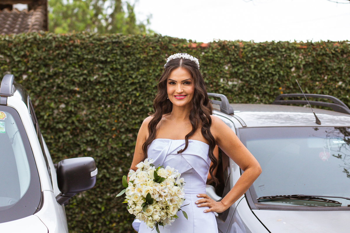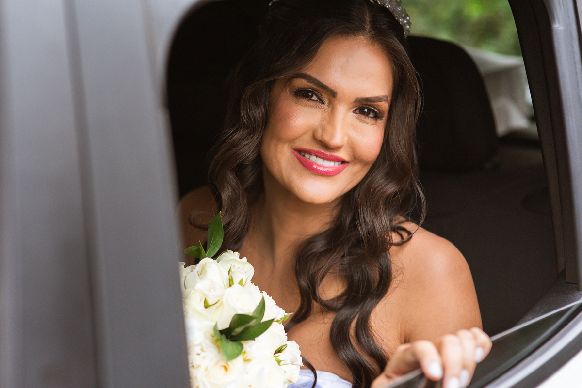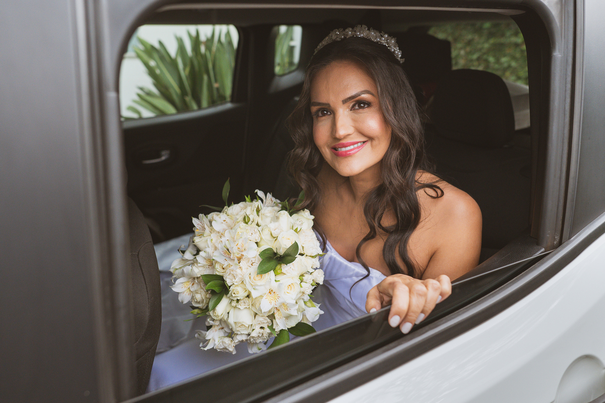 Voltando ao casamento (2º né), fizemos as fotos da noiva no carro e ela também estava muito feliz. O sorriso sincero explicitava todo amor que ela sente por Junio. E foram muito sorrisos! Encerramos as fotos no carro e a cerimônia começou. Junio entrou de braços dados com sua mãe, com muito carinho. Despediu-se dela em frente ao altar com um respeito abraço de gratidão. Agora, ele estava ali sozinho, aguardando o momento mais especial do casamento. Os padrinhos já haviam adentrado e também aguardavam a noiva.