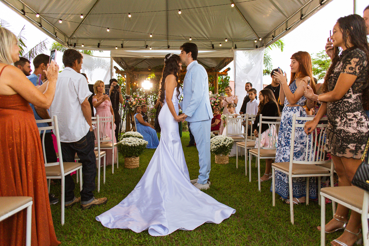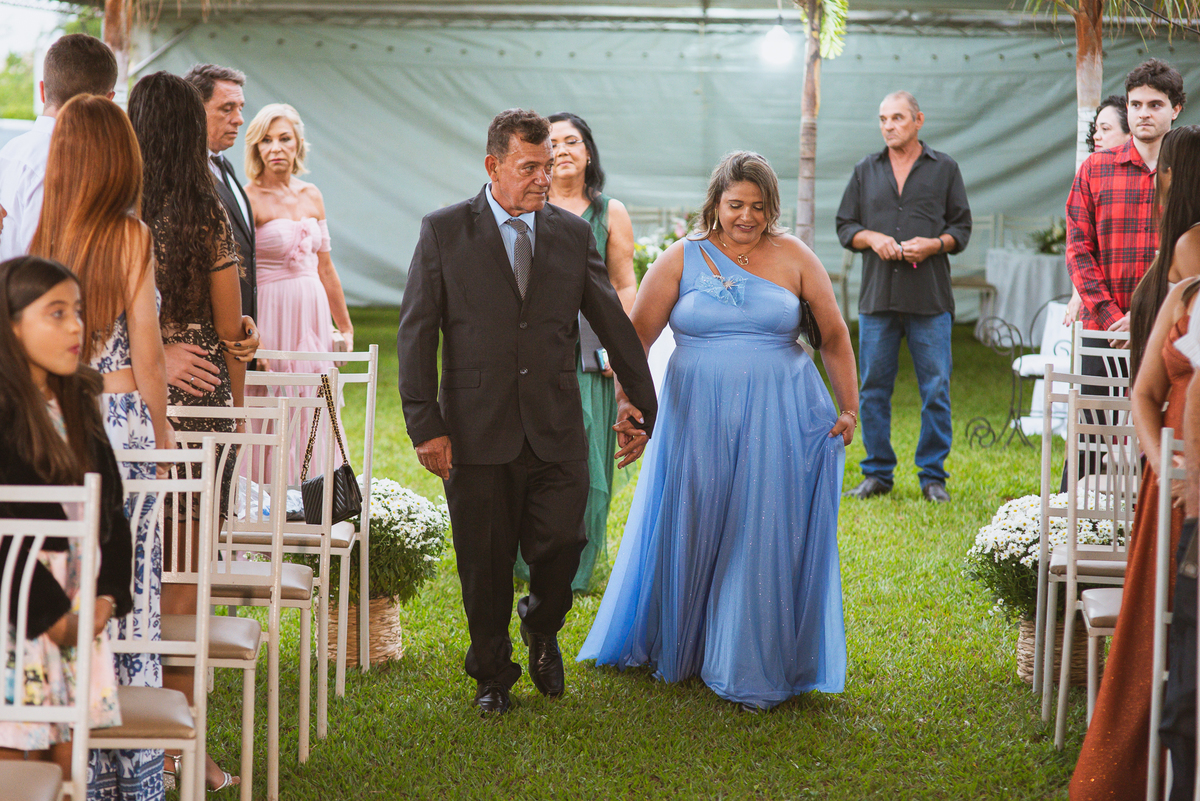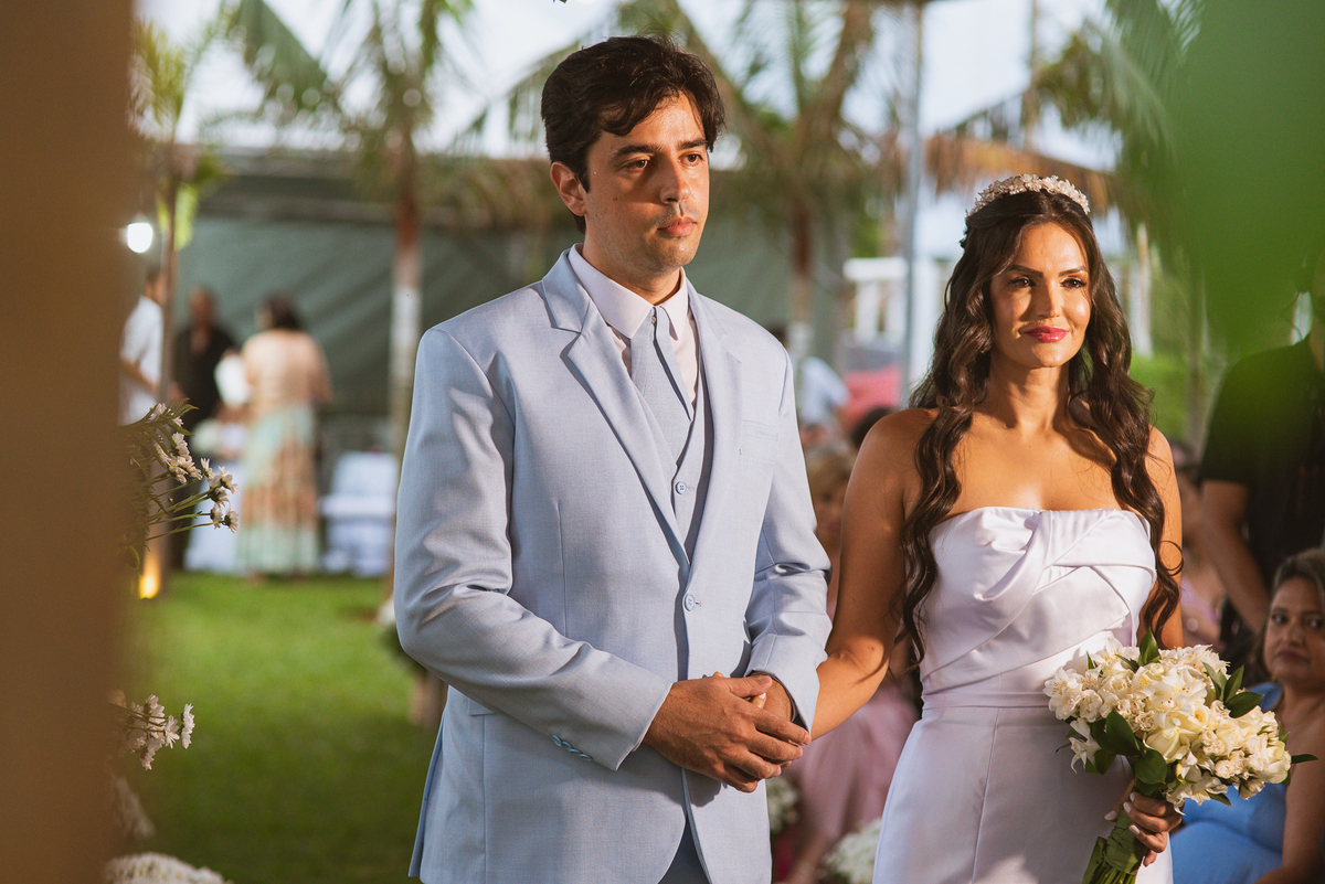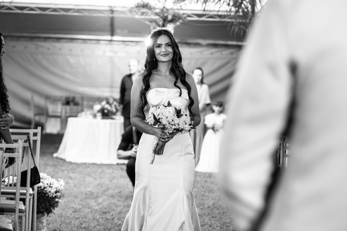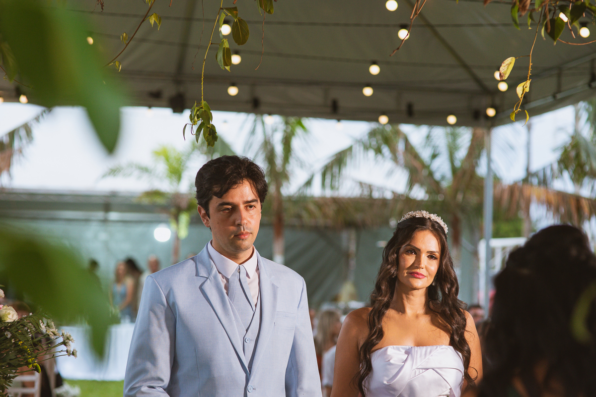 Solicitaram ao noivo que ficasse de costas, para que a surpresa fosse ainda mais positiva. Andréa veio caminhando e todos os olhares se voltaram pra onde ela estava. A marcha nupcial ia sendo tocada ao passo que ela vinha em direção ao noivo. Chegando no corredor, Junio virou-se e viu sua noiva, belíssima e cheia de amor por ele, o esperando na entrada da tenda. Só mais alguns passos para que enfim eles oficializassem sua união perante todos. Andréa caminhou vagarosamente, como se desfilasse toda a exuberância de seu vestido. No findar dos passos, Junio esperava ansiosamente pelo encontro. Com um beijo na testa da noiva, ele recebeu e selou aquele momento diante de todos.