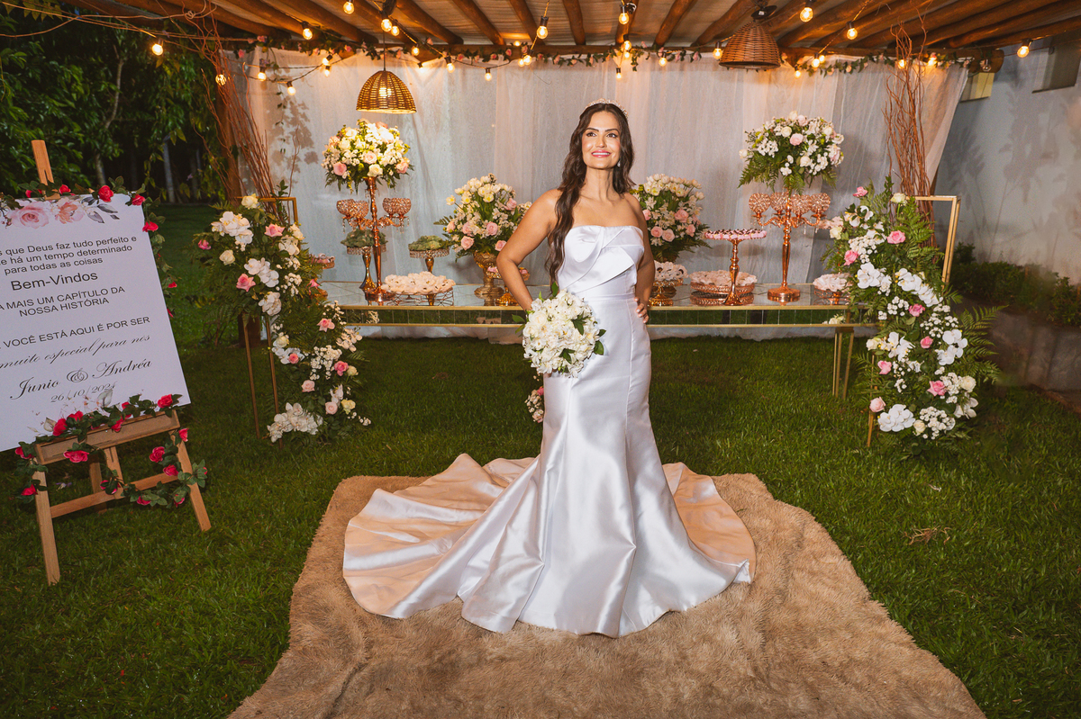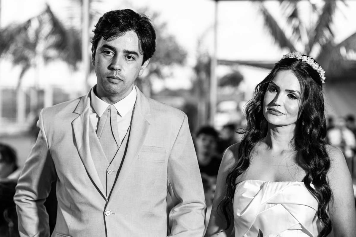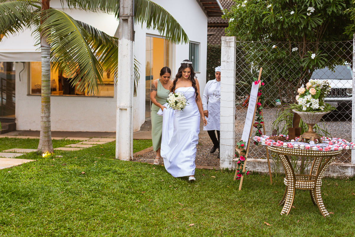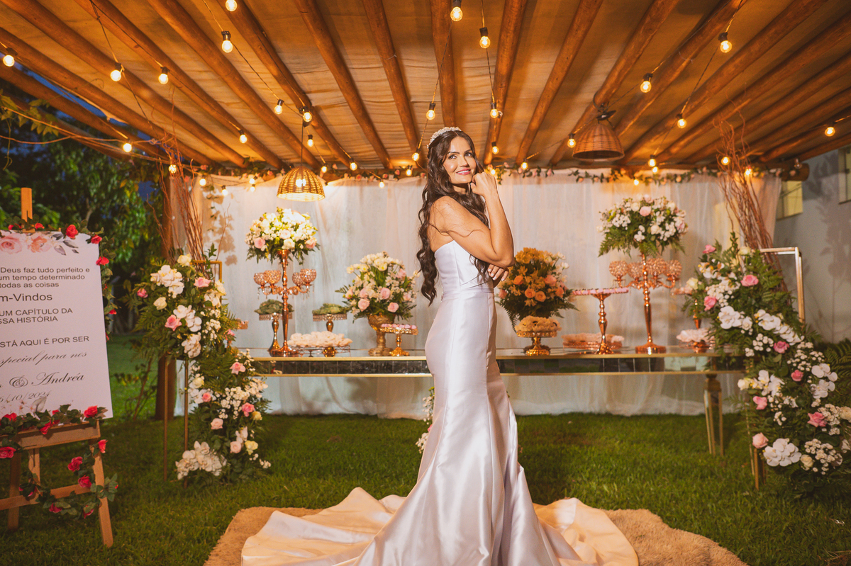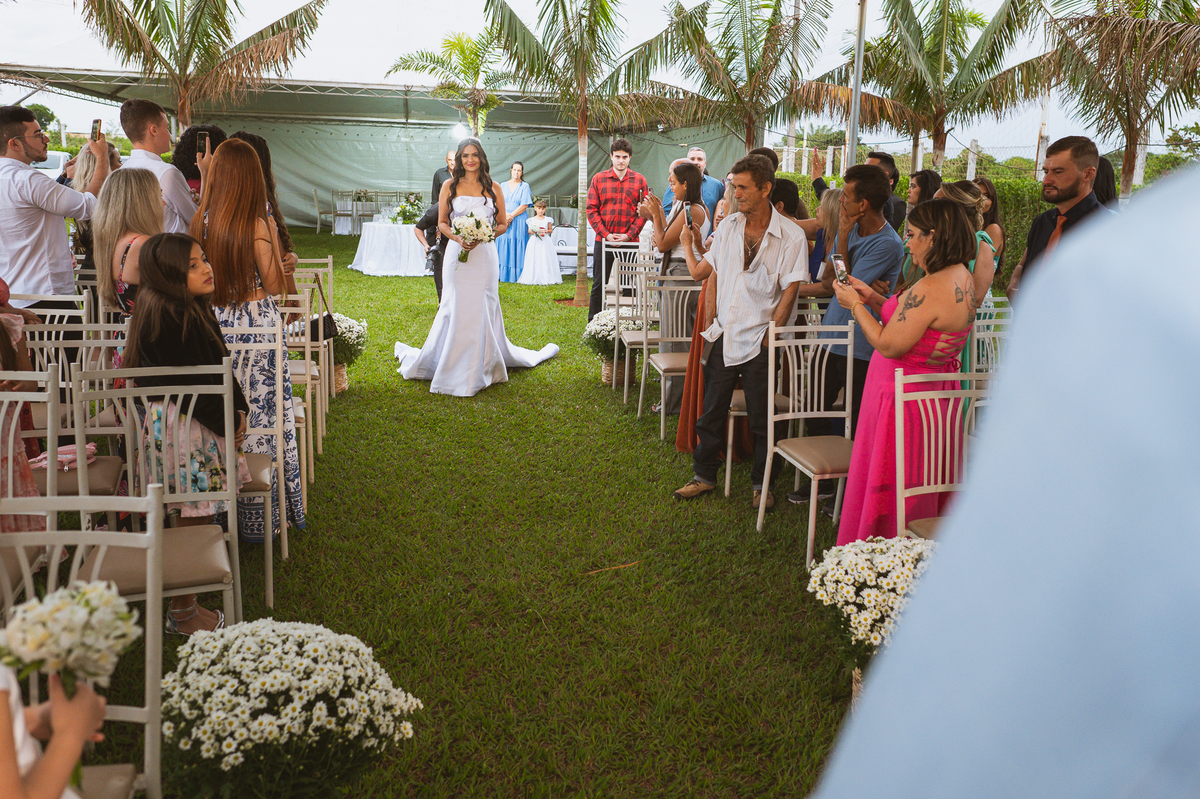 Solicitaram ao noivo que ficasse de costas, para que a surpresa fosse ainda mais positiva. Andréa veio caminhando e todos os olhares se voltaram pra onde ela estava. A marcha nupcial ia sendo tocada ao passo que ela vinha em direção ao noivo. Chegando no corredor, Junio virou-se e viu sua noiva, belíssima e cheia de amor por ele, o esperando na entrada da tenda. Só mais alguns passos para que enfim eles oficializassem sua união perante todos. Andréa caminhou vagarosamente, como se desfilasse toda a exuberância de seu vestido. No findar dos passos, Junio esperava ansiosamente pelo encontro. Com um beijo na testa da noiva, ele recebeu e selou aquele momento diante de todos.