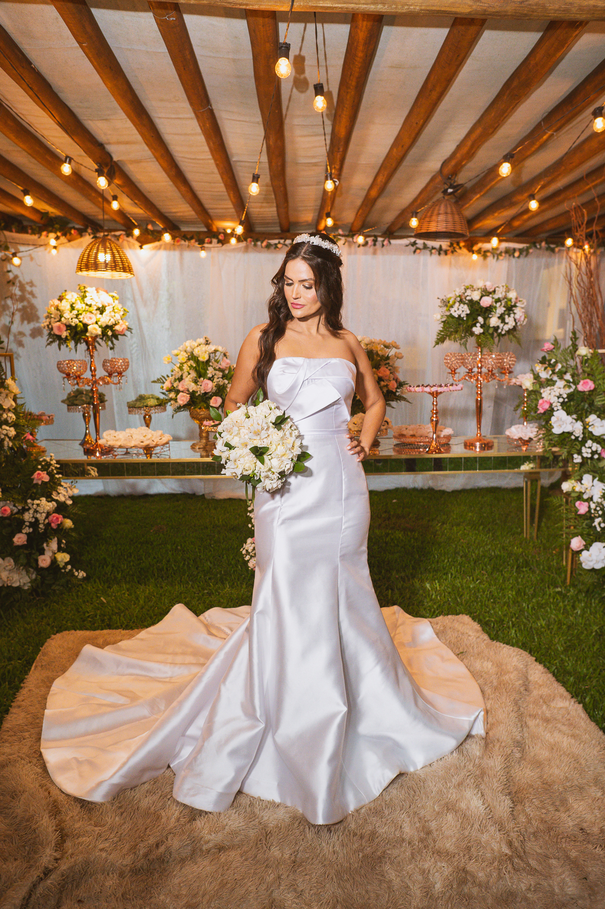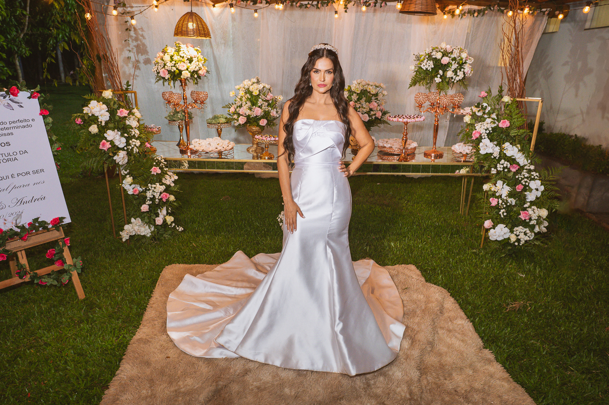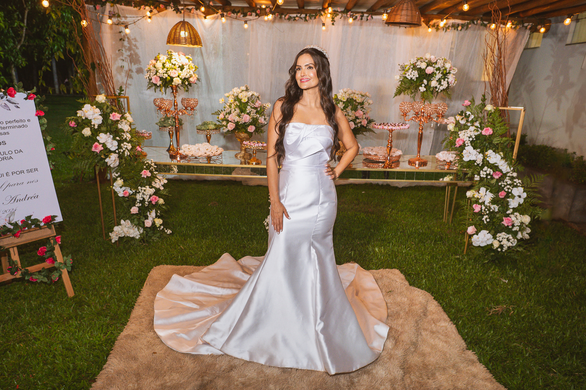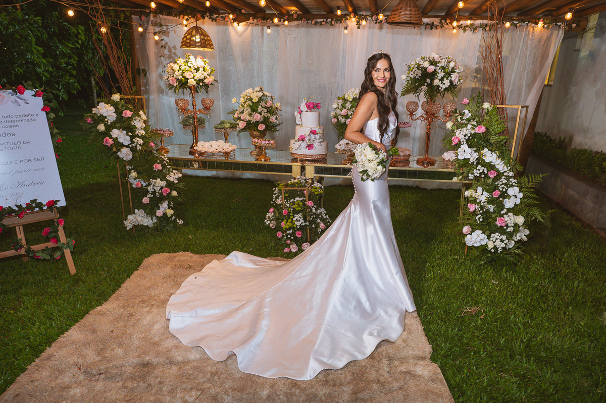 Solicitaram ao noivo que ficasse de costas, para que a surpresa fosse ainda mais positiva. Andréa veio caminhando e todos os olhares se voltaram pra onde ela estava. A marcha nupcial ia sendo tocada ao passo que ela vinha em direção ao noivo. Chegando no corredor, Junio virou-se e viu sua noiva, belíssima e cheia de amor por ele, o esperando na entrada da tenda. Só mais alguns passos para que enfim eles oficializassem sua união perante todos. Andréa caminhou vagarosamente, como se desfilasse toda a exuberância de seu vestido. No findar dos passos, Junio esperava ansiosamente pelo encontro. Com um beijo na testa da noiva, ele recebeu e selou aquele momento diante de todos.