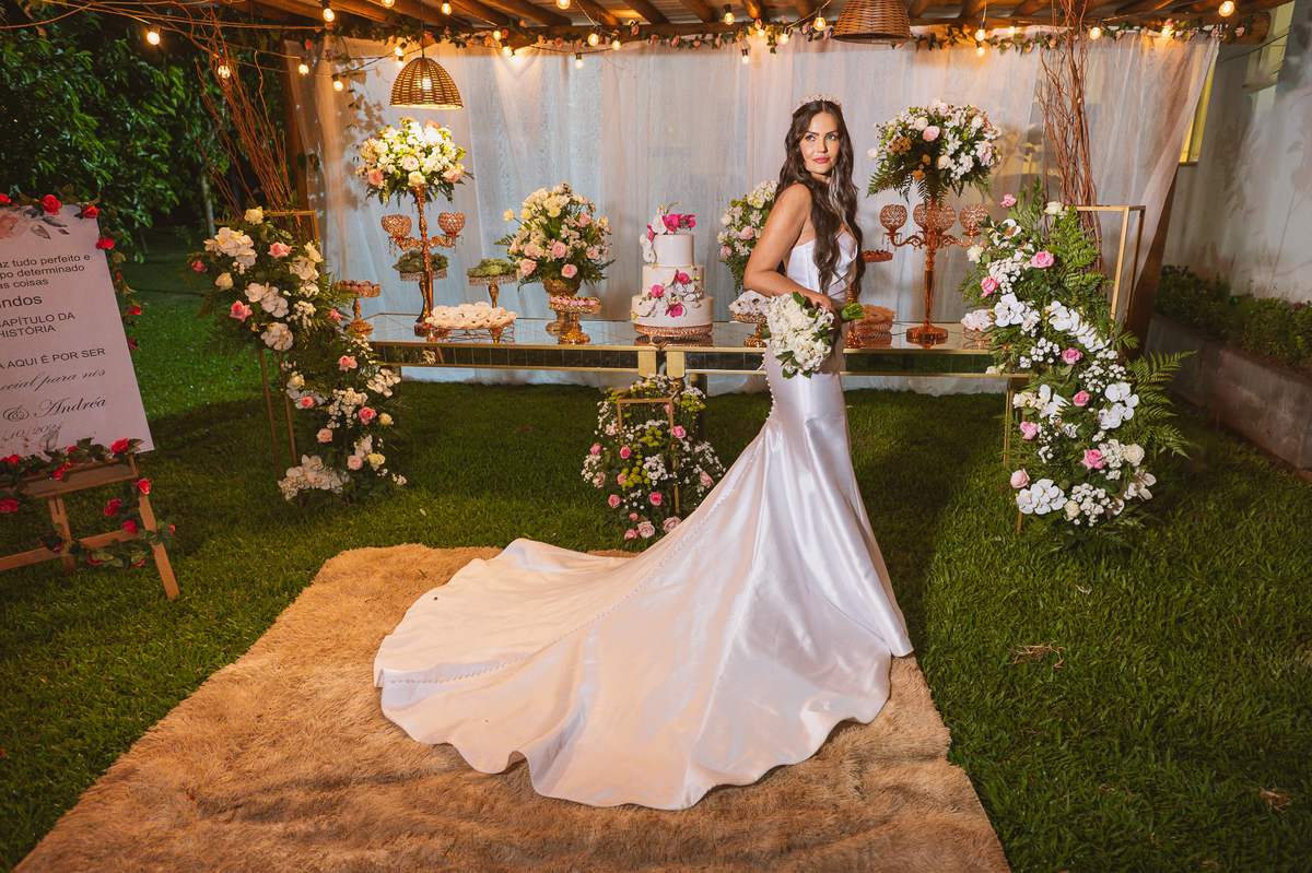 Hoje estamos com a difícil tarefa de contar tudo o que aconteceu nesse casamento lindo de Andréa e Junio. Eles escolheram a chácara São Bento para ser o palco da união deles perante Deus e suas testemunhas. Chegamos no local e vimos uma decoração lindíssima. A mesa do bolo repleta de luzes e muitos docinhos. Como estava arriscando chover, por debaixo das tendas as cadeiras todas posicionadas aguardando seus respectivos donos. Pessoal da cozinha estava a todo vapor finalizando os últimos detalhes. Junio chegou poucos minutos depois e com seu traje impecável aguardava a chegada dos convidados.
