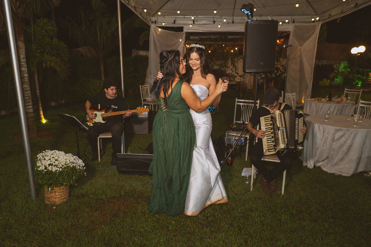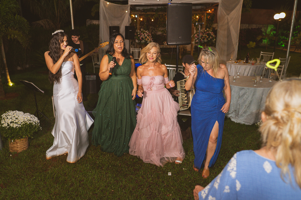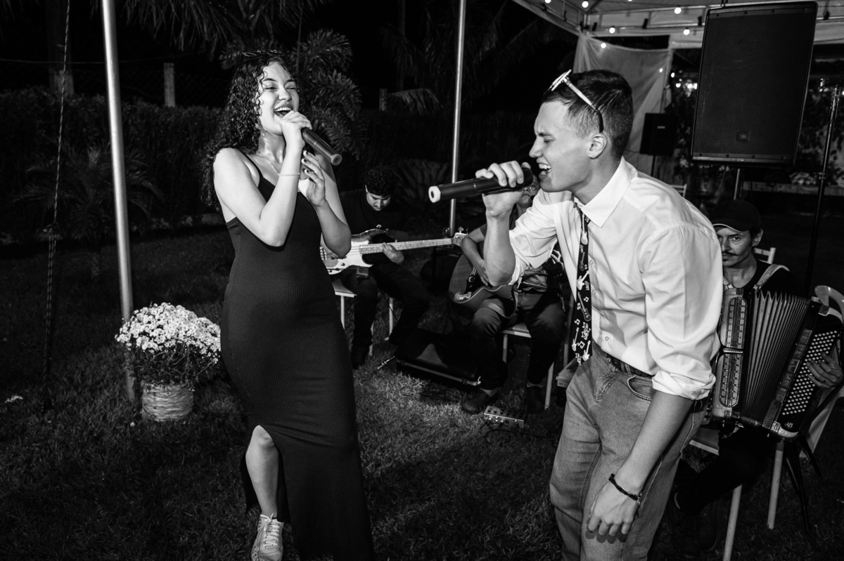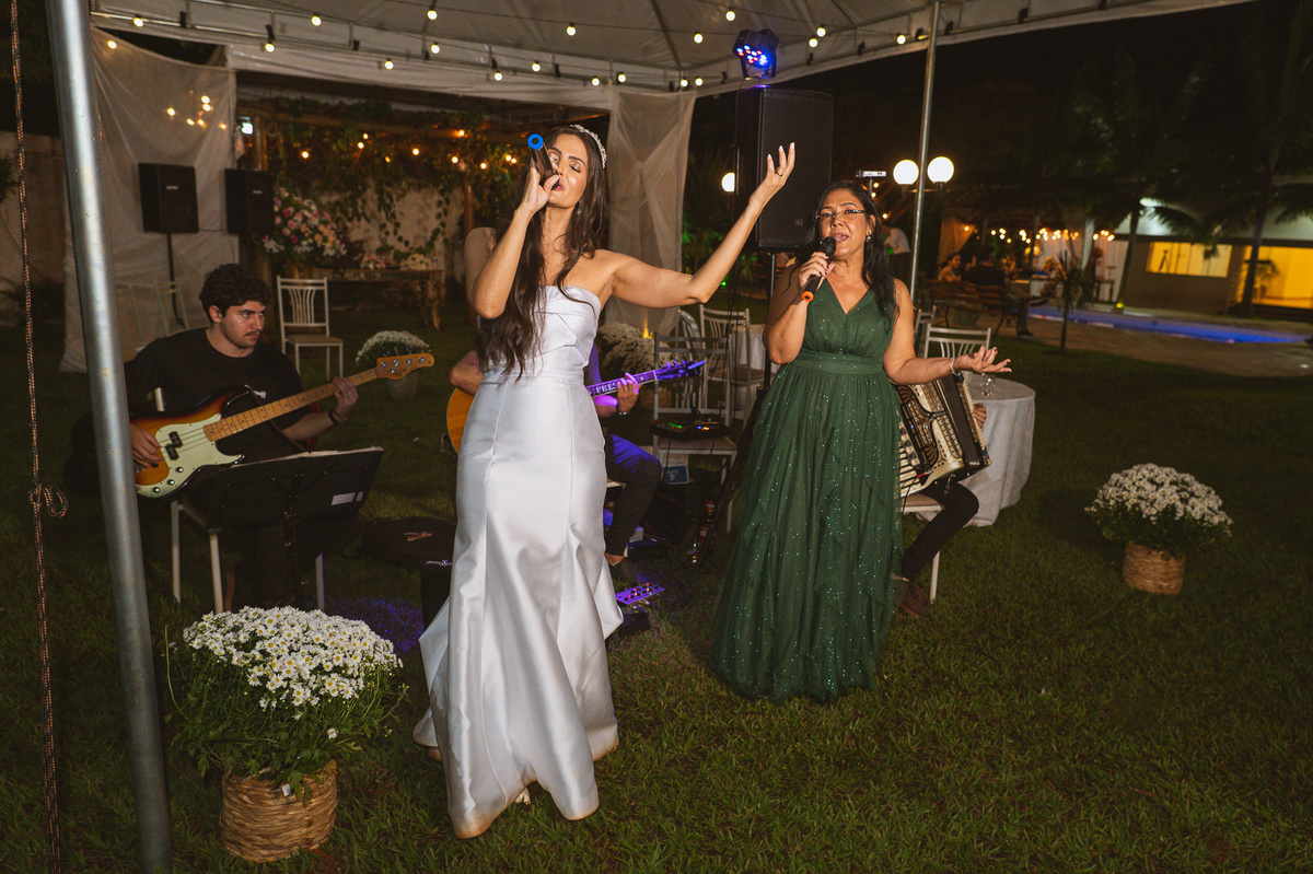 Fomos para a mesa do bolo e juntamente com os padrinhos realizamos o brinde com espumante. Brindaram com seus padrinhos e depois sozinhos. Fizemos um pequeno ensaio dos dois e as fotos ficaram lindas. Enfim, era hora de curtir a noite de festa. Andréa tratou de puxar o microfone e começar a cantar, junto com a celebrante que é sua amiga e colega de canto. Mesmo sem ensaiar, o dueto ficou excelente e animou todos os convidados. Depois, cantaram mais algumas músicas bem conhecidas e deixaram por conta da banda o restante da animação. Andréa e Junio cumprimentaram os seus convidados, passaram a gravata com muita farra e diversão.