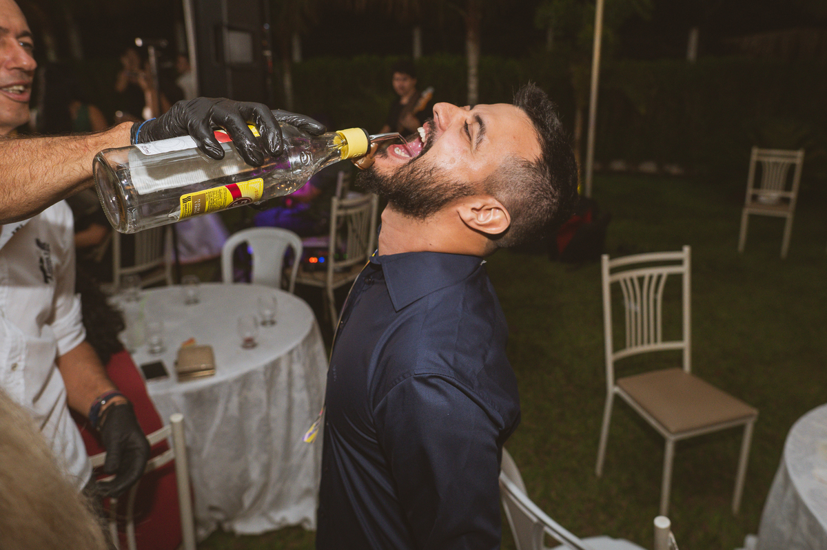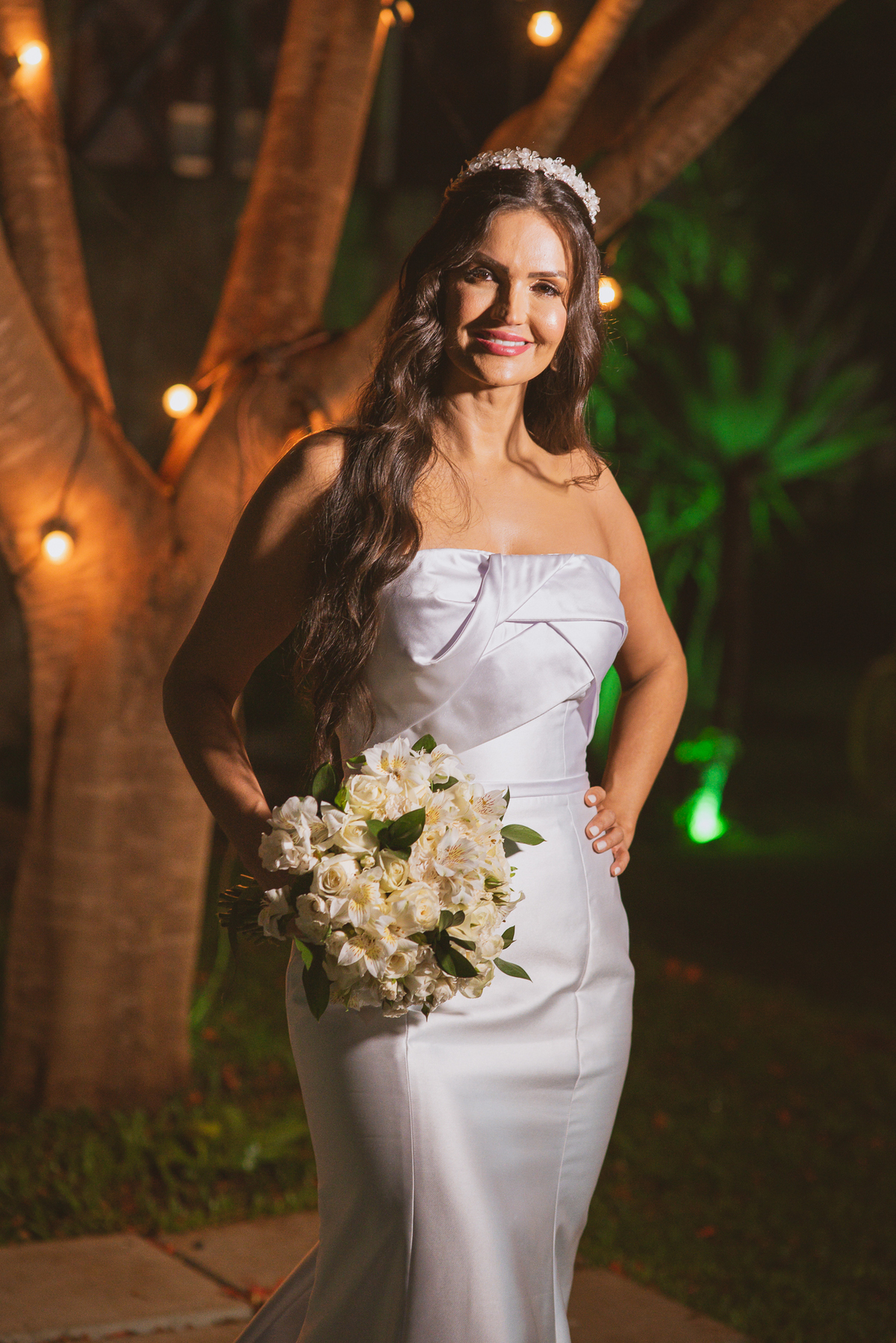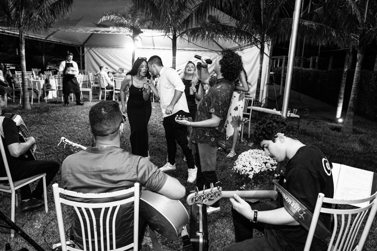 Fomos para a mesa do bolo e juntamente com os padrinhos realizamos o brinde com espumante. Brindaram com seus padrinhos e depois sozinhos. Fizemos um pequeno ensaio dos dois e as fotos ficaram lindas. Enfim, era hora de curtir a noite de festa. Andréa tratou de puxar o microfone e começar a cantar, junto com a celebrante que é sua amiga e colega de canto. Mesmo sem ensaiar, o dueto ficou excelente e animou todos os convidados. Depois, cantaram mais algumas músicas bem conhecidas e deixaram por conta da banda o restante da animação. Andréa e Junio cumprimentaram os seus convidados, passaram a gravata com muita farra e diversão.