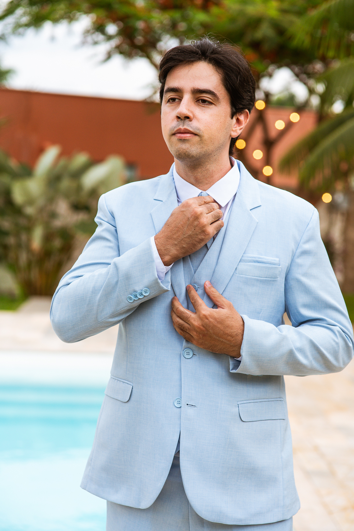 Os carros foram chegando e os convidados aparecendo pouco a pouco. Conforme iam chegando, foram se alocando em seus respectivos lugares. A mesa com o buffet estava prontinha. Fizemos algumas fotografias do noivo ajustando seu traje e esbanjando felicidade. Cabe comentar aqui sobre o que a noiva me disse. Ela me contou que esse seria o segundo casamento dela. Num primeiro momento eu pensei, mas porquê ela falou isso agora? Quando ela complementou: Com o mesmo noivo! Foi ai que eu caí na gargalhada! Ela me explicou que os dois casaram e depois por alguns motivos eles se separaram e durante a Pandemia, eles resolveram reatar o "namoro, noivado, casamento". E deu muito certo. Ali, eles perceberam que não conseguiam vivar mais um longe do outro.