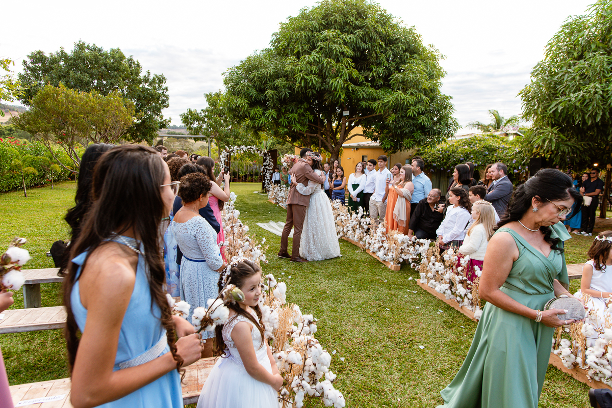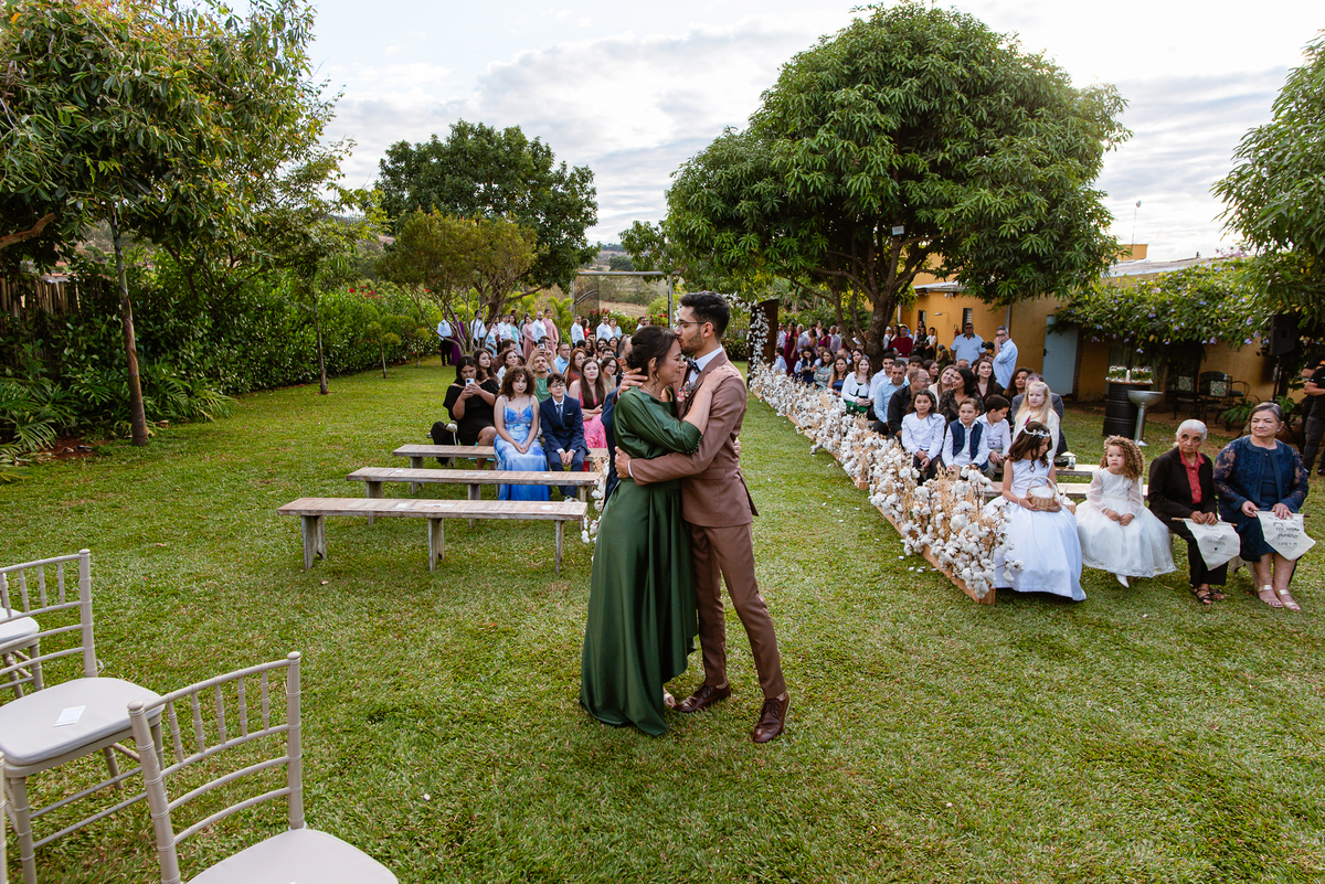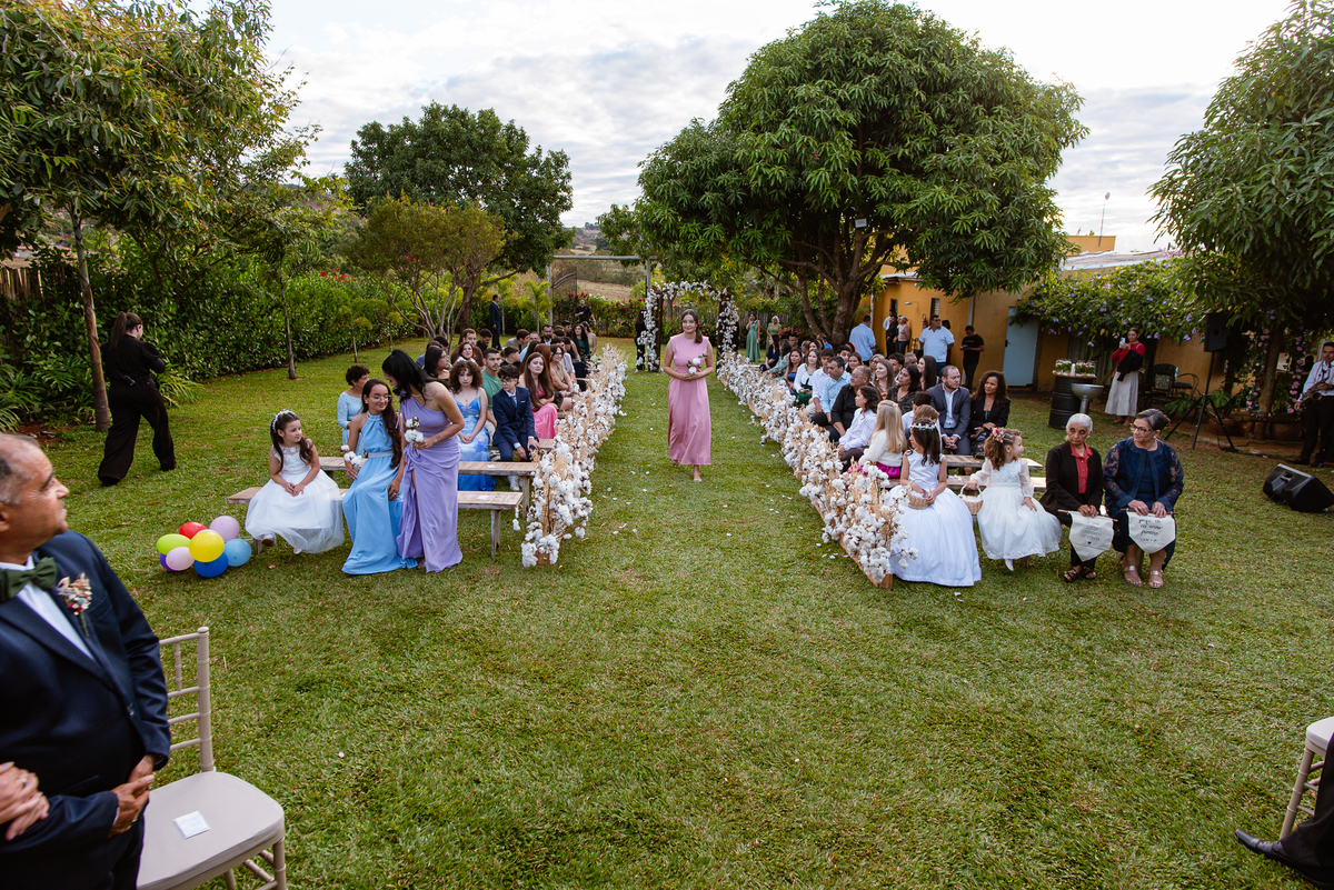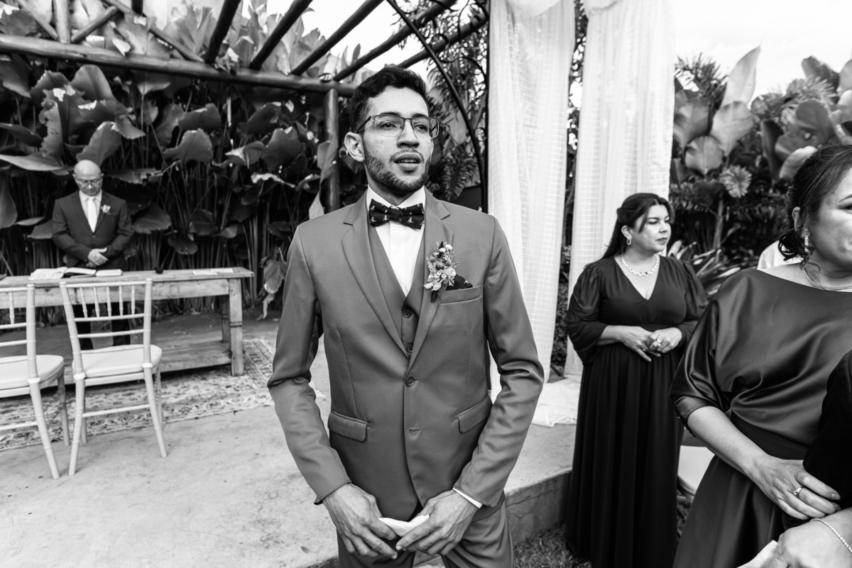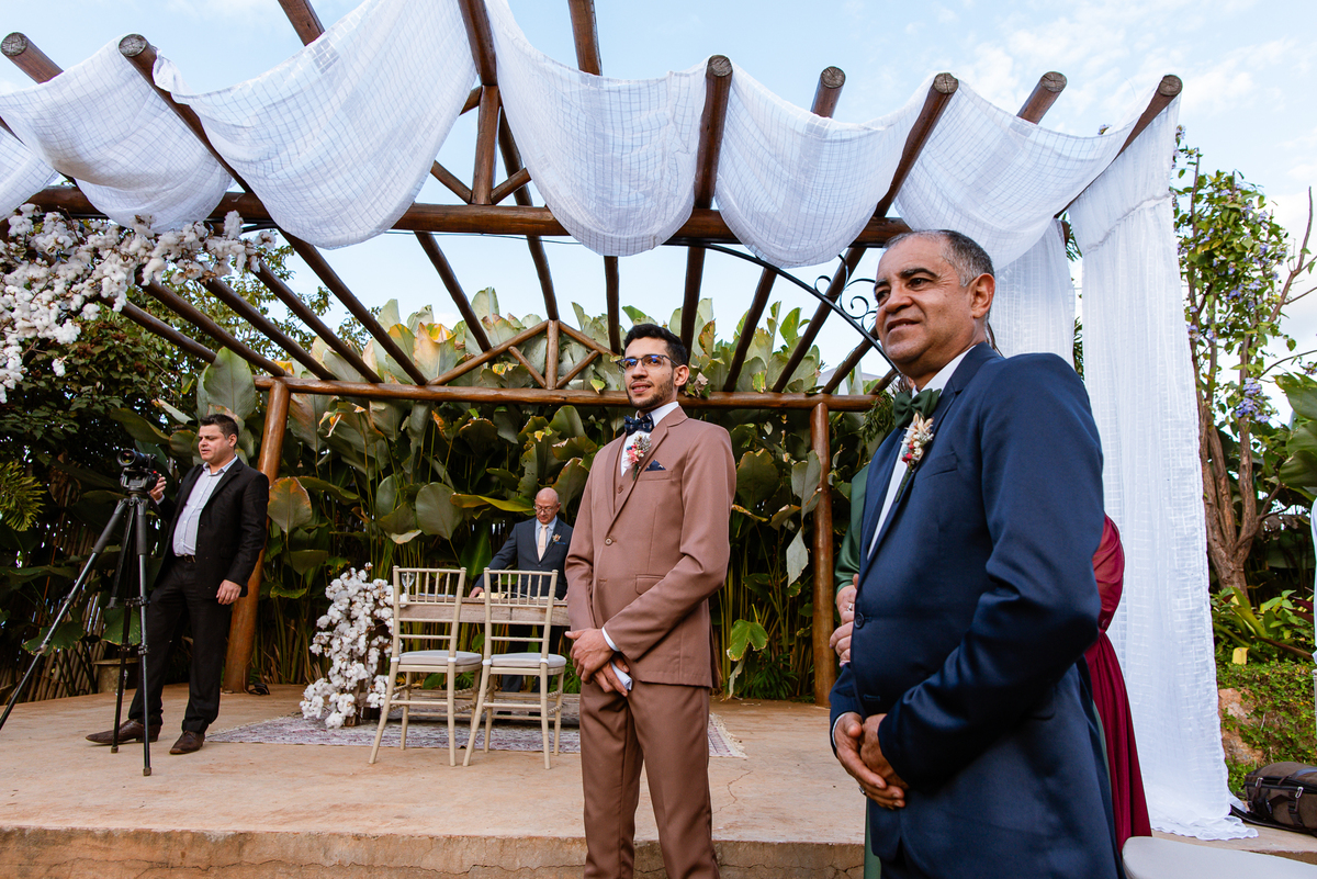 Depois do susto, ela chegou bem. Ainda tranquila, apesar dos momentos de tensão. Fizemos as fotos no carro e já liberamos a noiva para começar a cerimônia. Tudo estava na mais perfeita harmonia. Uma tarde gostosa e aconchegante, sem o sol forte para incomodar. Enfim, a cerimônia teve seu início. O celebrante adentrou com sua esposa, os pajens, as daminhas, floristas e as avós que adentraram com as plaquinhas também fizeram sua participação. Victor entrou de braços dados com seus pais, olhando para todos e sorrindo muito. Ao final do corredor, deu um forte aperto de mão em seu pai seguido de um beijo carinho no rosto. Foram segundos de amor inesquecíveis dentro de um abraço. Sua mãe também recebeu todo carinho dele, despedindo-se também com um beijo e um abraço. Victor estava agora pronto aguardando sua noiva vir ao seu encontro.