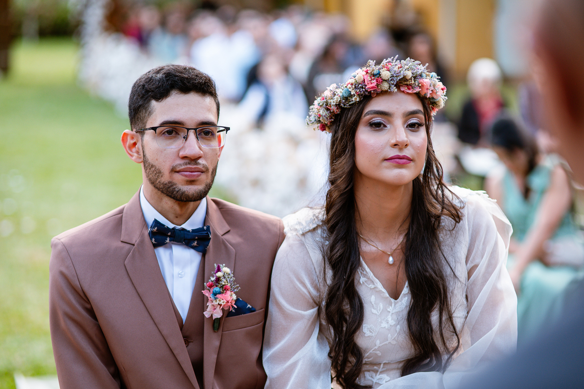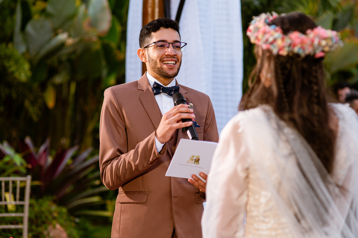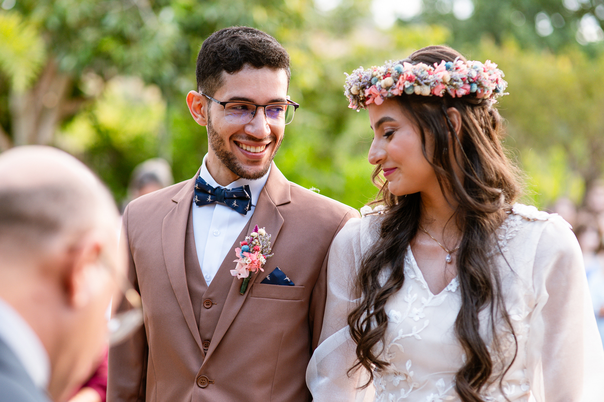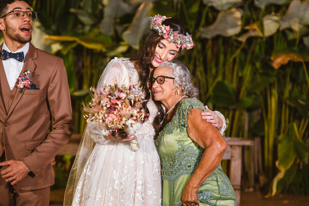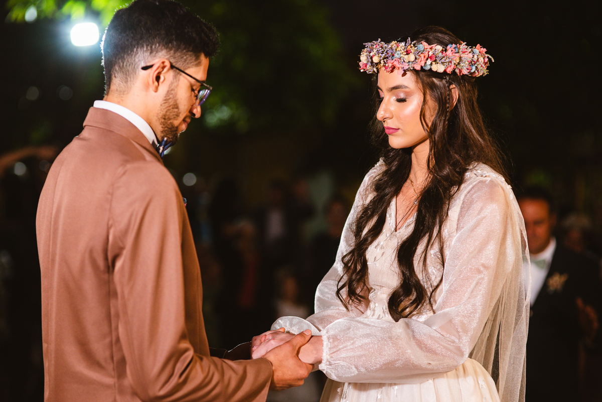 Eles caminharam até passar do portal, olhando para cada convidado. Muitos nesse momento já emocionados, sem contar o noivo que já estava com seus olhos marejados de lágrimas. A cada pessoa que eu via, estava tomada pela emoção. Victor mal podia conter suas lágrimas que insistiam em escorrer em seu rosto, ainda que o sorriso estivesse ali junto. Aqueles segundos pareciam intermináveis, mas era chegada a hora de finalmente encontrar sua amada. Com passos firmes, o noivo caminhou até os três, despedindo-se de sua sogra e posteriormente de seu sogro. Recebeu dele a mão de sua noiva que mal podia conter a emoção. Lembro de ver o primeiro olhar deles juntos, de mãos dadas e olhos fitos um no outro. Victor recebeu sua amada com um respeitoso beijo na mão. Eles se alinharam frente a frente, agora sozinhos, um para o outro. Victor deu um outro beijo na fronte de sua noiva e posteriormente um grande abraço.