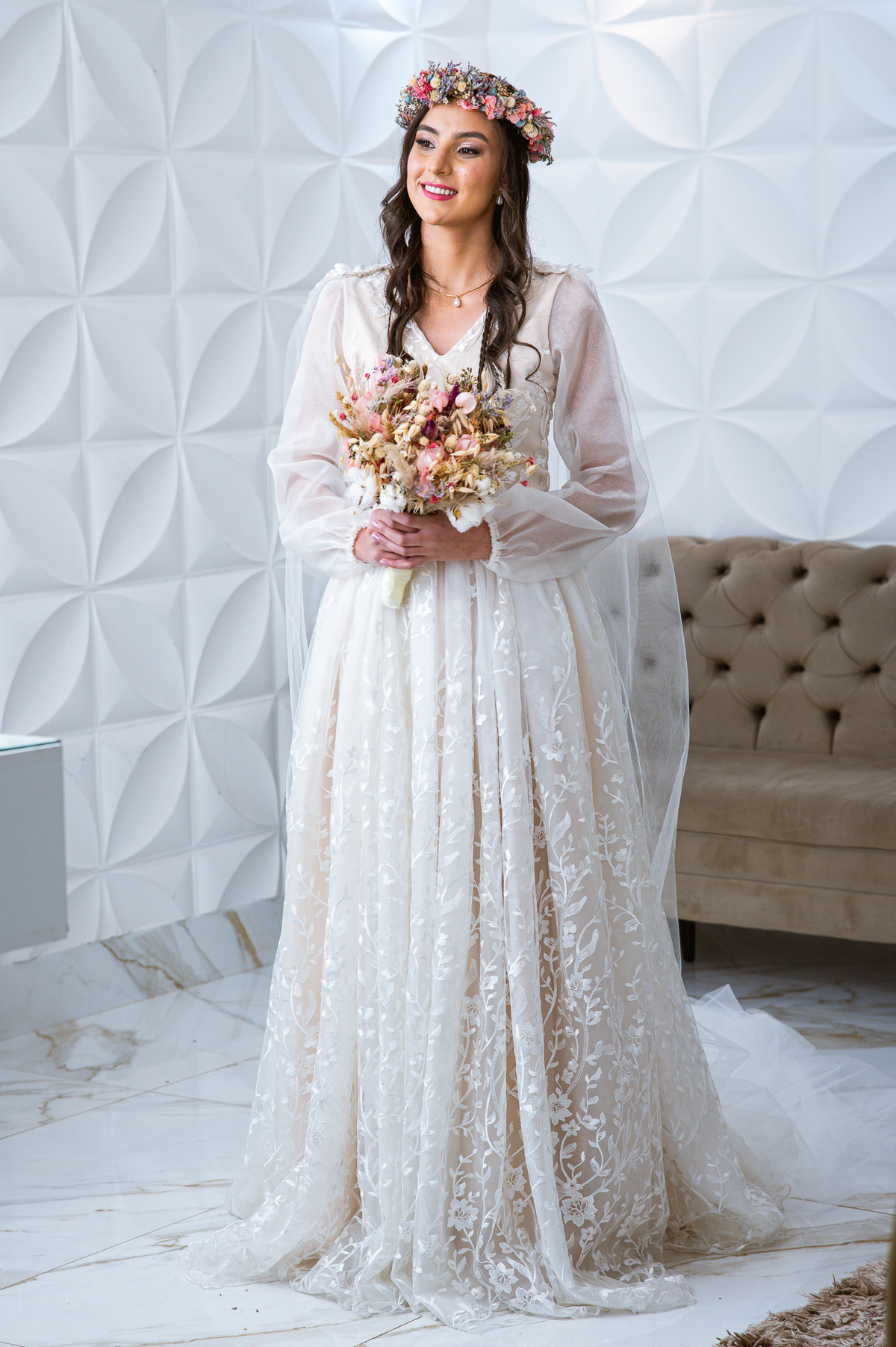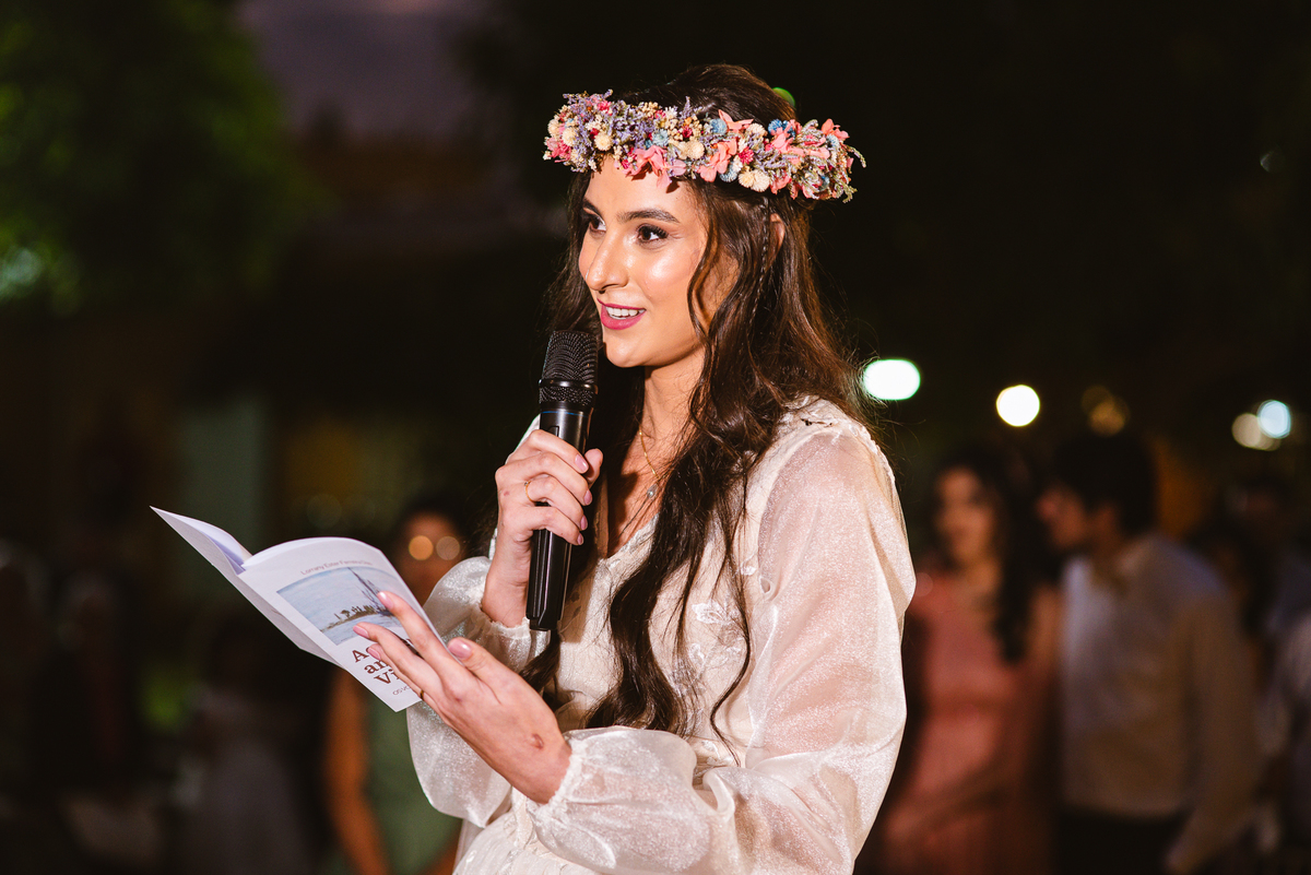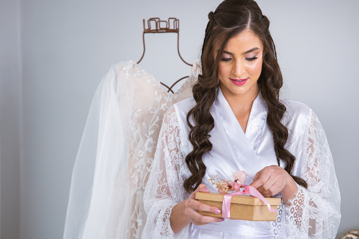 Enquanto isso, Lorrany já estava em seus últimos ajustes. A make pronta e o penteado sendo finalizado, já que havia um item muito especial que seria colocado. A sua sogra preparou uma coroa de flores para colocar em sua cabeça, ornar com seu vestido e também com o local ao ar livre. Ficou maravilhosa! Além da coroa, a cerimonialista ainda trouxe um presente surpresa, ela recebeu em suas mãos um lindo colar para fechar o seu traje para o casamento. Ela recebeu também uma caixinha surpresa com uma carta lindíssima e visivelmente emocionada, ela leu a carta do seu noivo mentalmente e ficou muito feliz. Depois de todas as emoções de receber o buquê, a coroa de flores e o presente do noivo, era chega a hora de colocar o vestido. Depois de colocá-lo, o véu tinha todo um jeitinho especial de ser colocado. Nada de prender na cabeça e estragar o penteado feito com todo carinho. Ele tinha o seu lugar para prender como as princesas fazem: no alto do vestido, em cima do ombro. Finalmente pronta, Lorrany distribuía simpatia. Fez as fotos com sua dama de honra, madrinha e irmã.