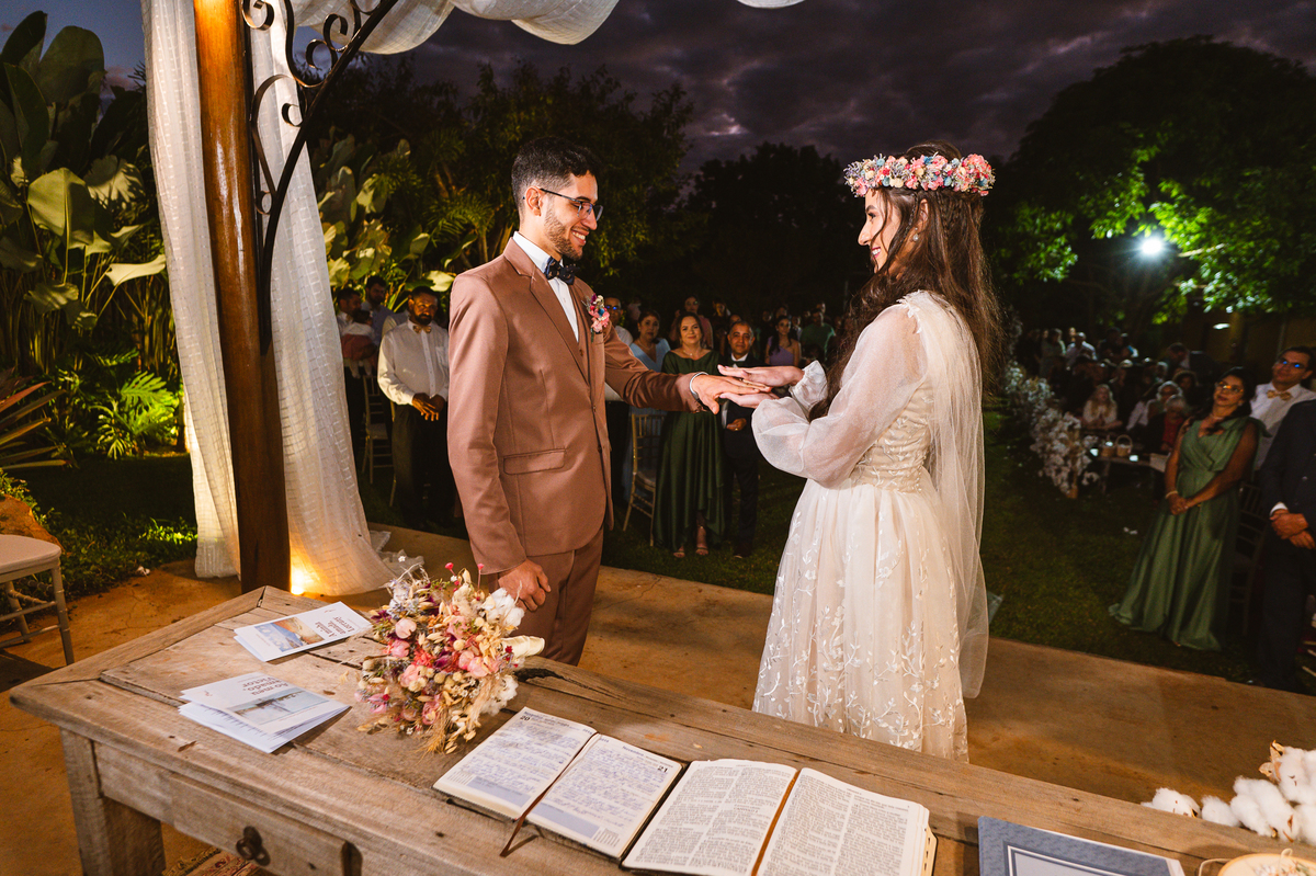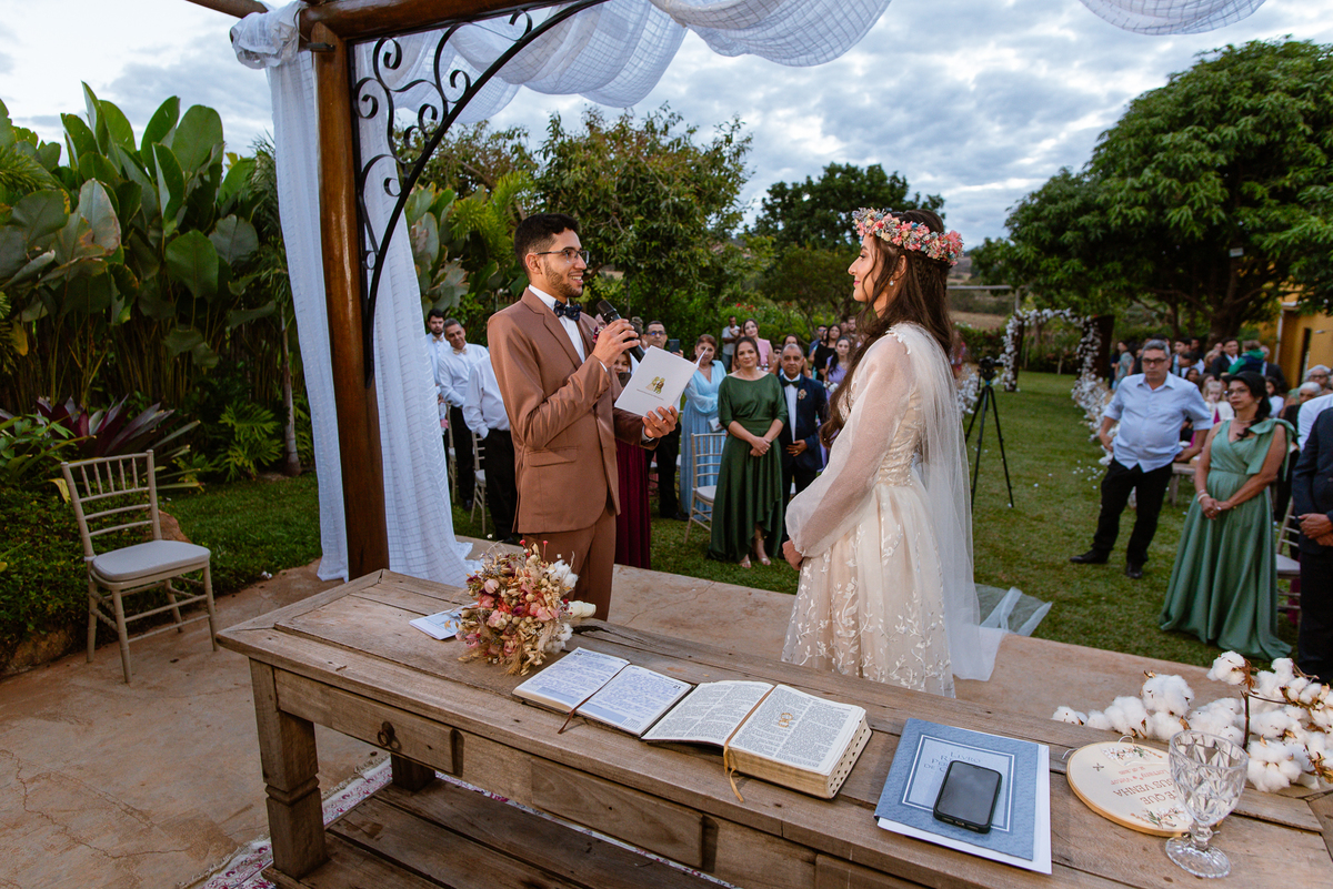 Eles agora caminharam juntos, rumo ao altar para receber a bênção de Deus sobre seu casamento. O Pastor Adair os recebeu com todo carinho e trouxe uma palavra belíssima. Falou para eles e para todos os convidados prestarem bem a atenção. E assim foi. Passado o momento da palavra, o pastor convidou as alianças para serem recebidas no altar. E elas foram trazidas pela vovó dos noivos. Depois de recebê-las, Victor protagonizou um momento muito divertido: Diante do anúncio do pastor, se haveria no meio dos convidados alguém que fosse contra o casamento, que dissesse agora ou calasse para sempre. Nesse exato momento, o noivo virou para os convidados e por debaixo do terno escondia uma "arma", e com os dedos apontados "ameaçou" pedindo silêncio. Todos riram muito e entraram na brincadeira. Obviamente ninguém se levantou ou disse nada contra e a cerimônia prosseguiu. Victor e Lorrany prepararam votos para dizer um para o outro, e essa parte foi muito marcante. As palavras ditas ali um pelo outro me fizeram emocionar de verdade, como poucas vezes me emocionei. Tive que enxugar meus olhos mediante as lágrimas que saíram sem meu consentimento. Foram votos muito sinceros, de duas pessoas que se amam e que cuidaram muito um do outro até que chegassem ali. Eles trocaram as alianças e foram declarados casados perante Deus e suas testemunhas.