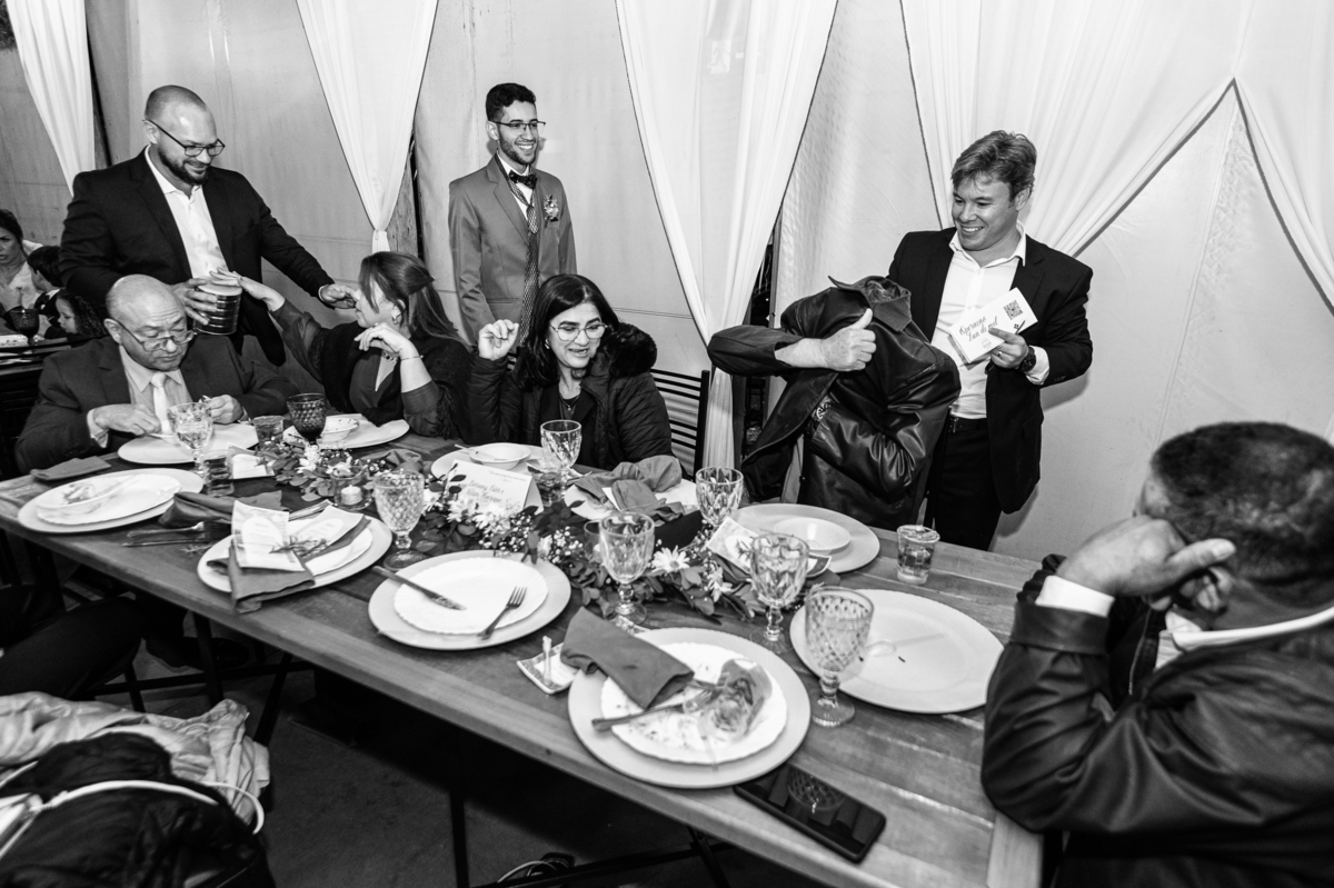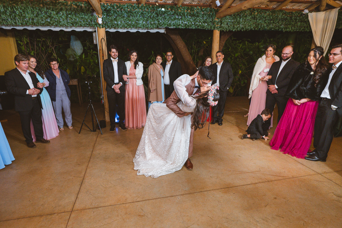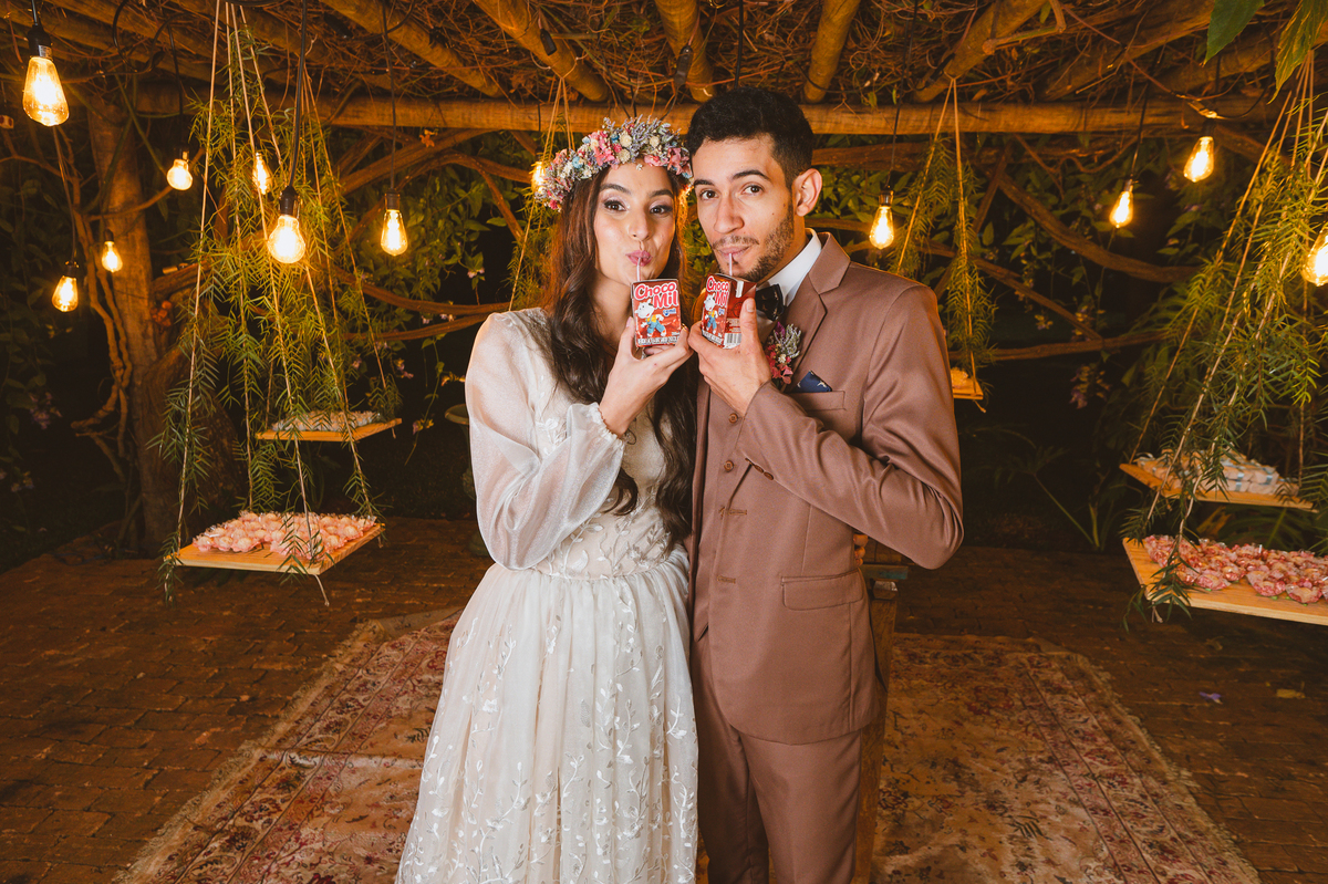 Depois de todos os trâmites, assinaram os papéis, fotografaram com seus convidados e padrinhos e foram recebidos por um corredor de felicidade. Com bolhas de sabão, os padrinhos receberam o mais novo casal da noite com muitas palmas e felicidades. Fizemos nossas tradicionais fotografias do casal, sozinhos aproveitando o ambiente maravilhoso que tínhamos, enquanto os convidados eram alocados em seus lugares. Depois, os recém-casados foram recebidos com muita festa dentro do salão e protagonizaram uma dança muito especial. Dançaram como profissionais e com passos muito delicados finalizando com um super beijo. Por fim, agradeceram a presença de todos e partiram para a festa. Fizemos ainda o brinde do casal que não toma álcool, e fizeram questão de usar um Chocomil para brindarem, super originais! Eles também fizeram suas fotos com a trend da música, e rapidamente todos haviam feito suas fotos com eles.