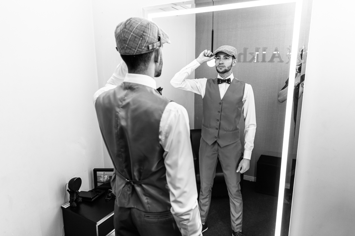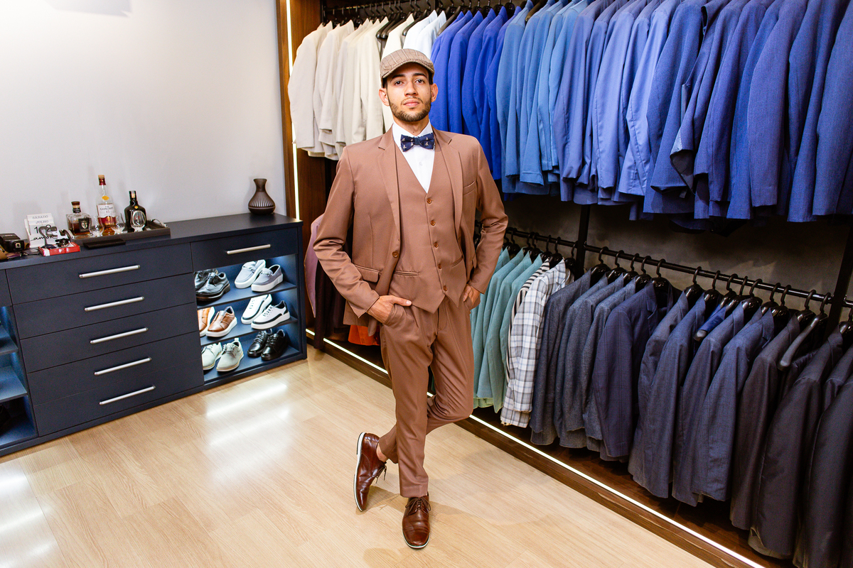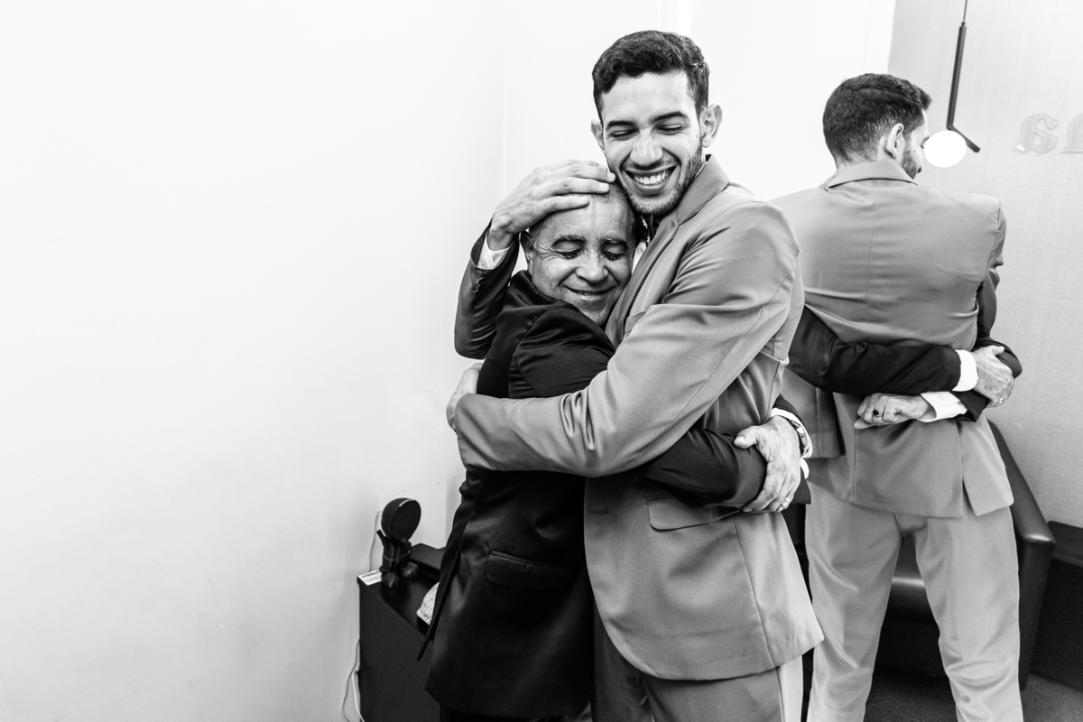Eles se divertiram muito enquanto se arrumavam e trouxe uma tranquilidade a mais para o noivo. Victor foi se arrumando, conferindo os detalhes do terno, além de usar a boina que é tradição de seu pai. O noivo é bem decidido e escolheu uma cor bem diferente das demais. E ficou muito bonito no terno. Depois de finalizar suas vestimentas, recebeu o carinho de seu pai com um forte abraço. Ambos ficaram prontos e partiram para o local da cerimônia.