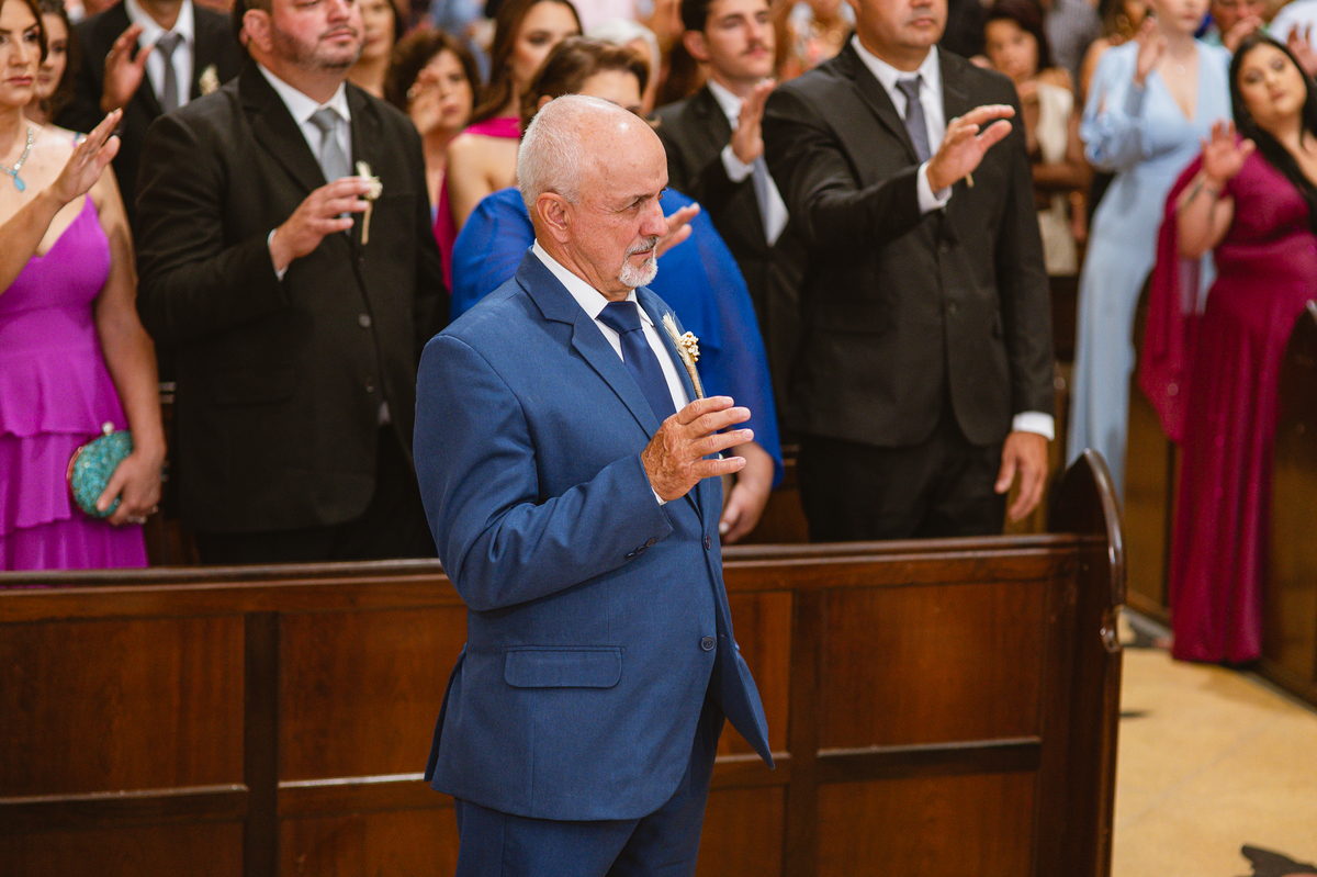 Padrinhos, madrinhas, pajens e o noivo adentraram cada um com seu charme especial. Henrique veio de braços dados com seu pai e acompanhou as demais entradas, com certa ansiedade. Do lado de cá, Verinha estava também levemente ansiosa, para finalmente poder encontrar seu amor. Após as entradas respectivas, as portas da Igreja foram fechadas. Isso indicava que a próxima a adentrar seria a estrela da noite. A última separação entre Vera e Henrique era apenas uma porta. De braços dados com seu pai e com todo carinho do mundo, ela contava os segundos para que a porta se abrisse. Henrique estava bem emocionado, tentando conter as lágrimas.
