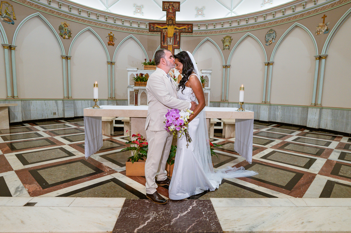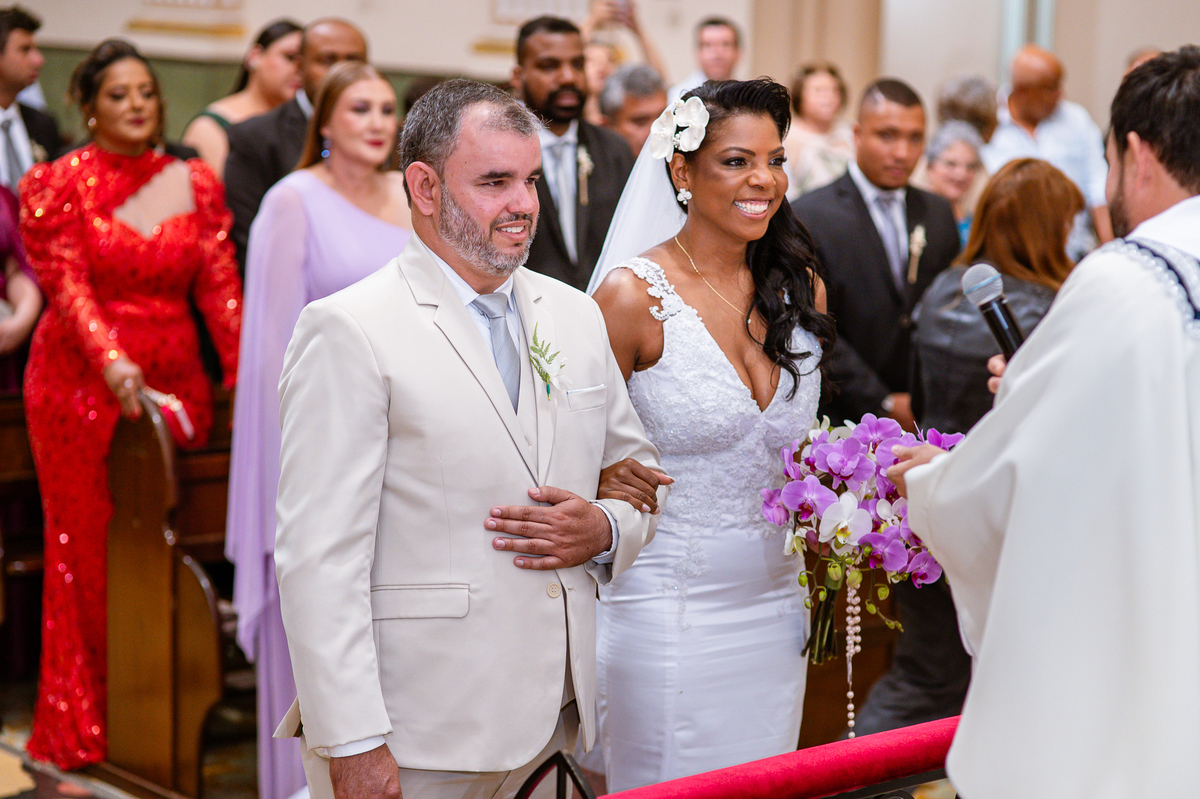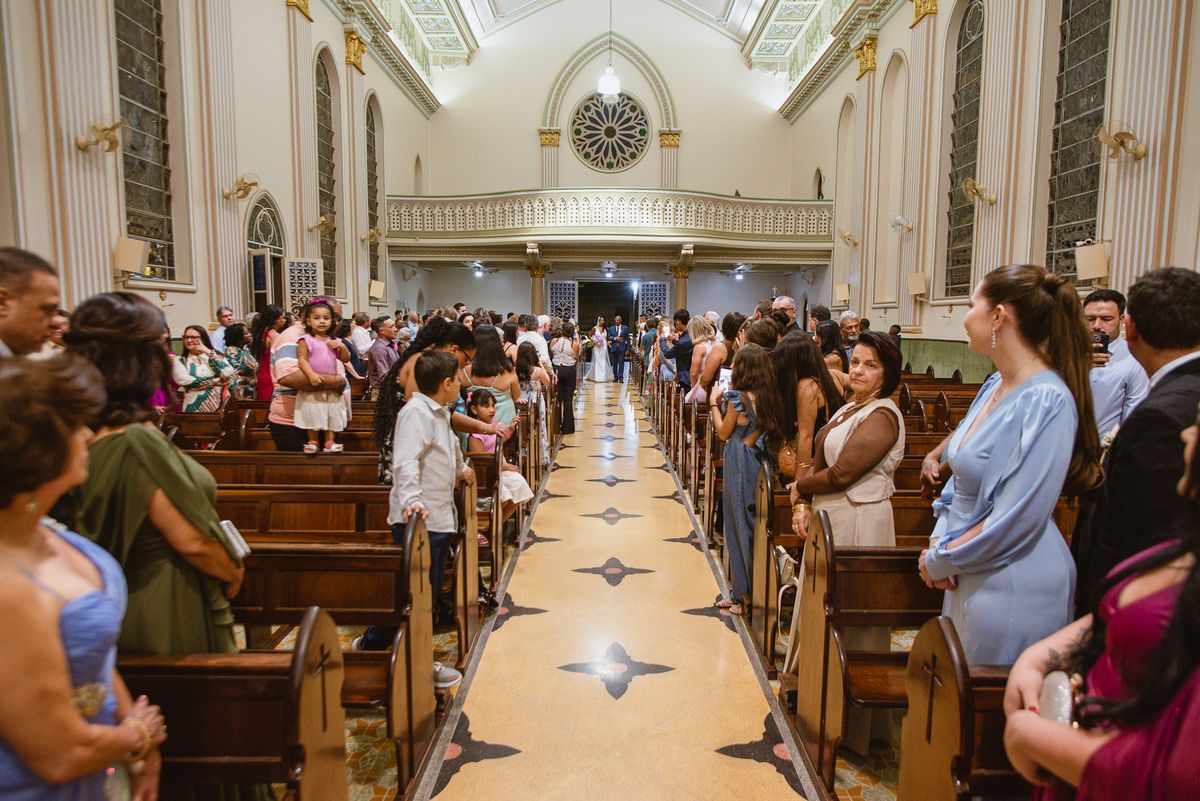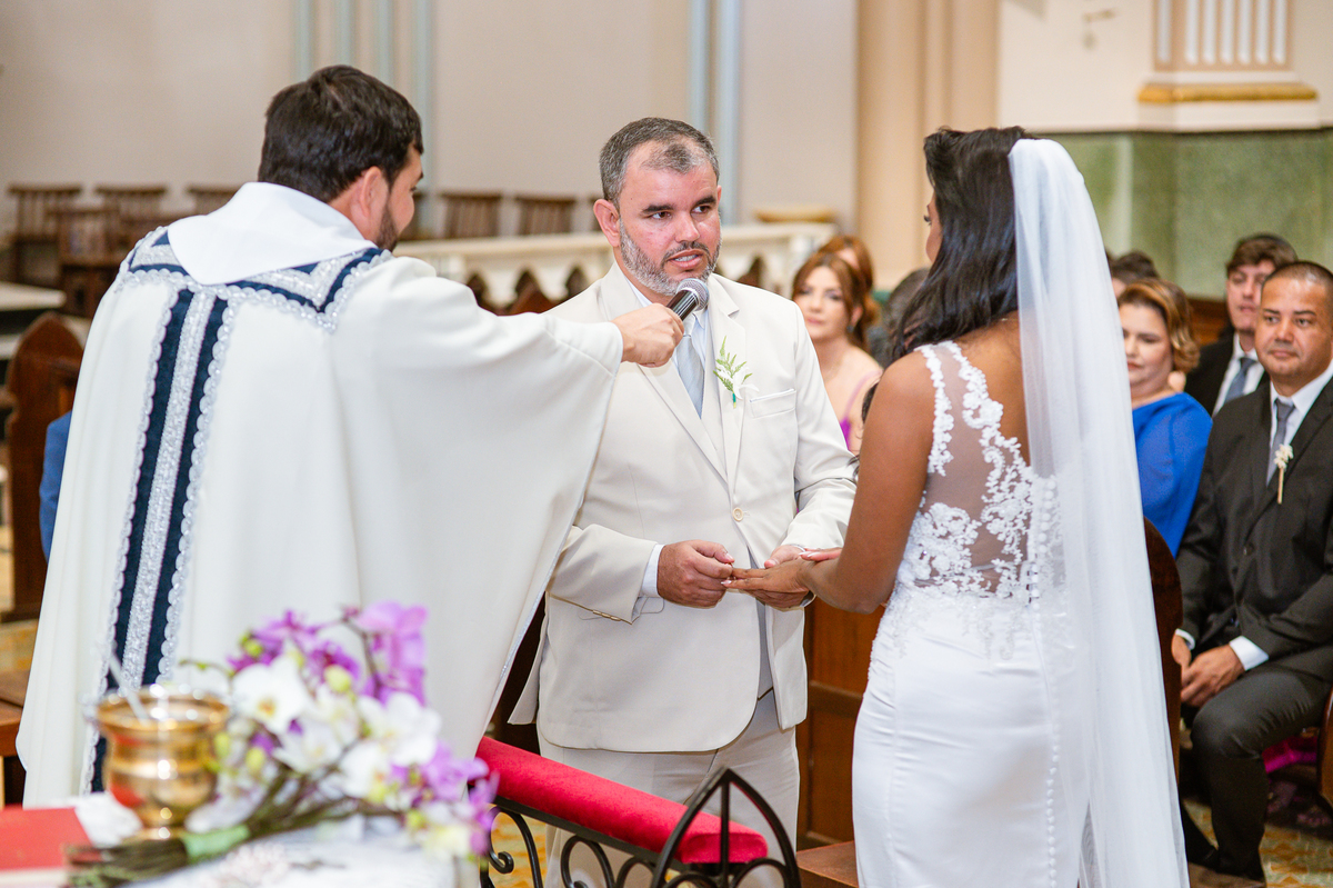 O padre os recebeu com muito carinho, e por serem conhecidos trouxe uma homilia muito bacana. Em determinados momentos da cerimônia os fez sorrir bastante. Ele consagrou o casal e as alianças, os fez trocar seus votos e os declarou casados perante Deus e as testemunhas. E pediu também que os dois selassem aquele momento de alegria com um beijo super especial que foi aplaudido por todos os convidados. Depois, assinaram os documentos e fizemos as tradicionais fotografias no altar. Fizemos ainda várias fotos deles e também de todos que desejaram participar.