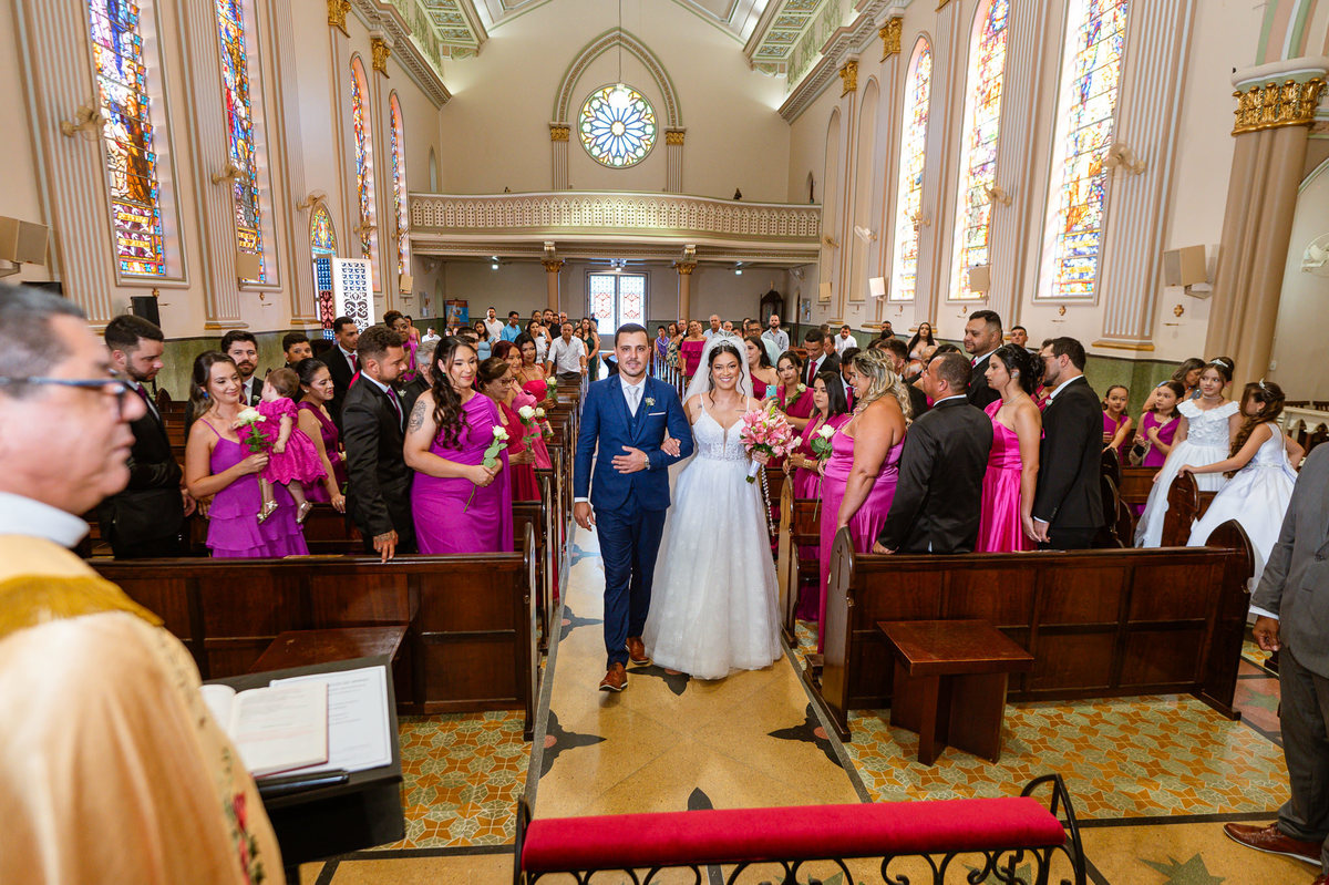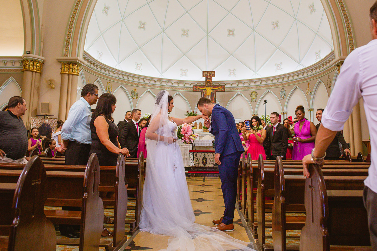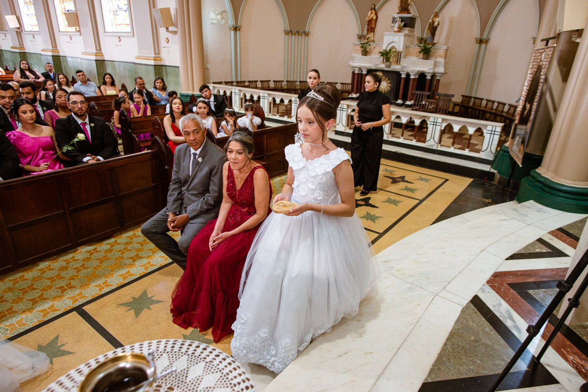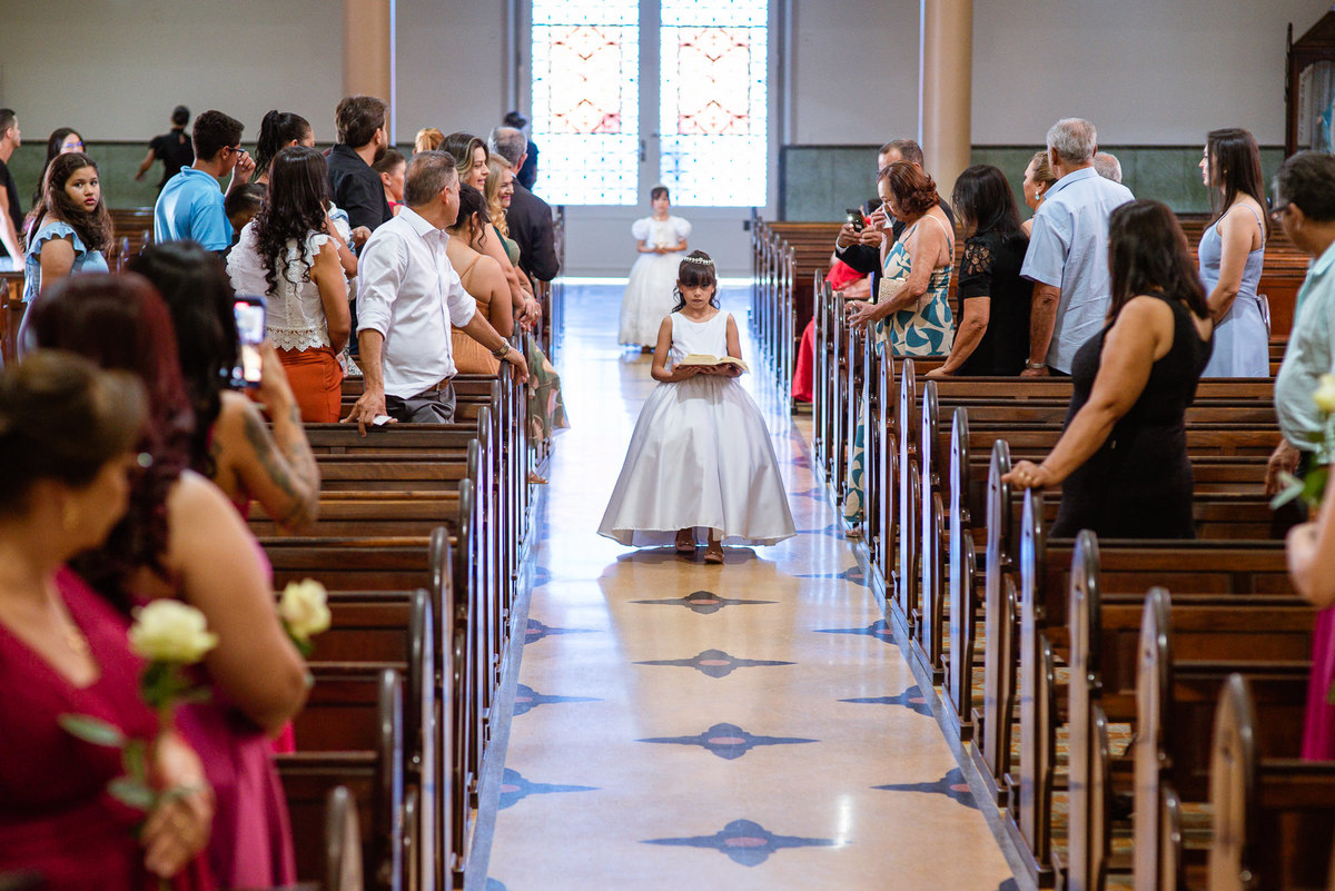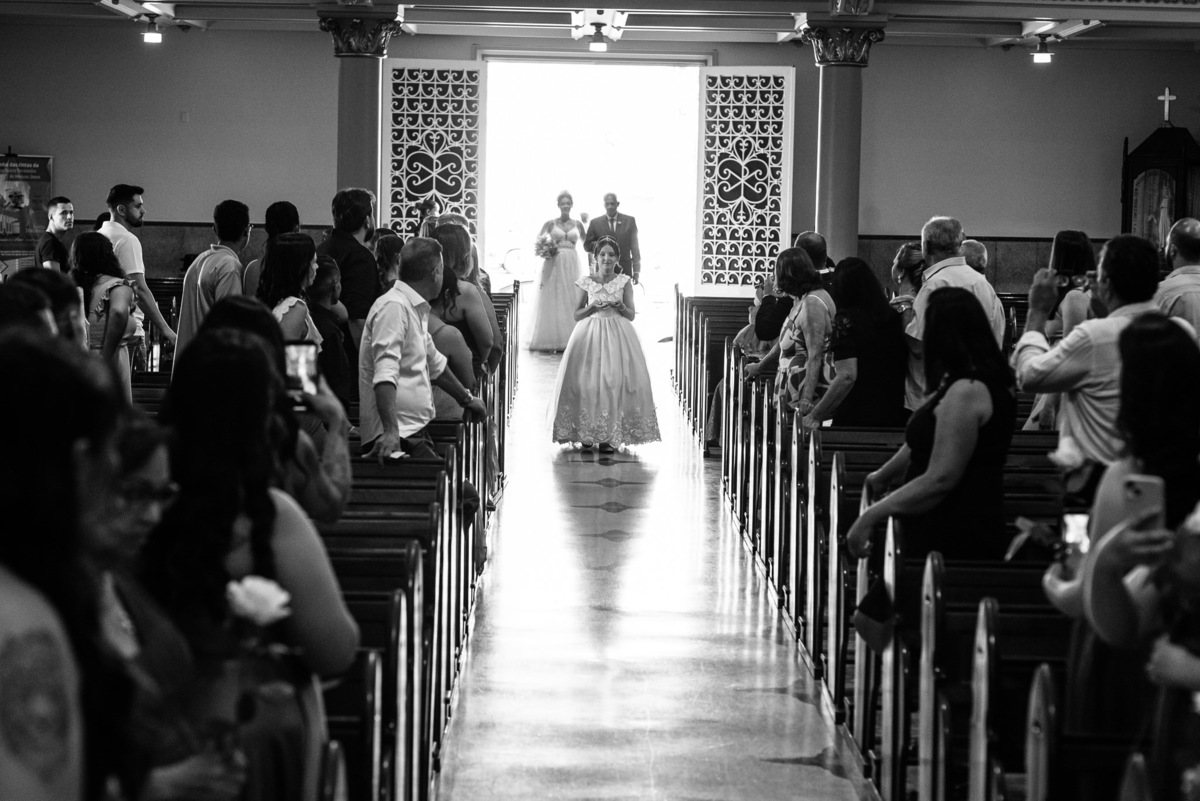 Os padrinhos adentraram cada um com seu estilo. Sorridentes e felizes, cada um fez a sua entrada. Os pajens e daminhas também deram o seu show, trazendo as santinhas e homenagens. Finalmente, as portas da Igreja se fecharam para que Bianca se posicionasse. Seu pai a ajudou a descer do veículo e de braços dados eles ficaram do lado de fora. Olhares de agradecimento aconteceram, mesmo sem que palavras fossem ditas um para o outro. A marcha nupcial foi entoada e posteriormente, a música escolhida por ela foi então tocada. Os corações nesse momento ficam acelerados, e do fotógrafo também. Nós nos envolvemos muito com esses noivinhos e com seus sonhos. Acompanhamos desde os primeiros momentos até que esse dia chegasse.