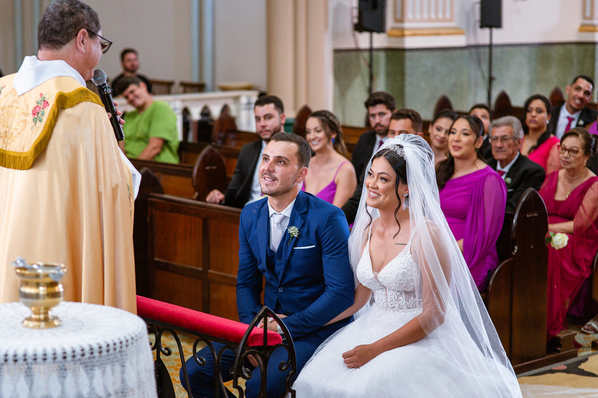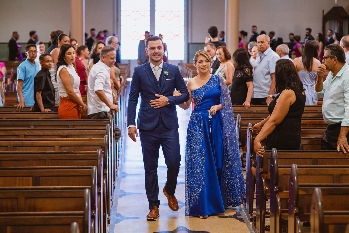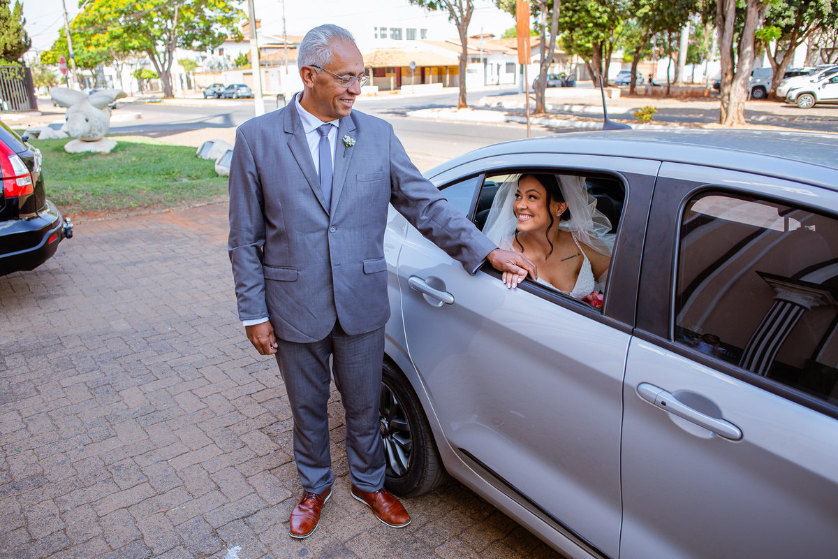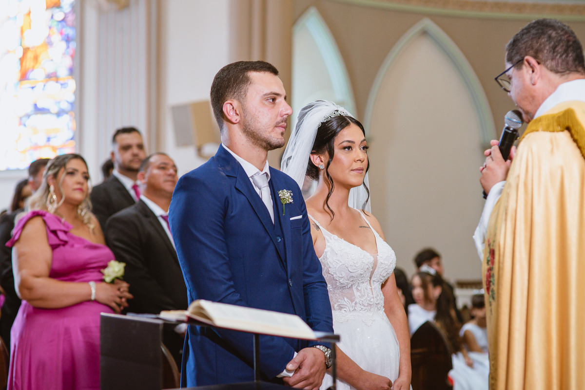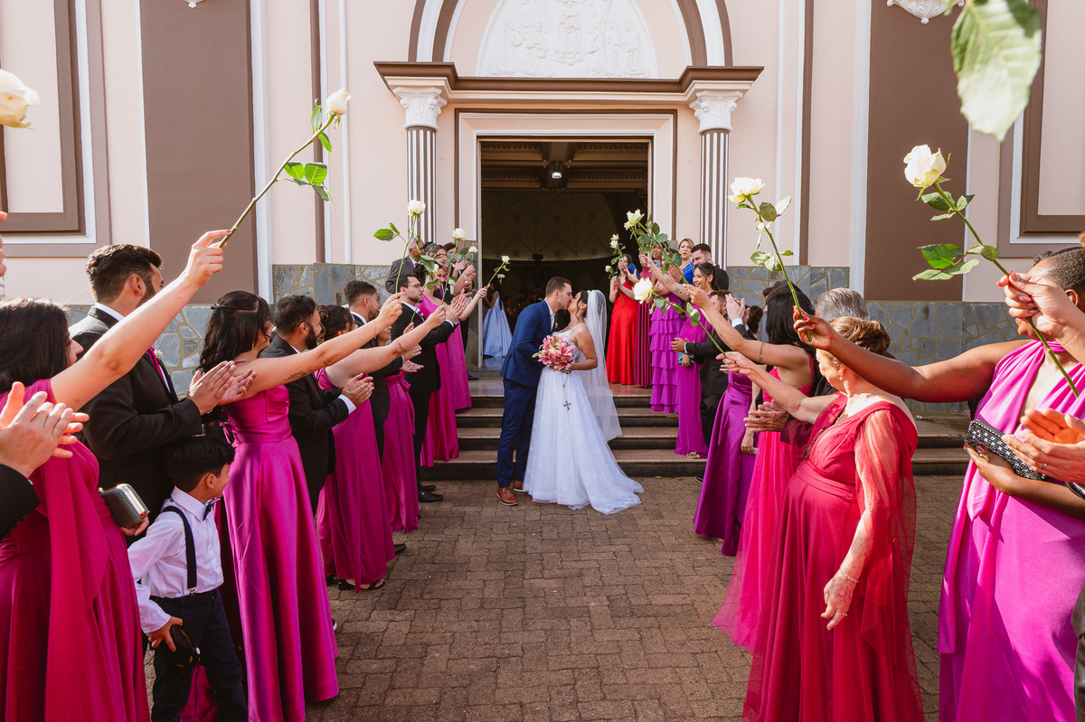Os padrinhos adentraram cada um com seu estilo. Sorridentes e felizes, cada um fez a sua entrada. Os pajens e daminhas também deram o seu show, trazendo as santinhas e homenagens. Finalmente, as portas da Igreja se fecharam para que Bianca se posicionasse. Seu pai a ajudou a descer do veículo e de braços dados eles ficaram do lado de fora. Olhares de agradecimento aconteceram, mesmo sem que palavras fossem ditas um para o outro. A marcha nupcial foi entoada e posteriormente, a música escolhida por ela foi então tocada. Os corações nesse momento ficam acelerados, e do fotógrafo também. Nós nos envolvemos muito com esses noivinhos e com seus sonhos. Acompanhamos desde os primeiros momentos até que esse dia chegasse.