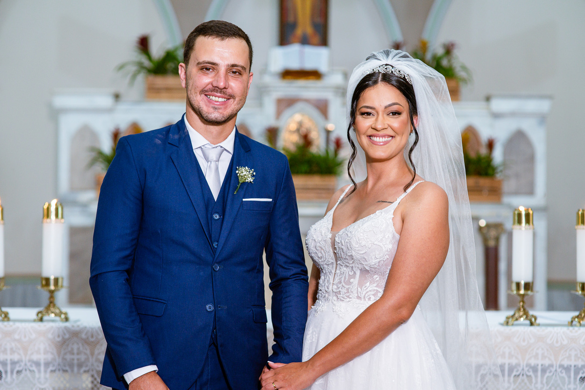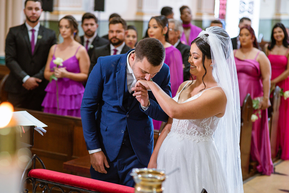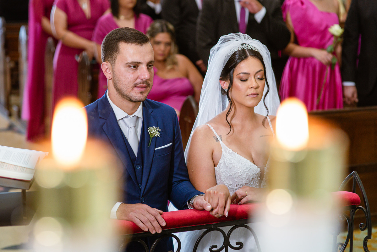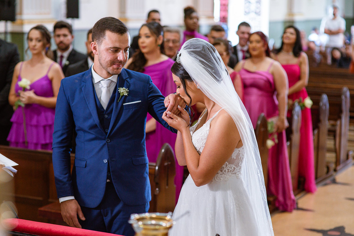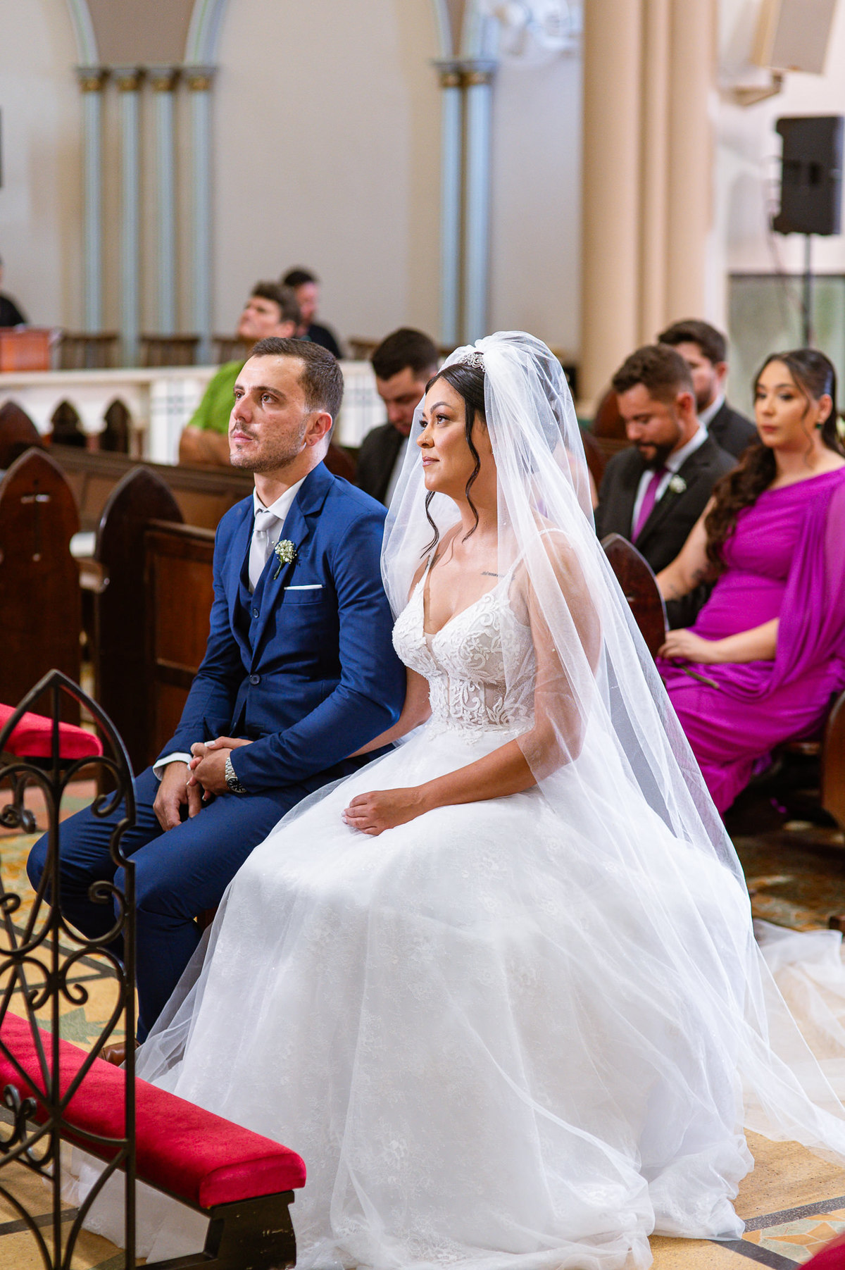 Os padrinhos adentraram cada um com seu estilo. Sorridentes e felizes, cada um fez a sua entrada. Os pajens e daminhas também deram o seu show, trazendo as santinhas e homenagens. Finalmente, as portas da Igreja se fecharam para que Bianca se posicionasse. Seu pai a ajudou a descer do veículo e de braços dados eles ficaram do lado de fora. Olhares de agradecimento aconteceram, mesmo sem que palavras fossem ditas um para o outro. A marcha nupcial foi entoada e posteriormente, a música escolhida por ela foi então tocada. Os corações nesse momento ficam acelerados, e do fotógrafo também. Nós nos envolvemos muito com esses noivinhos e com seus sonhos. Acompanhamos desde os primeiros momentos até que esse dia chegasse.