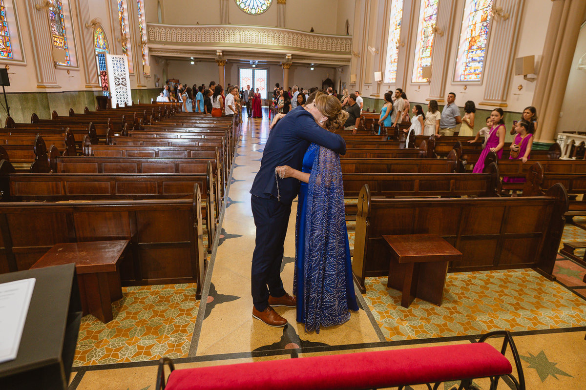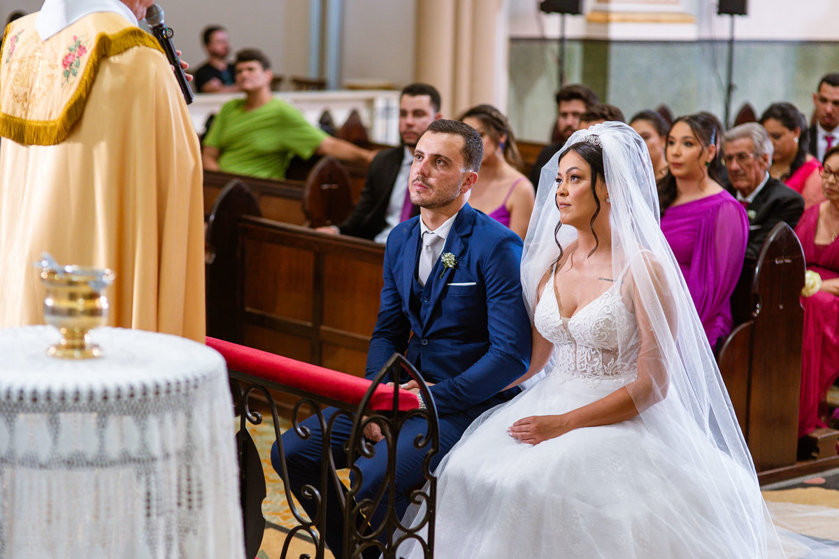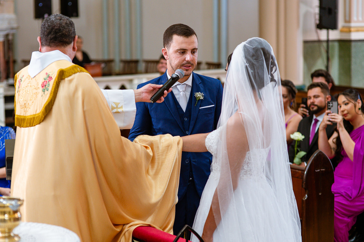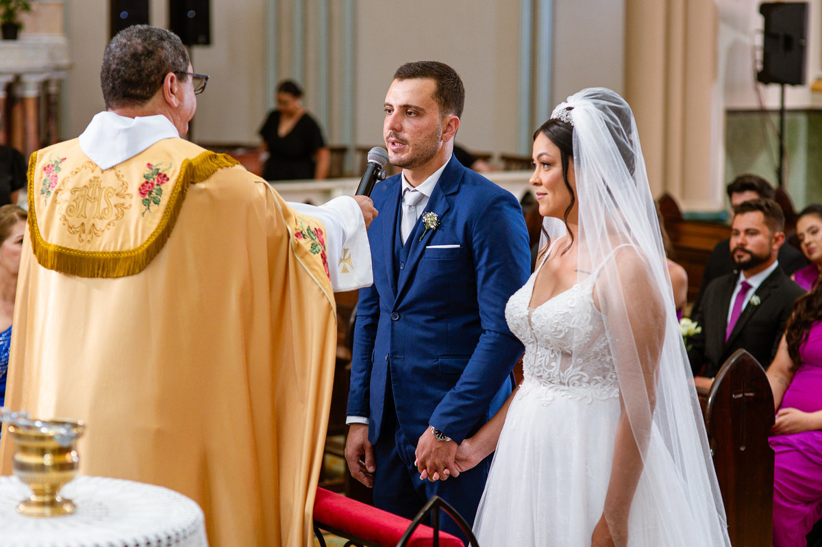 Agora sim, depois de longos anos de espera, os dois caminharam juntos para receber a bênção de Deus sobre seu casamento. O padre os recebeu com todo amor, trouxe uma palavra belíssima para os noivos. Ele fez com que os noivos trocassem seus votos eternos e os fez as tradicionais perguntas pré-nupciais que ambos responderam sim, após o juramento católico. Então, a filha do casal trouxe as alianças que foram abençoadas, pedindo ao casal que eles mesmos jogassem a água benta sobre elas. Assim, eles trocaram as alianças e com uma forte salva de palmas dos convidados eles foram declarados casados. Os recém-casados assinaram os documentos e fizemos nossas tradicionais fotografias com os padrinhos e parentes no altar.