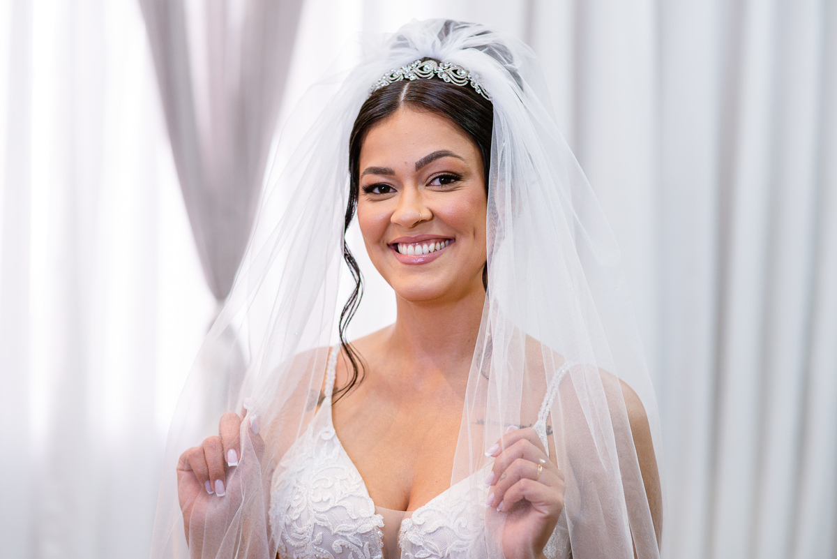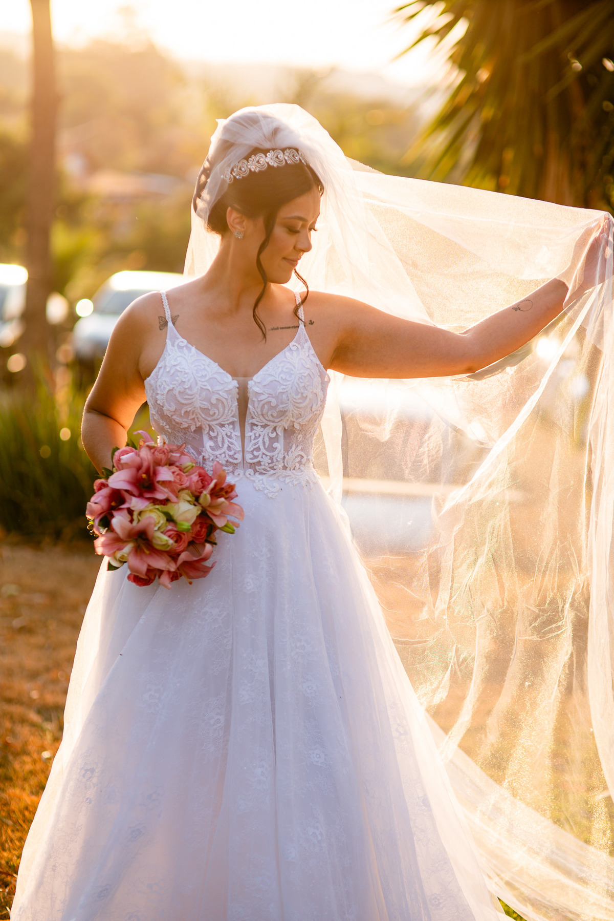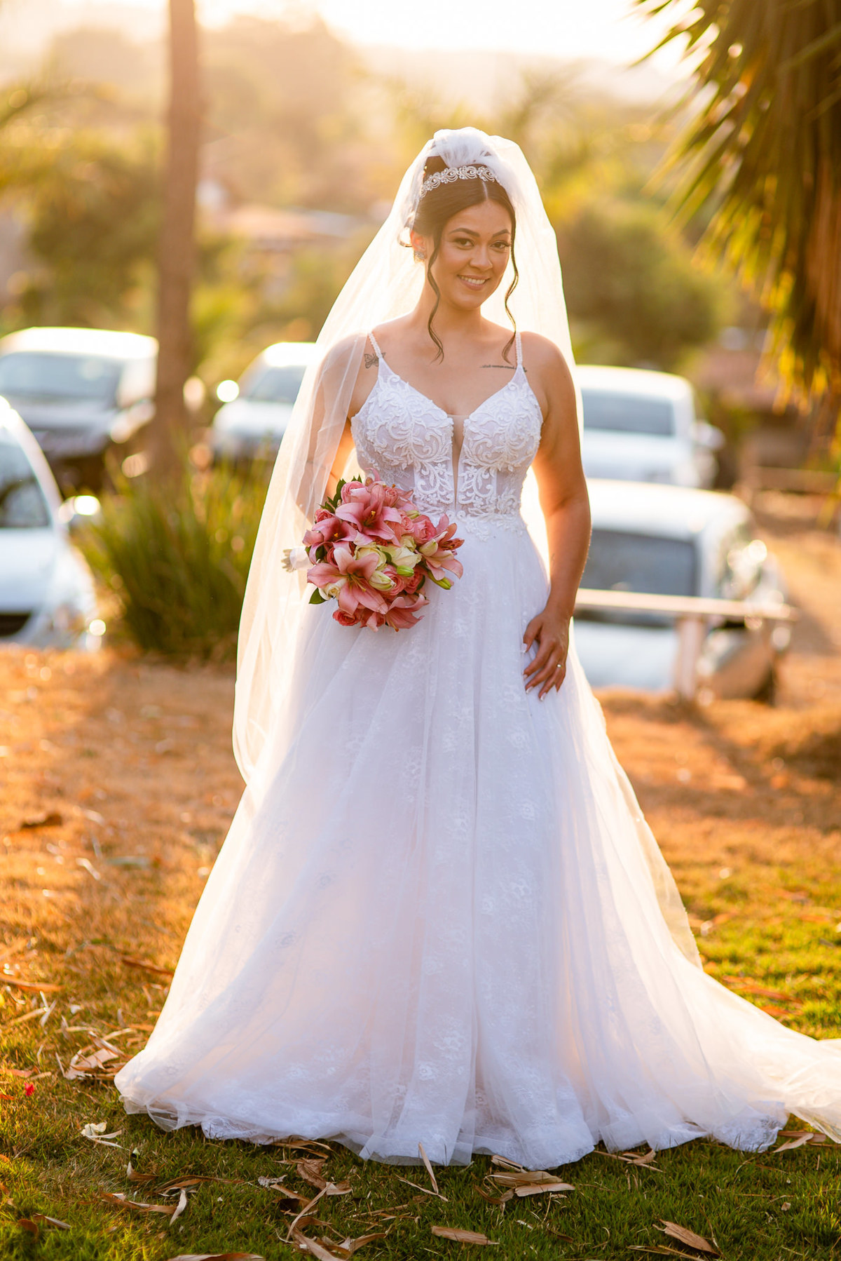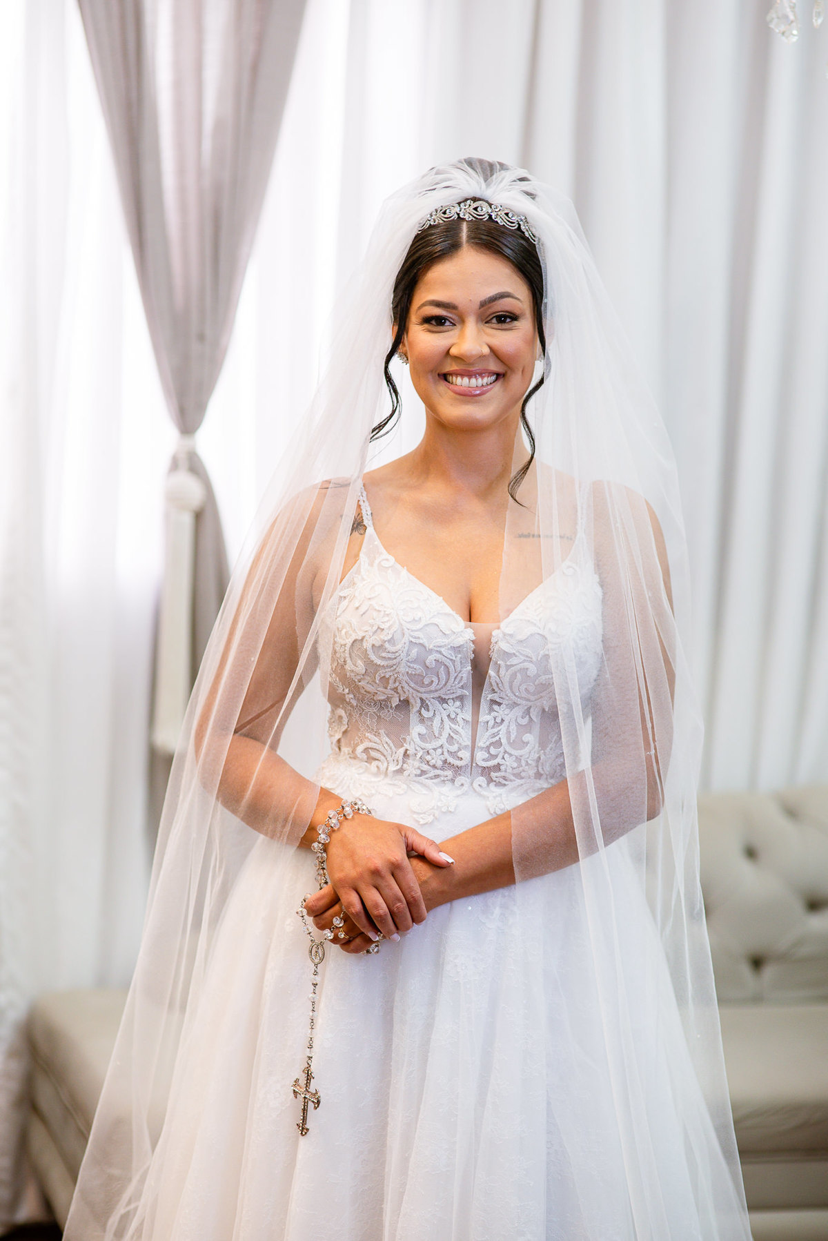 Bianca colocou seu vestido e quando nos chamaram para entrar na sala novamente, encontramos uma noiva completa. Vestido divo, penteado impecável e make maravilhosa. Tudo estava extremamente lindo. Além de tudo, o sorriso de felicidade contagiante da noiva espalhava a alegria a cada um que a via. Fizemos alguns retratos dela de noiva, destacando também suas tatuagens cheias de significado. Até mesmo o momento de colocar o véu produziu imagens lindas. Tudo estava alinhado. Fizemos mais algumas fotografias dessa noiva pleníssima, com seu buquê e também o seu terço. Depois, partimos também para a celebração.