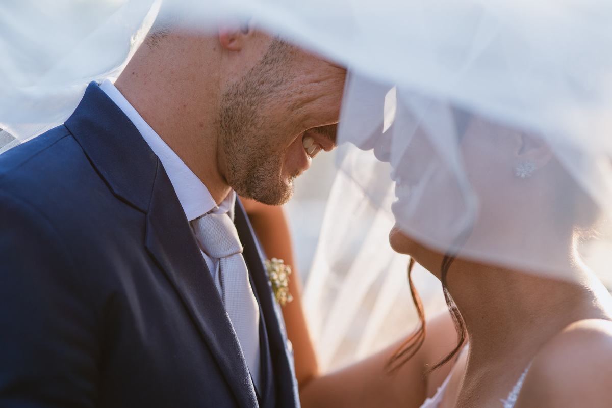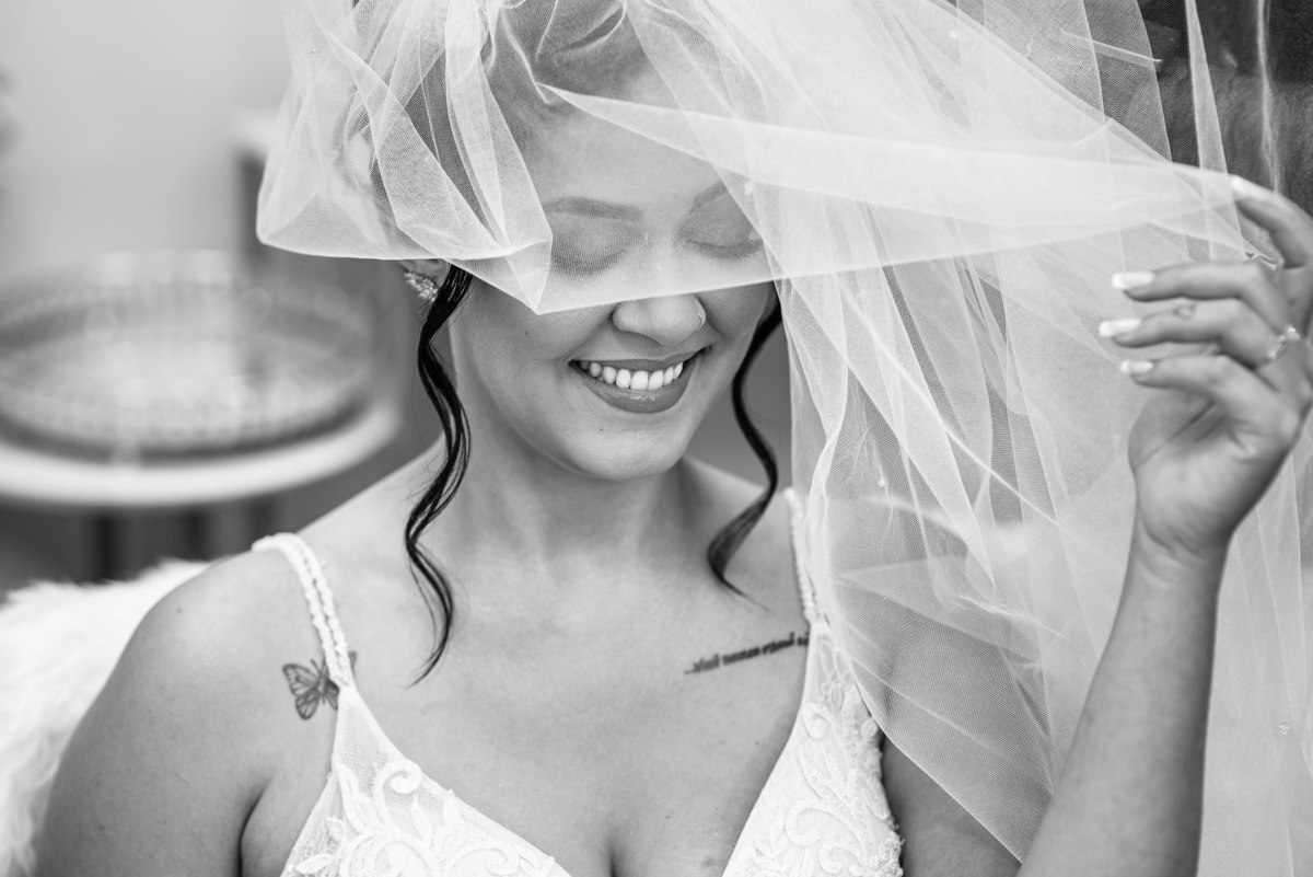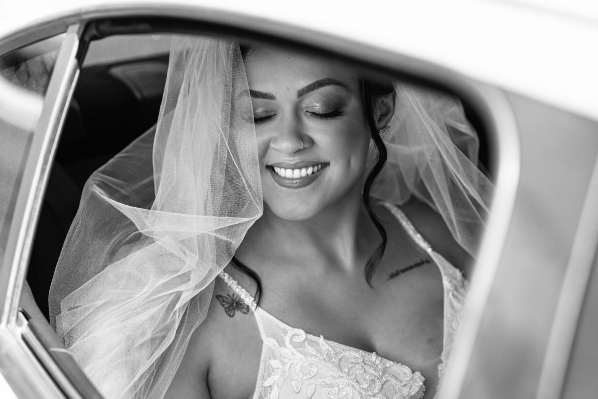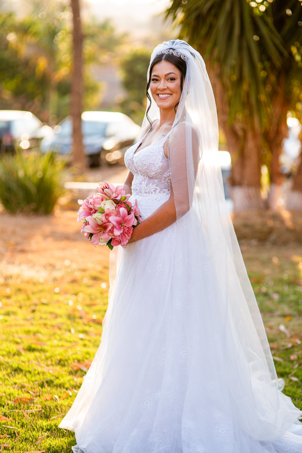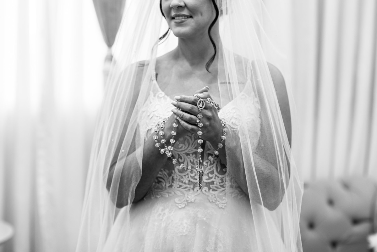 Bianca colocou seu vestido e quando nos chamaram para entrar na sala novamente, encontramos uma noiva completa. Vestido divo, penteado impecável e make maravilhosa. Tudo estava extremamente lindo. Além de tudo, o sorriso de felicidade contagiante da noiva espalhava a alegria a cada um que a via. Fizemos alguns retratos dela de noiva, destacando também suas tatuagens cheias de significado. Até mesmo o momento de colocar o véu produziu imagens lindas. Tudo estava alinhado. Fizemos mais algumas fotografias dessa noiva pleníssima, com seu buquê e também o seu terço. Depois, partimos também para a celebração.