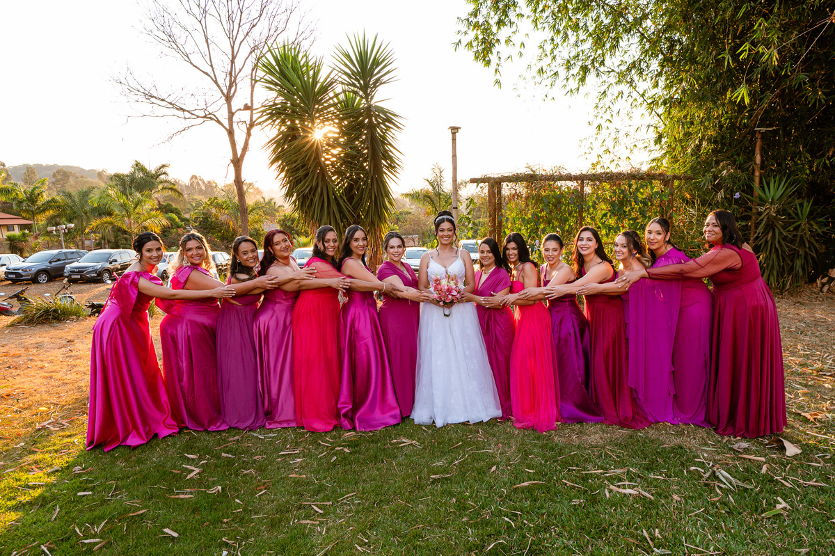 Posteriormente, os padrinhos fizeram uma fila na escadaria da Igreja para recepcionar o mais novo casal. Bianca e Leonardo foram recebidos com muitas palmas e gritos de alegria. O casal nos solicitou uma foto num local muito especial para eles. O local é bem em frente à Igreja, numa pracinha. E foi ali que tudo começou. Bianca e Leonardo deram o primeiro beijo exatamente ali naquele lugar e queriam muito deixar registrado em suas fotografias o local onde tudo começou e onde haviam chegado. A tarde estava só começando, nós partimos dali para a recepção. Lá chegando, fizemos algumas fotografias da decoração que estava cuidadosamente preparada. Fizemos também, assim que chegaram, as fotos do casal. As madrinhas e padrinhos foram convidados também para fazerem juntos uma foto.