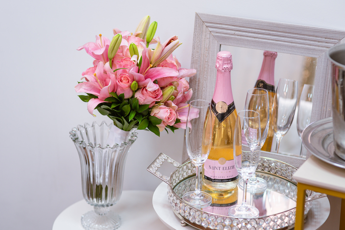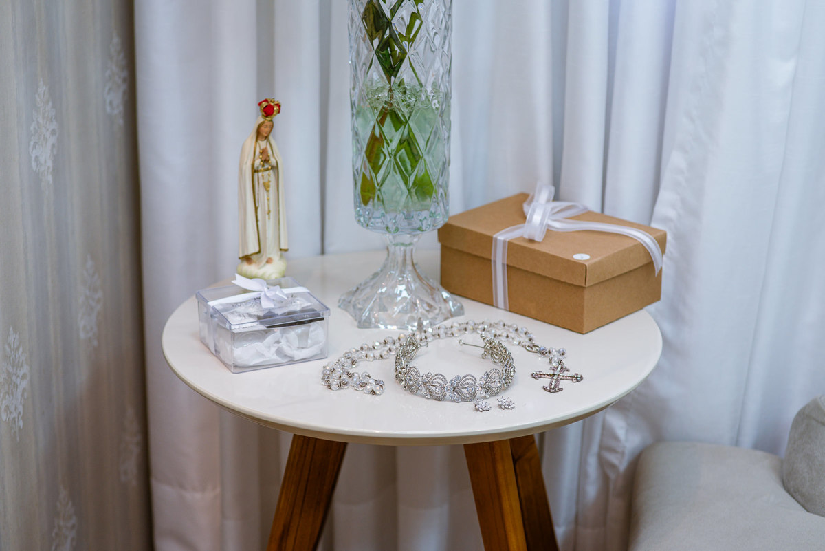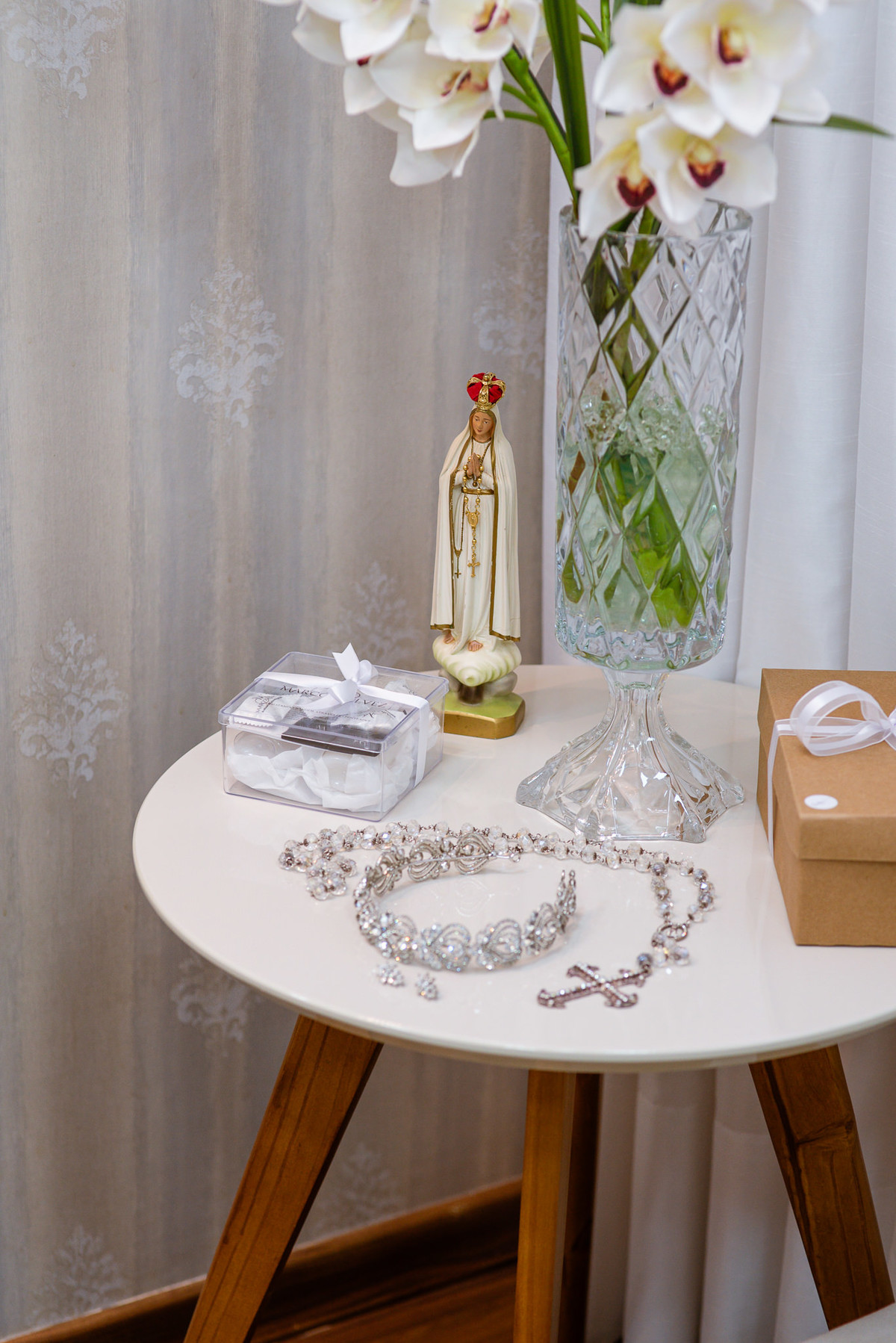 Bianca estava com seu penteado sendo finalizado. O vestido maravilhoso estava lá, pronto para ser colocado. Ouvimos uma batida na porta, e ao abrir eis a surpresa: Um lindíssimo buquê de flores para Bianca. Leonardo preparou com todo carinho essa surpresa para ela e ainda escreveu de próprio punho um recadinho que imediatamente desmontou totalmente a noivinha. As lágrimas vieram e interromperam até mesmo as palavras, impossibilitando ela de ler em voz alta. Depois, ela ainda recebeu o seu buquê de noiva, lindíssimo que ficou além das suas expectativas. Aproveitamos o término do penteado para fazer as fotos dela com a sua filha, sua mãe também fizemos o brinde com as três. Era chegada a hora de colocar o vestido, finalmente.