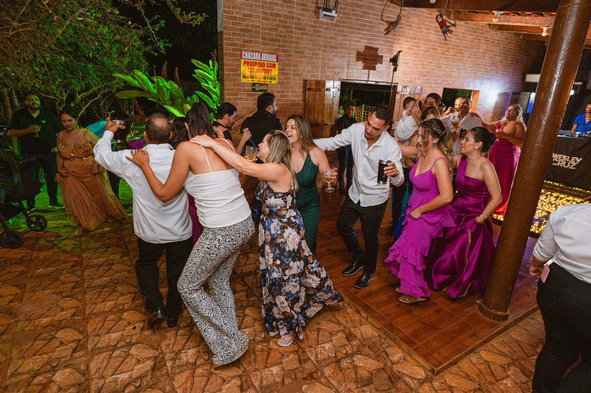 Enfim, era a hora de os noivos serem recebidos na pistas de dança. O cerimonial os anunciou e com fogos de artifício eles foram recepcionados na pista de dança com muita música, copo na mão e muita comemoração. Eles agradeceram aos presentes e realizaram sua primeira dança de casados. Depois, convidaram todos os padrinhos para a foto oficial e também para juntarem-se na pista de dança para curtir. Fizemos também as fotografias dos convidados na mesa do bolo e deixamos o noivo à vontade. A tarde estava maravilhosa, os convidados curtiam muito cada pedacinho do sítio. Bianca cumprimentou seus convidados indo nas mesas enquanto Leonardo passava a gravata. E foi tão bacana que arrancaram até um pedaço da cueca dele, bem no rumo do bumbum.