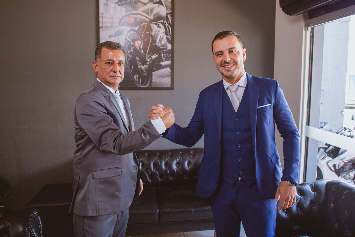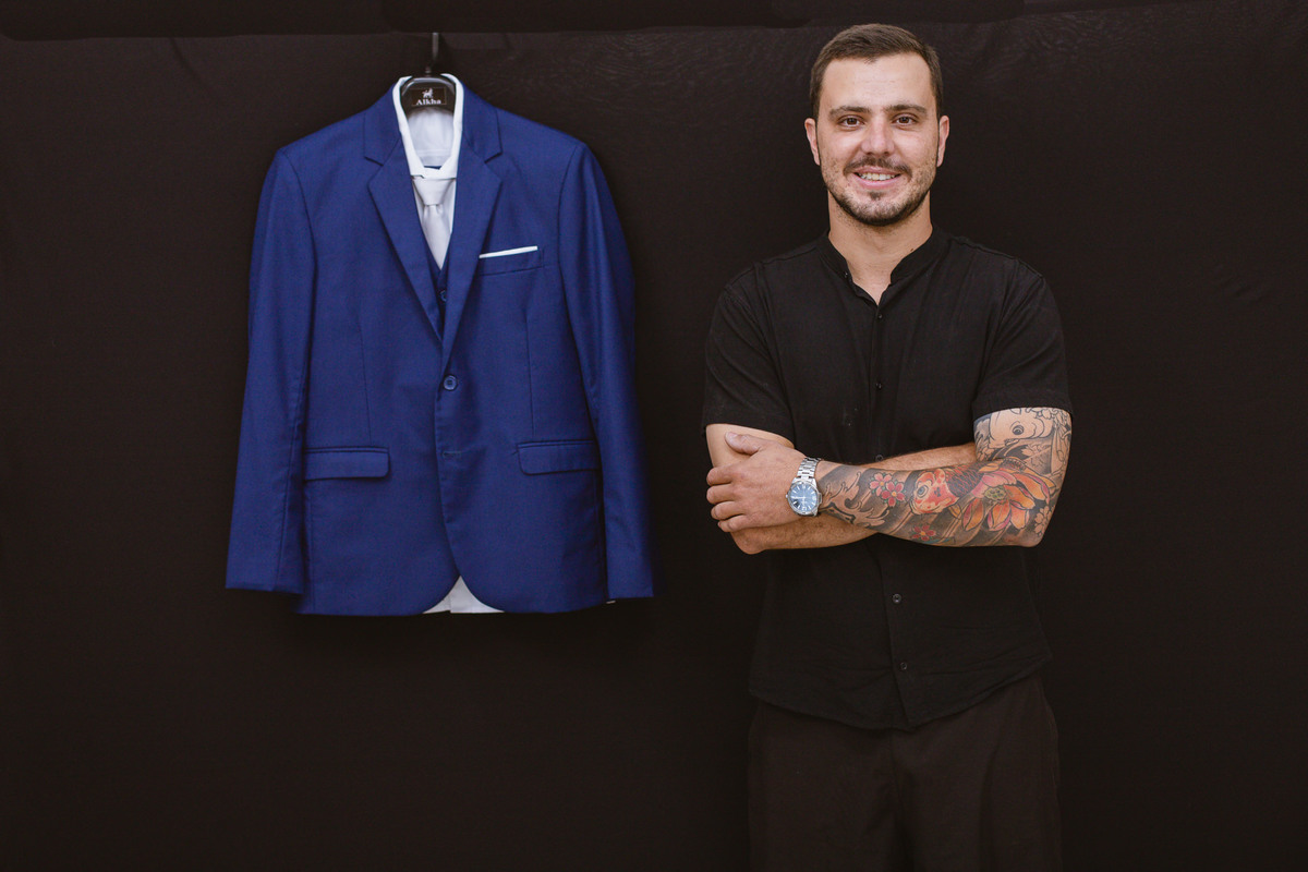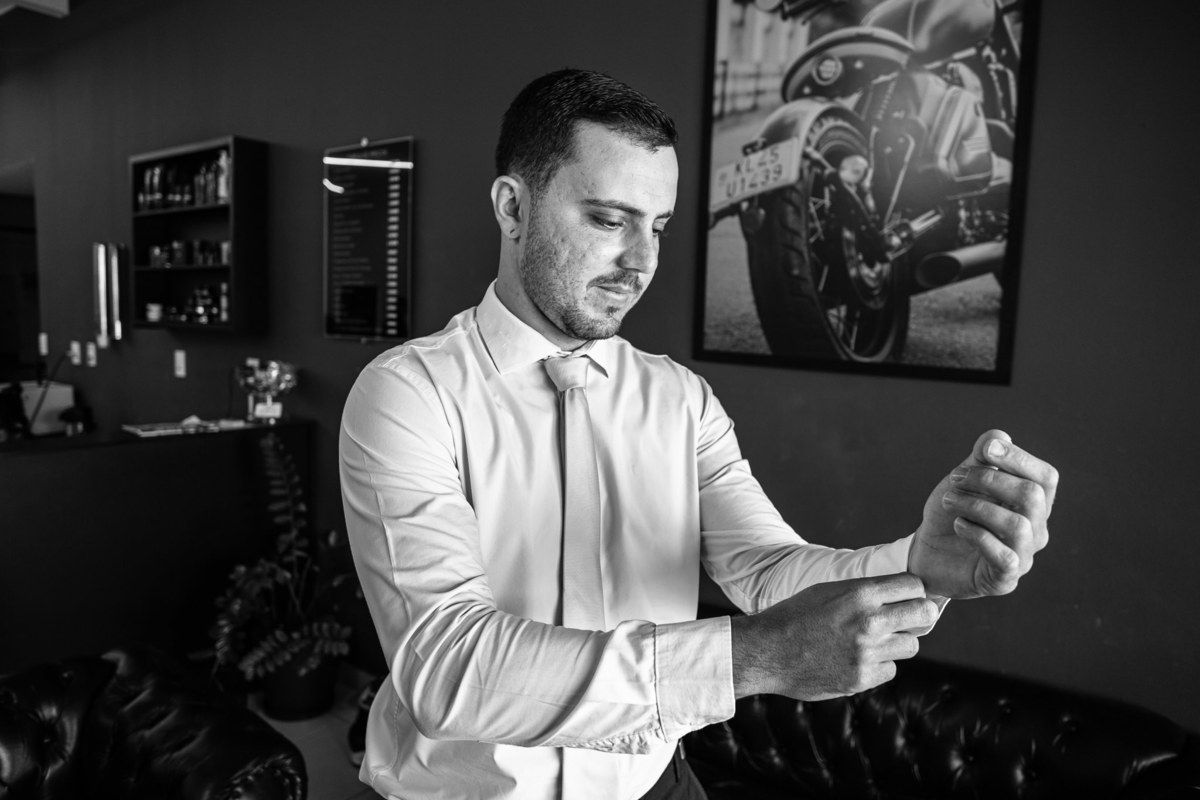 Enquanto Bianca fazia toda a sua produção, do lado de lá da cidade estava Leonardo, todo feliz com seus amigos, padrinhos e parentes. Eles aproveitavam o tempo que sobrava para jogar sinuca, beber uma cerveja juntos e conversar sobre o grande dia. Seu pai, seu irmão e o sogro o acompanhavam também. Depois de fazer a barba e dar aquele talento no penteado, era hora de colocar o seu traje oficial e abandonar os amigos. Seu irmão e seu pai o ajudaram com os últimos ajustes ao colocar o terno. Com um forte abraço nos dois, Leonardo agradeceu a companhia e a força nesse momento de emoção. Depois de tudo pronto, fizemos algumas fotografias deles reunidos e partimos para a Igreja.