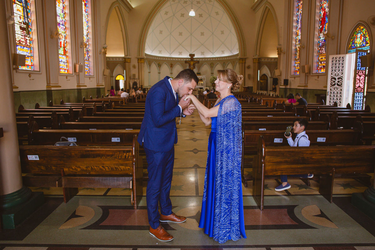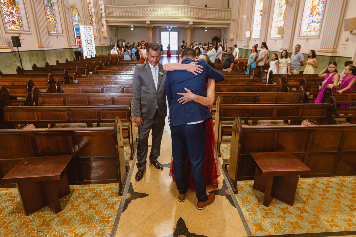 Bianca e Leonardo escolheram a Igreja dos Capuchinhos para ser a Igreja do seu grande dia. Lá chegando, os padrinhos já estavam sendo posicionados pela competente equipe de cerimonial Dani Benhures. Os músicos acertavam os últimos acordes antes de iniciar. Bianca chegou e prontamente fizemos nossas tradicionais fotografias da noiva no carro. E tinha companhia coladinha com ela. Despedimo-nos momentaneamente da noiva e fomos para o altar. A cerimônia teve seu início pontualmente. O primeiro a entrar foi Leonardo, de braços dados com sua mãe. Ao final do corredor, ele despediu-se dela com todo carinho e um respeitoso beijo em sua fronte. Ele recebeu também, logo após, o seu pai e sua sogra, com um carinhoso abraço nos dois.