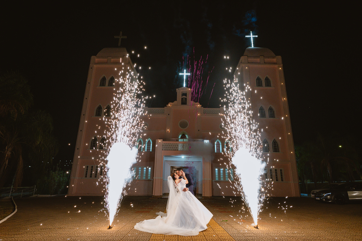 Eles ainda comungaram juntos e receberam a bênção final, sendo declarados casados perante Deus e suas testemunhas. Assinaram os documentos e fizemos nossas fotografias protocolares. Encerrando a cerimônia, do lado de fora os padrinhos já aguardavam a chegada dos recém-casados. Com sparkles nas mãos, eles receberam os dois com muita festa. Os padrinhos foram para a recepção e ficamos com o casal para fazermos nossas fotografias. Eles prepararam uma queima de fogos exclusiva para o mini ensaio. Posicionamos em frente à Igreja e a equipe de efeitos especiais deu seu show, trazendo chuva de prata e fogos para cima. Ficou espetacular! Depois, nos encaminhamos para o Music Hall, onde a festa estava acontecendo. Thais e Daniel foram anunciados no som e os padrinhos já os aguardavam na pista de dança, com suas taças para brindarem juntos. Eles entraram com muito som, festa e palmas. Agradeceram a presença de todos e fizemos uma foto linda do brinde.