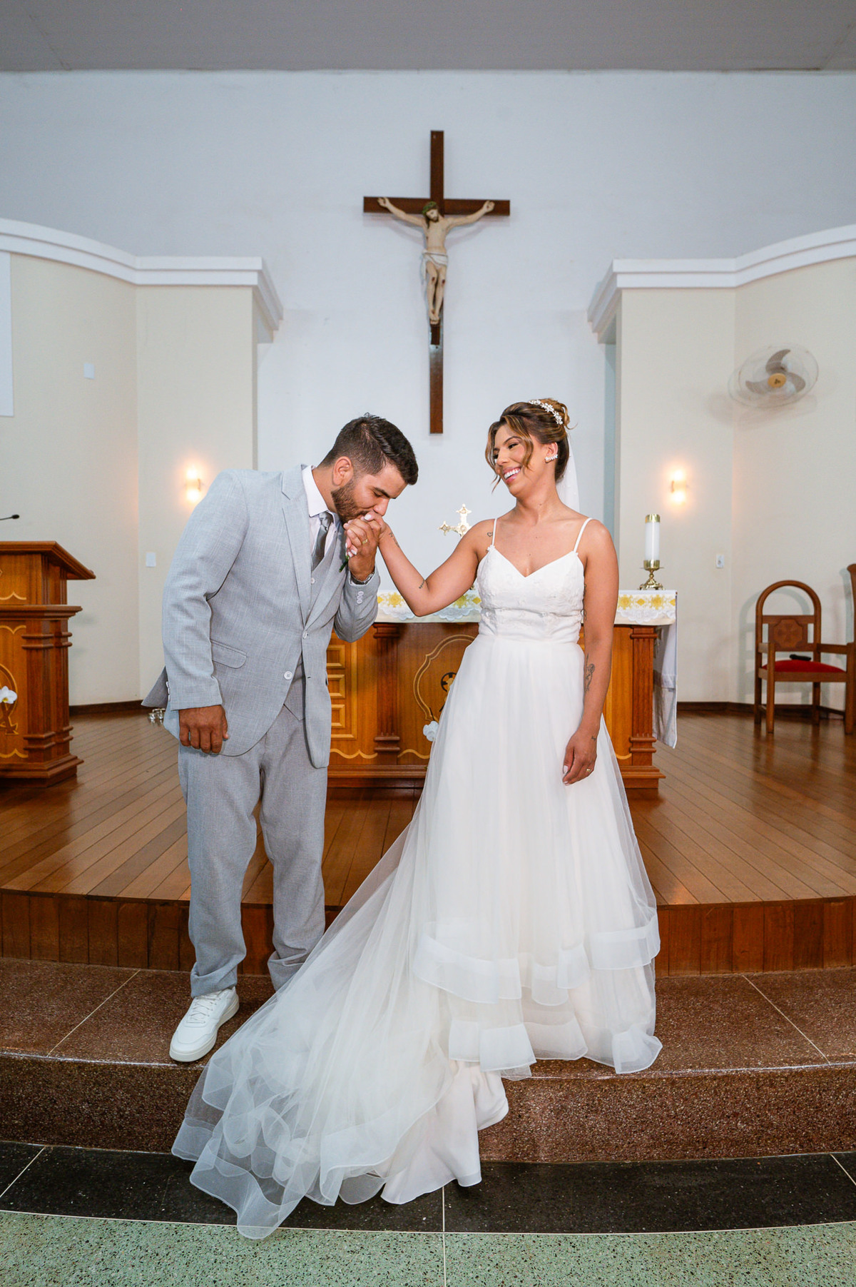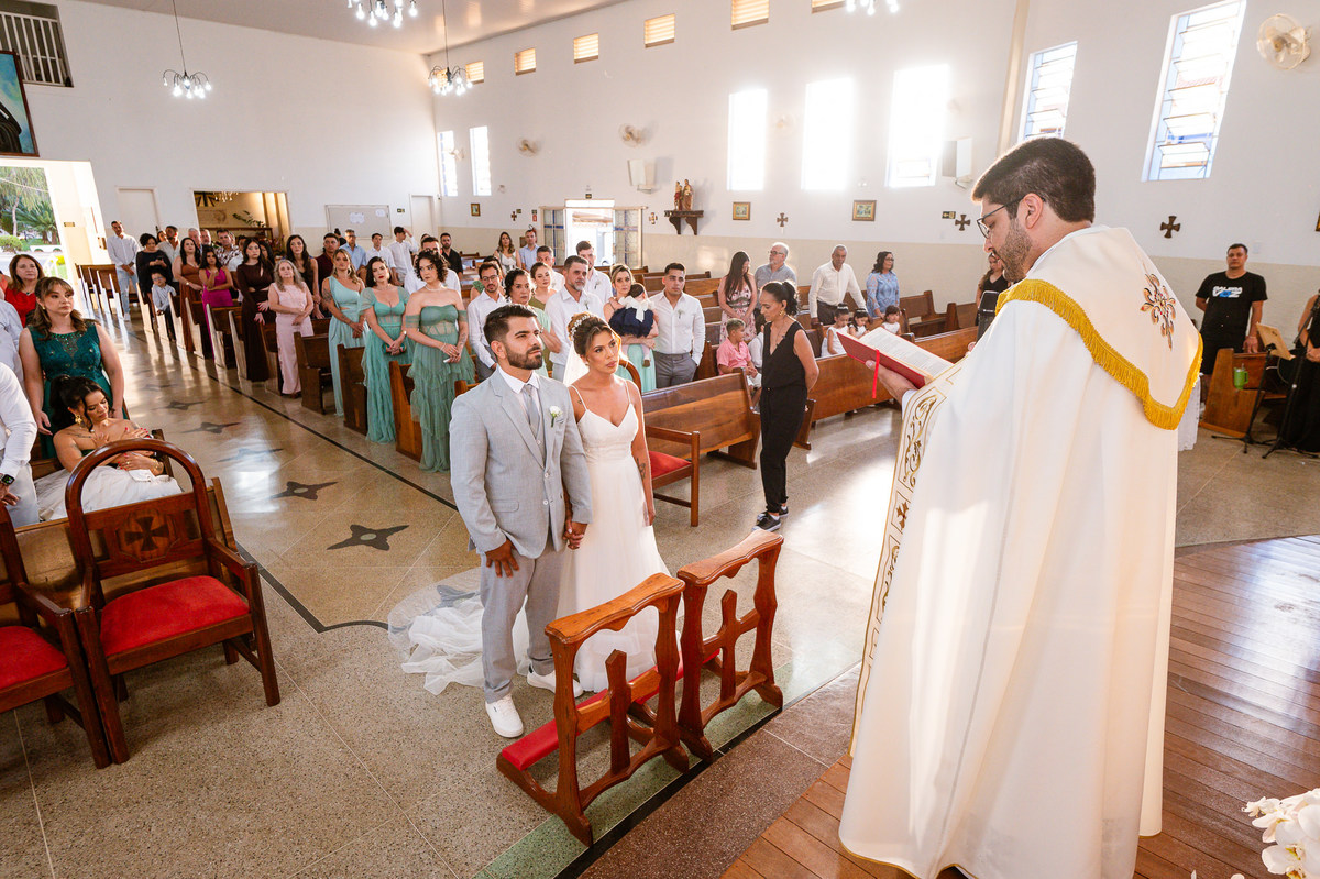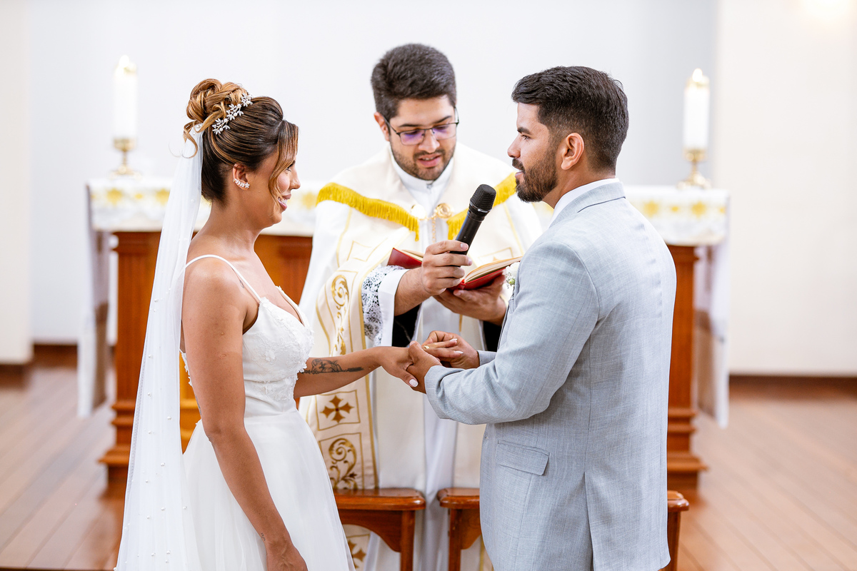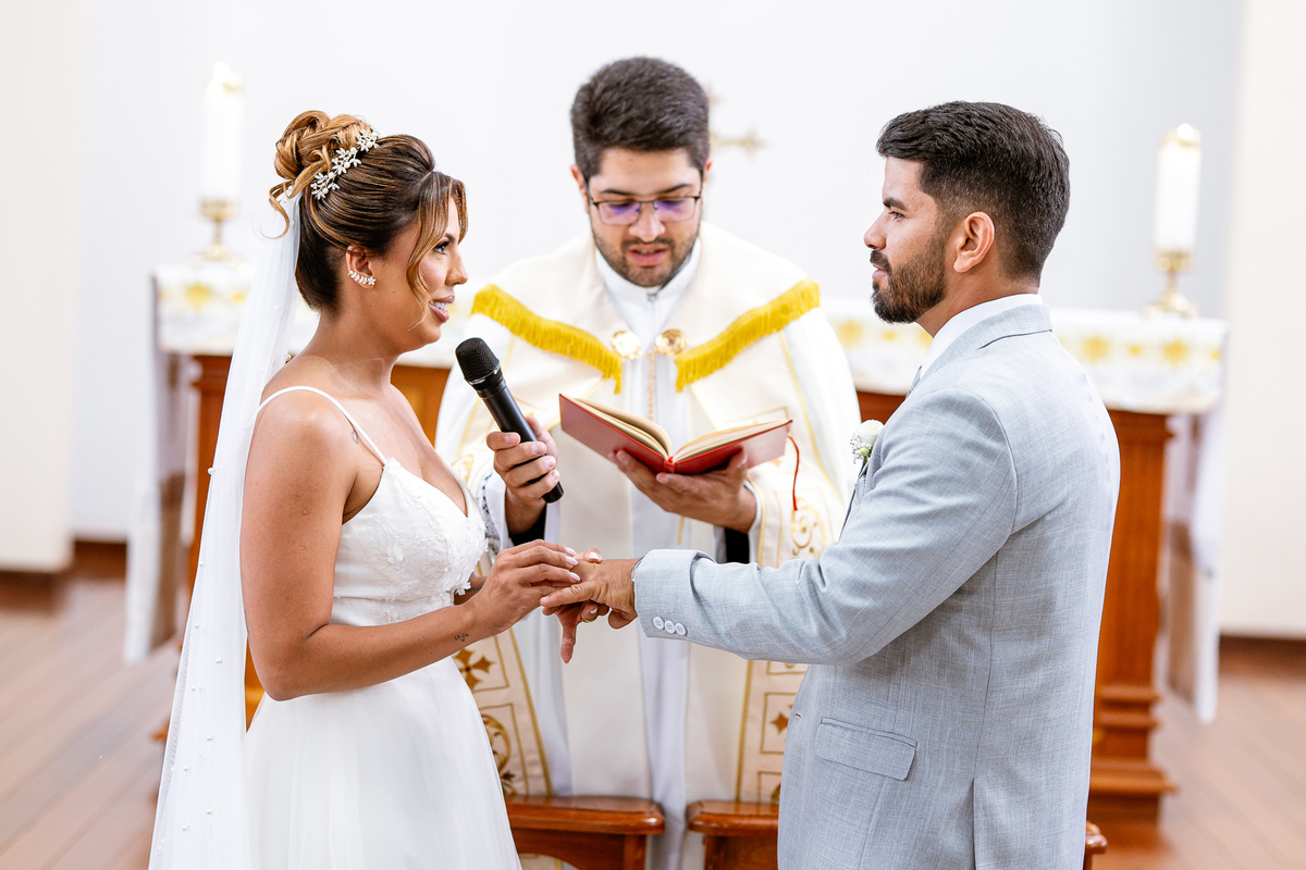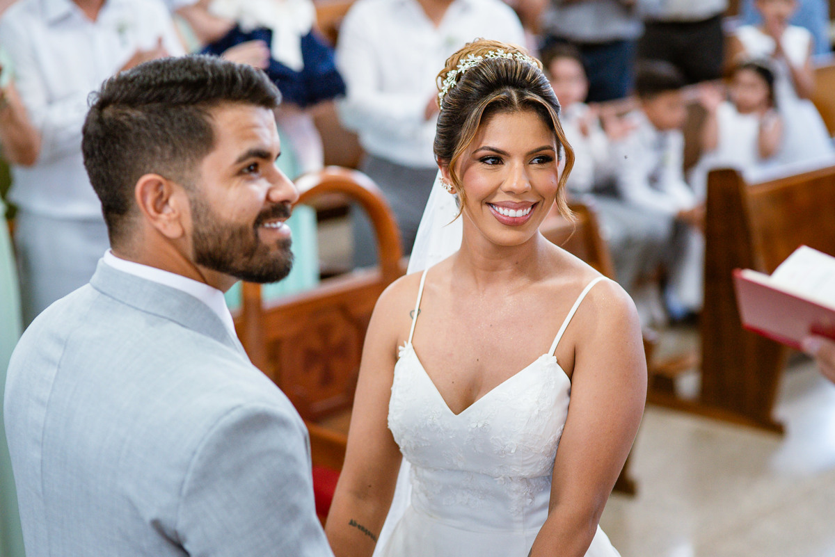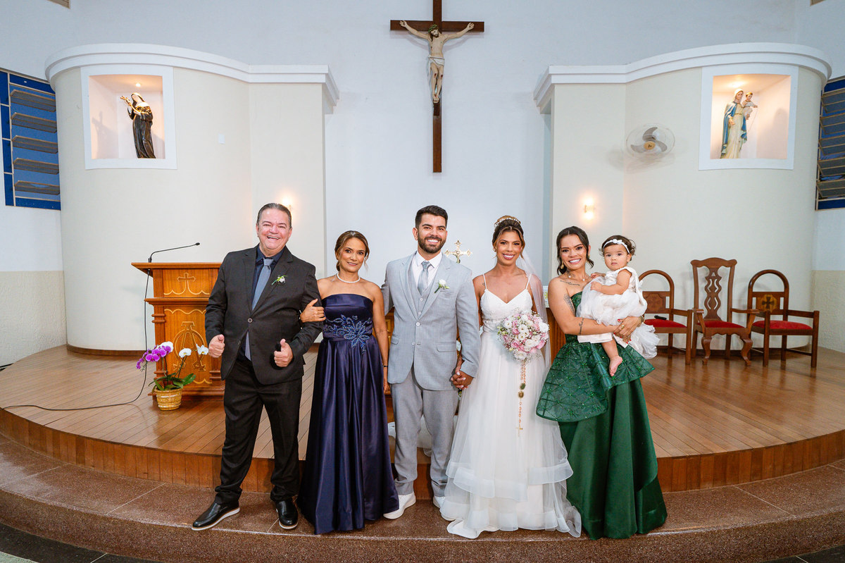 Poucos passos adiante e eles estavam prontos para se encontrar. Bheatriz despediu-se de Matheus. Rayan se aproximou, sendo recebido com um carinhoso abraço do Matheuzinho. Enfim, eram somente noivo e noiva frente a frente. Os olhares de amor e felicidade eram os únicos que se entrelaçavam naquele instante. Com um carinhoso beijo, Rayan selou aquele momento para sempre. Eles agora caminharam juntos, rumo ao altar para depois saírem dali como uma só carne. O padre os recebeu carinhosamente e trouxe uma palavra edificante e que os noivos lembrarão para sempre do que foi dito na homilia. Depois, ele os convidou a trocarem seus votos de amor eterno um para o outro. Convidou as alianças para serem trazidas, as ungiu com a água benta e pediu para que os dois colocassem um no dedo do outro. Com as palavras repetidas por eles, os dois juraram seu amor e fidelidade eternas. Com muitas palmas e festa, Bheatriz e Rayan foram declarados casados perante Deus e as testemunhas. Eles assinaram os documentos e fizemos nossas tradicionais fotografias com os padrinhos e parentes dos dois. Posteriormente, a fila de padrinhos foi formada do lado de fora da Igreja. Com muitas bolhinhas de sabão, os recém-casados foram recebidos com muita festa. Eles se despediram de alguns convidados e partimos pro nosso mini ensaio de casados.