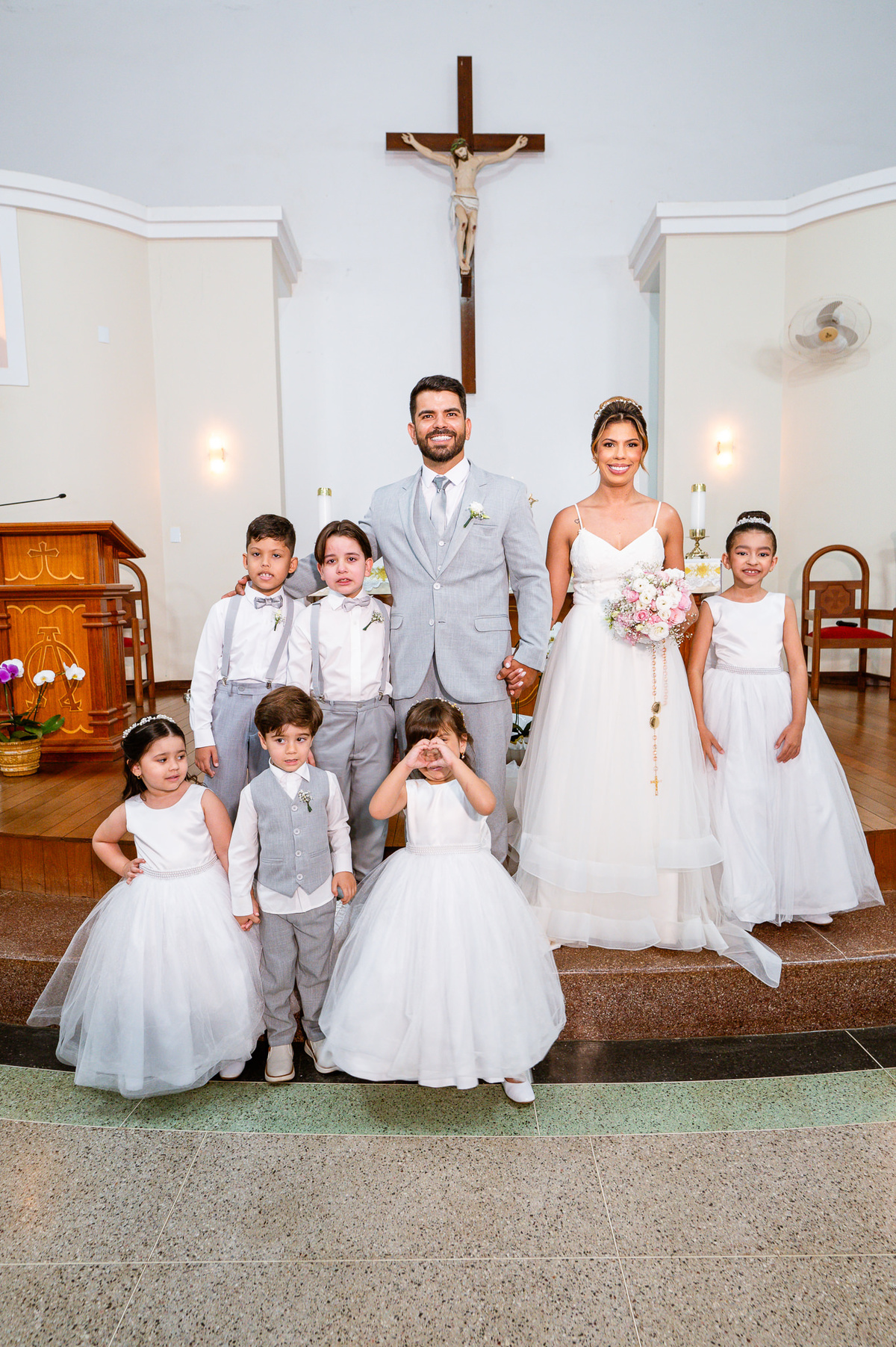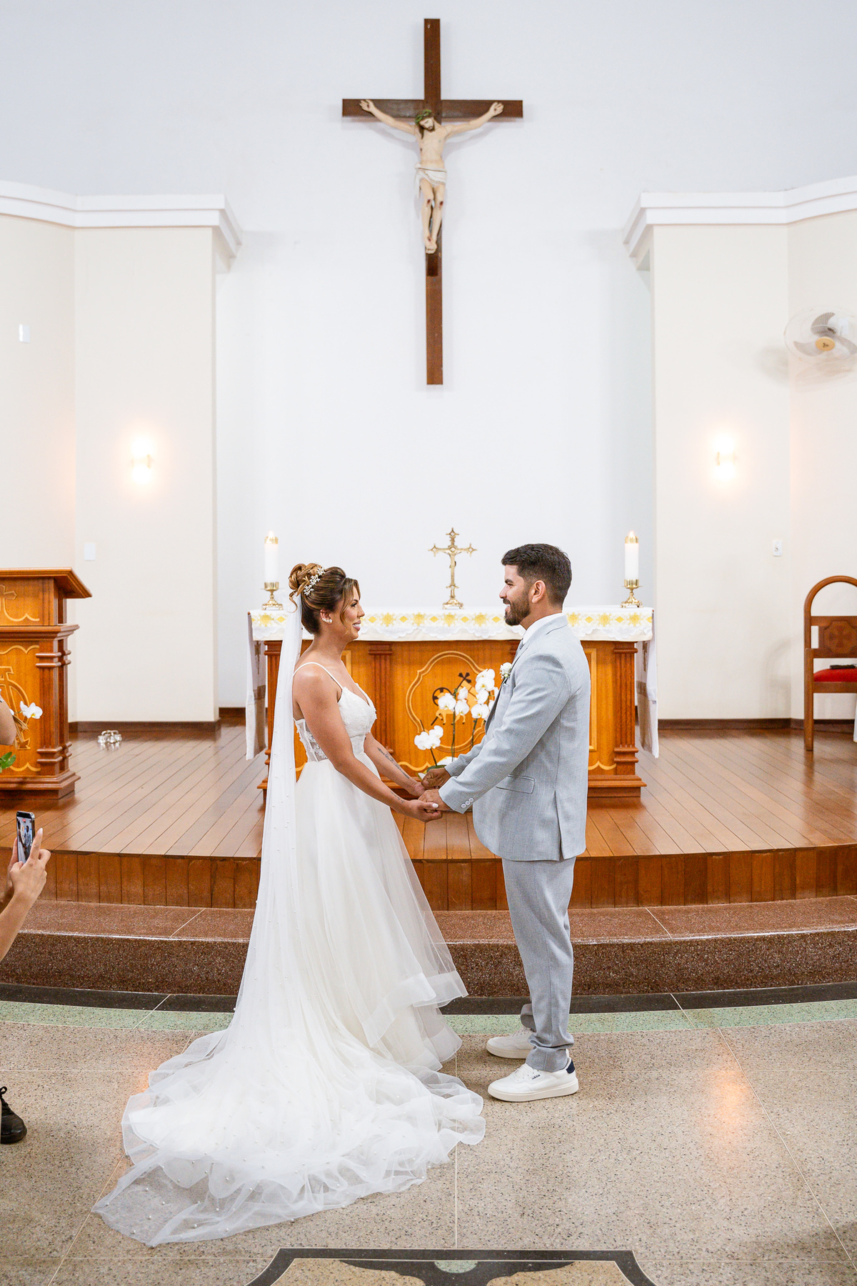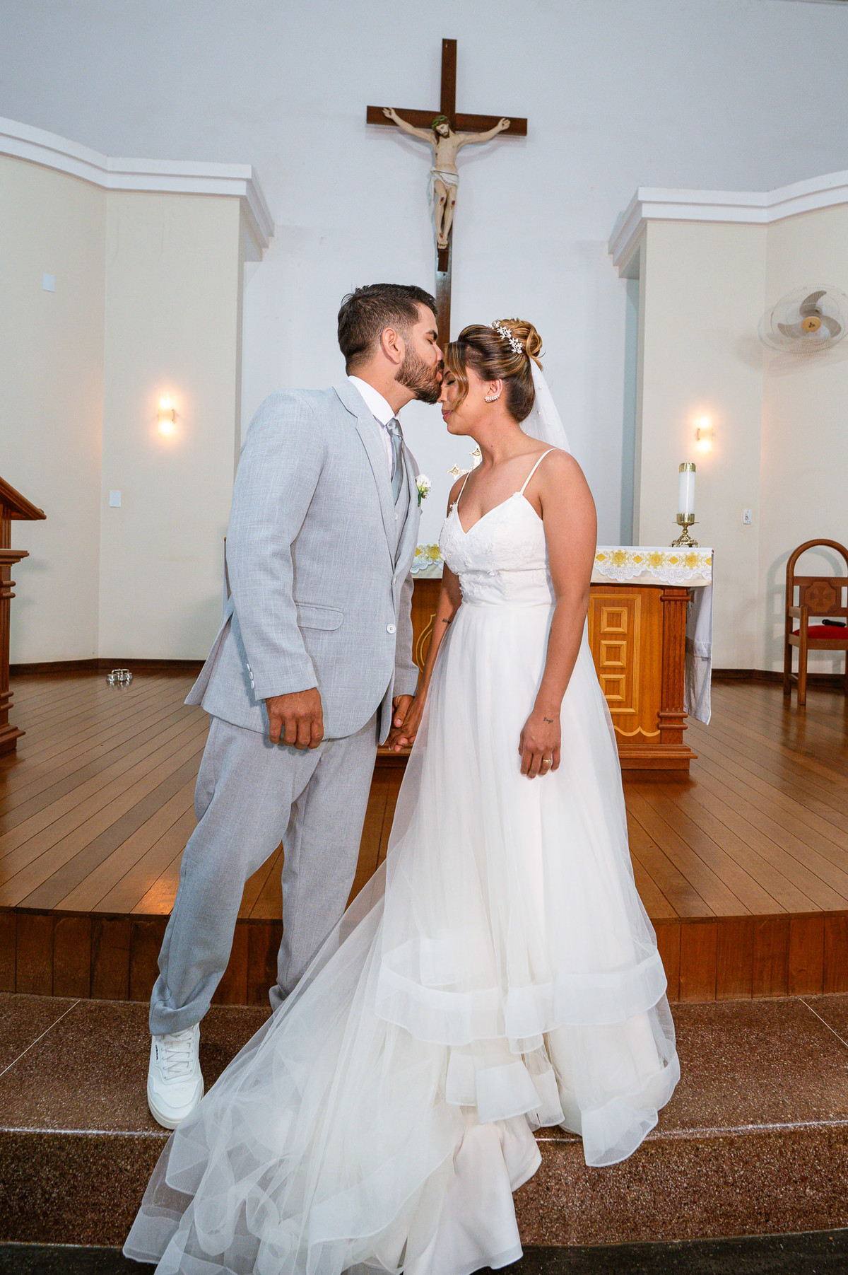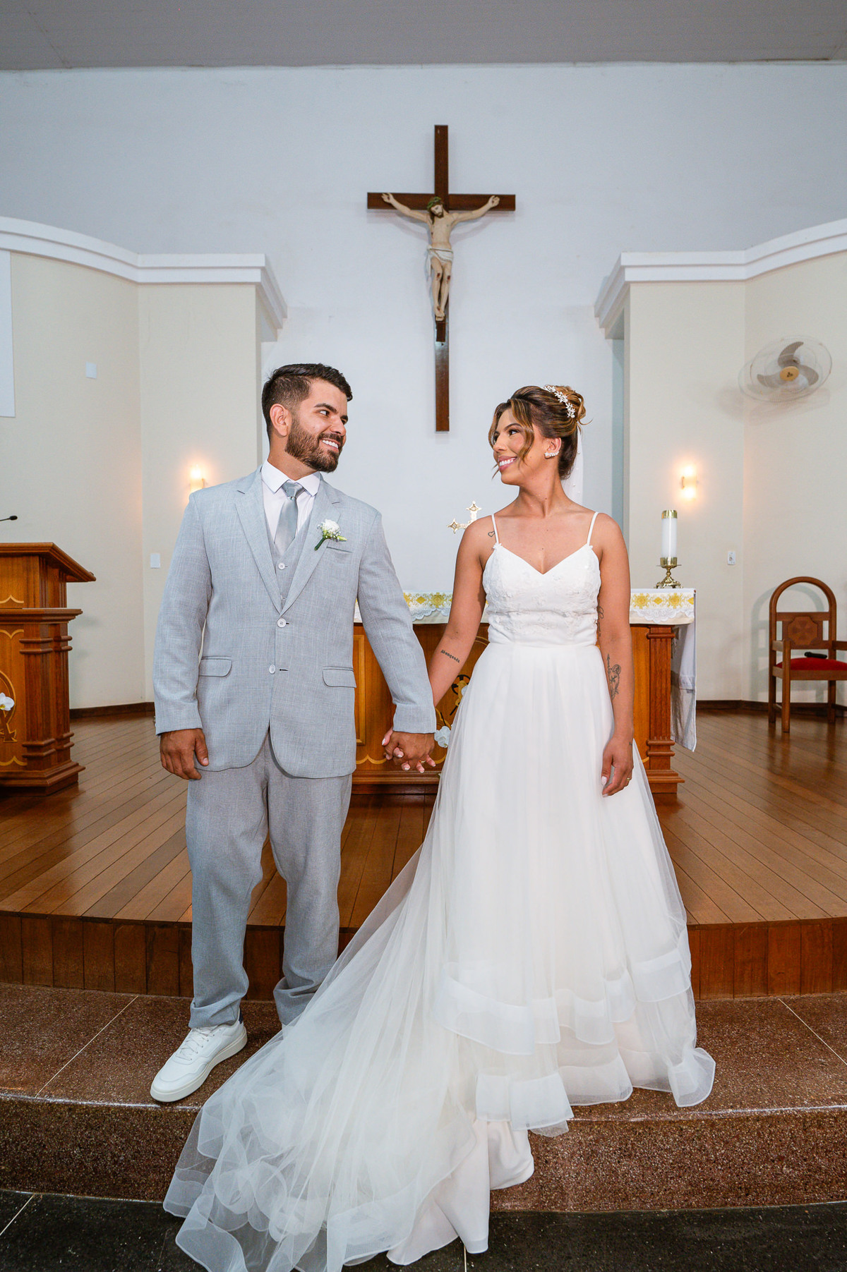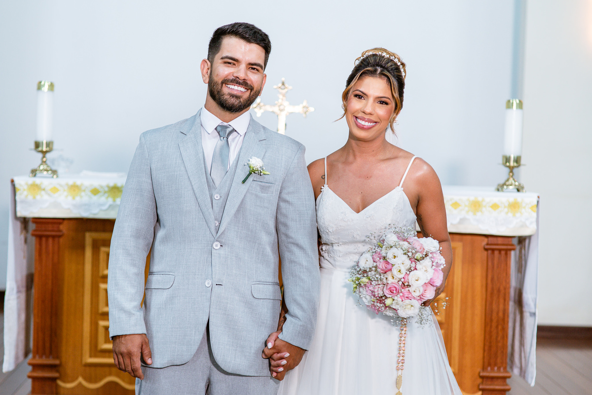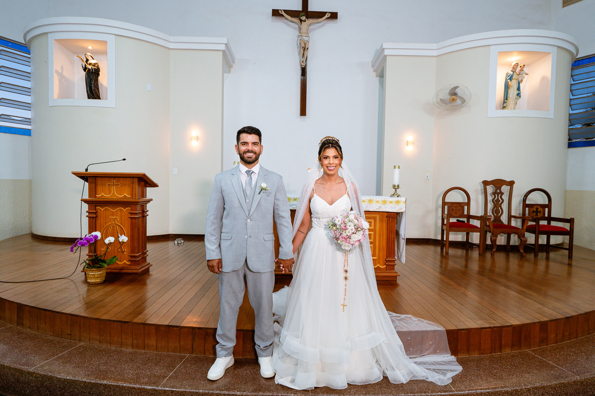 Poucos passos adiante e eles estavam prontos para se encontrar. Bheatriz despediu-se de Matheus. Rayan se aproximou, sendo recebido com um carinhoso abraço do Matheuzinho. Enfim, eram somente noivo e noiva frente a frente. Os olhares de amor e felicidade eram os únicos que se entrelaçavam naquele instante. Com um carinhoso beijo, Rayan selou aquele momento para sempre. Eles agora caminharam juntos, rumo ao altar para depois saírem dali como uma só carne. O padre os recebeu carinhosamente e trouxe uma palavra edificante e que os noivos lembrarão para sempre do que foi dito na homilia. Depois, ele os convidou a trocarem seus votos de amor eterno um para o outro. Convidou as alianças para serem trazidas, as ungiu com a água benta e pediu para que os dois colocassem um no dedo do outro. Com as palavras repetidas por eles, os dois juraram seu amor e fidelidade eternas. Com muitas palmas e festa, Bheatriz e Rayan foram declarados casados perante Deus e as testemunhas. Eles assinaram os documentos e fizemos nossas tradicionais fotografias com os padrinhos e parentes dos dois. Posteriormente, a fila de padrinhos foi formada do lado de fora da Igreja. Com muitas bolhinhas de sabão, os recém-casados foram recebidos com muita festa. Eles se despediram de alguns convidados e partimos pro nosso mini ensaio de casados.