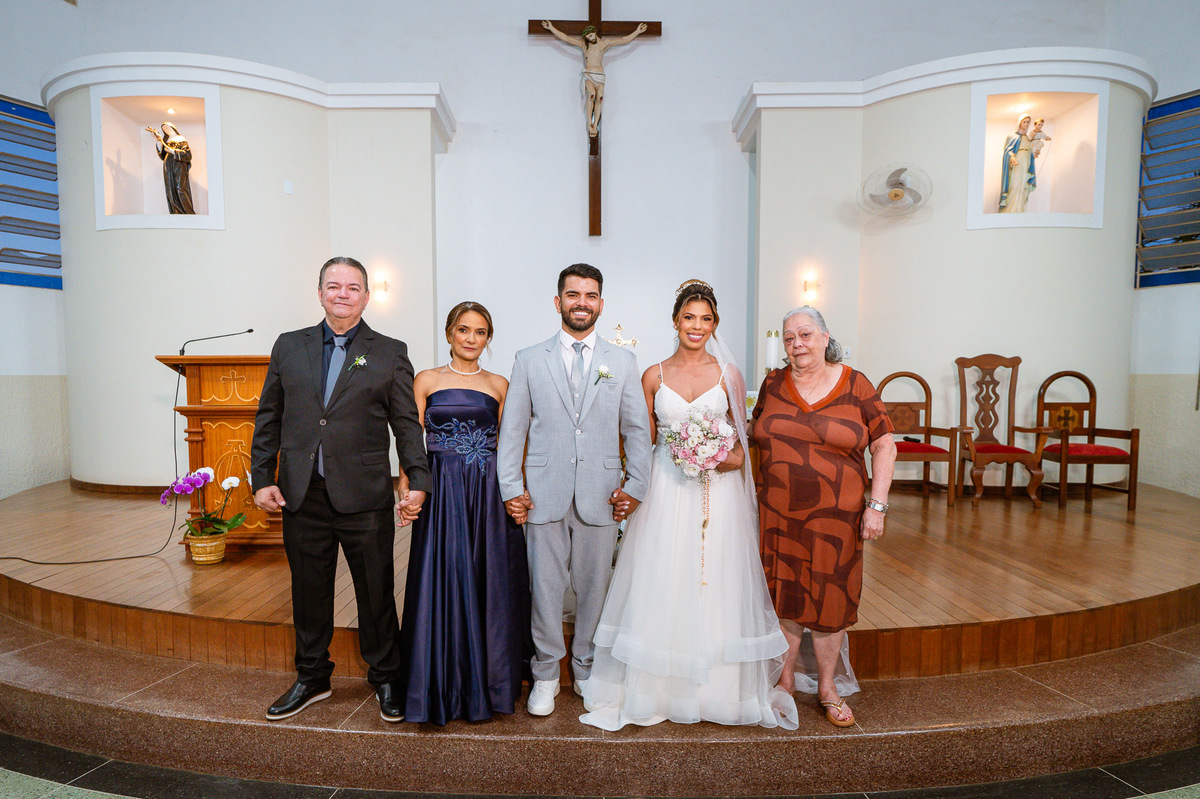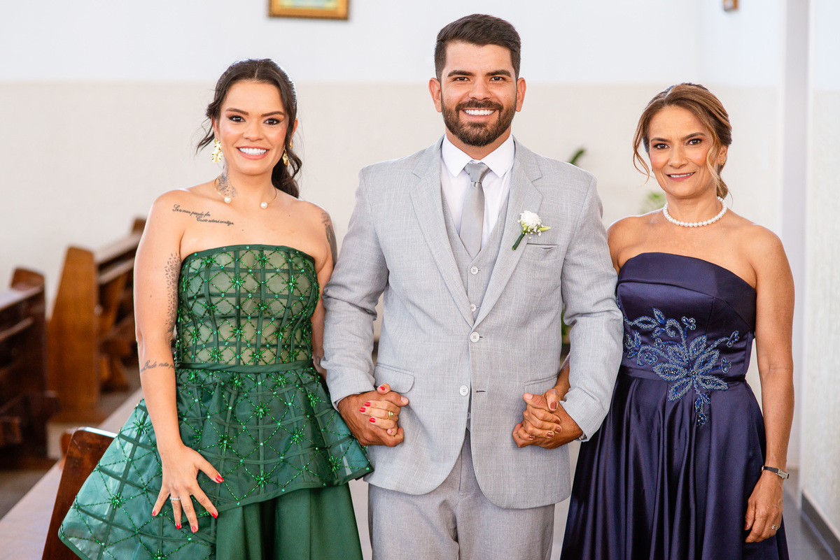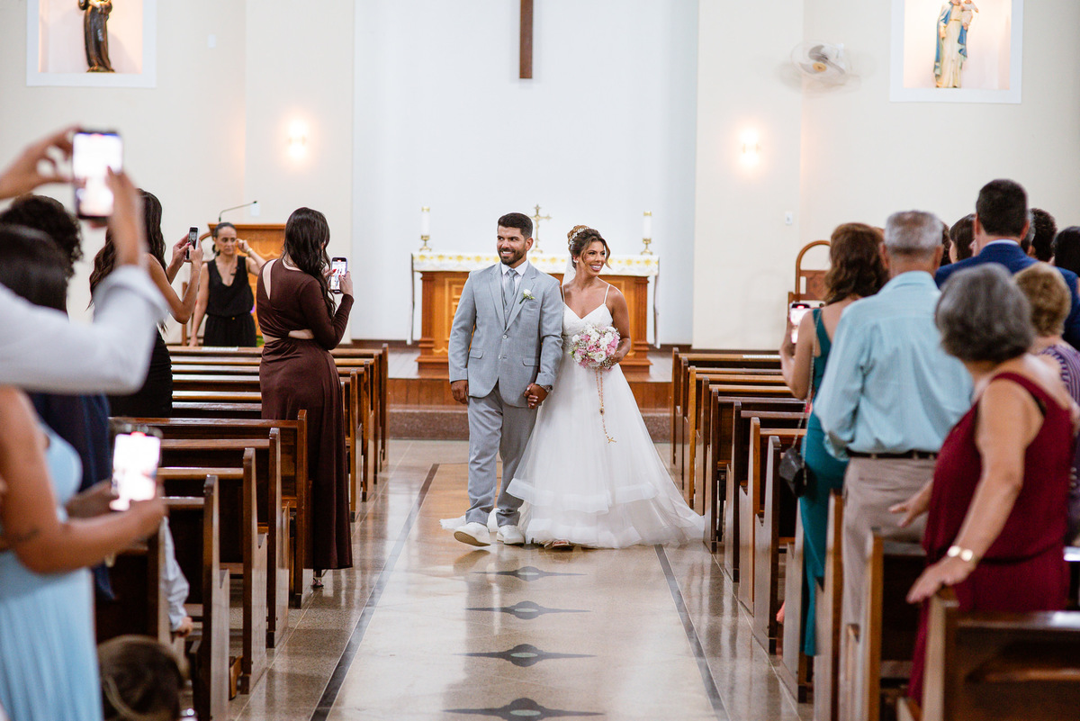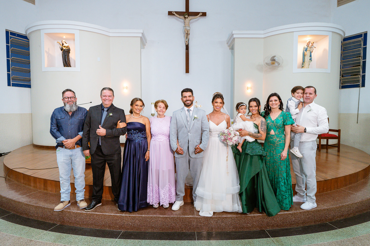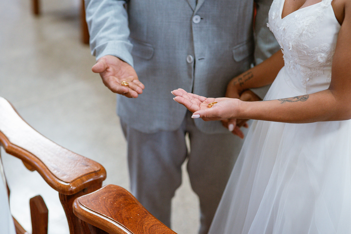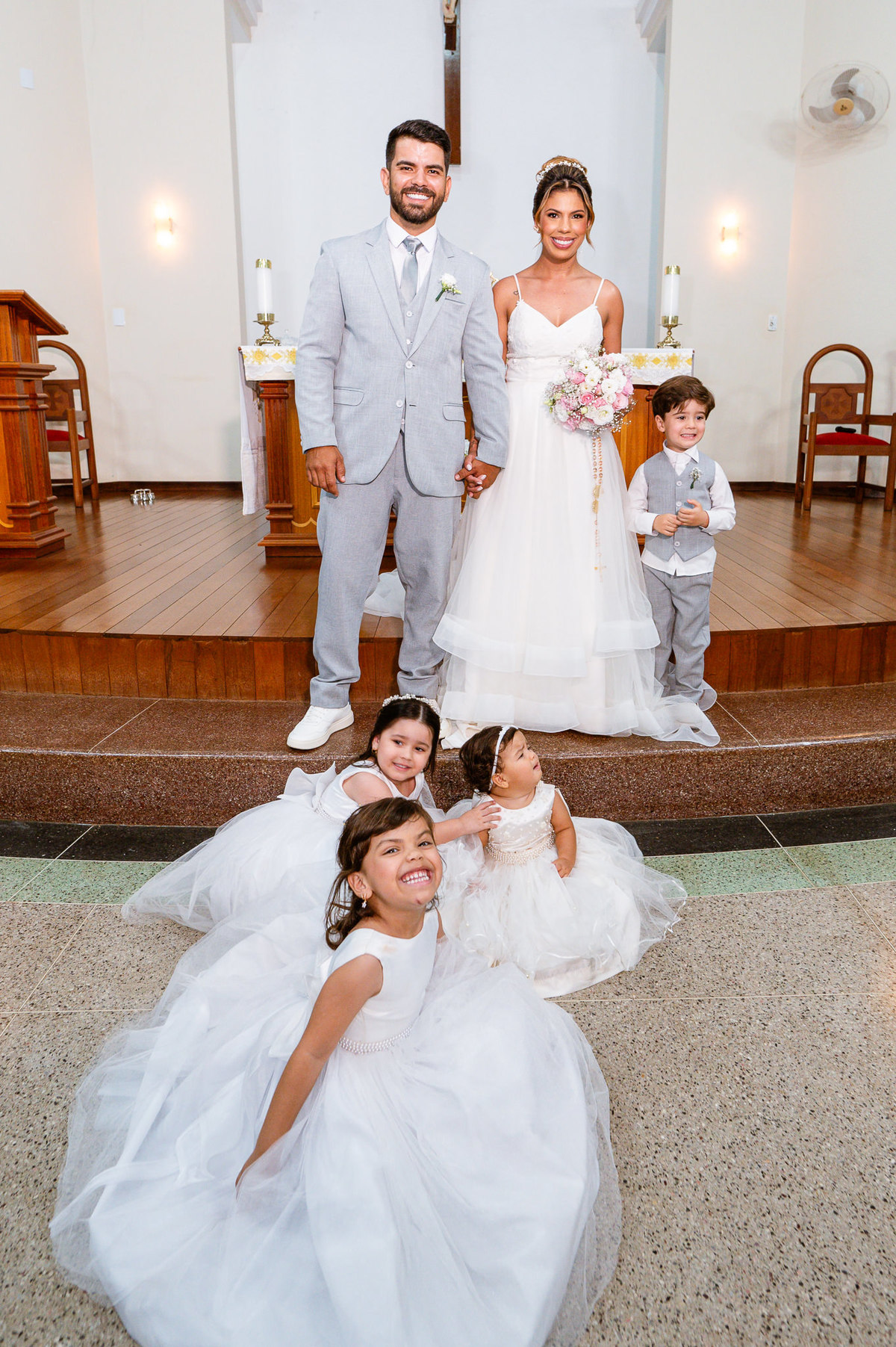 Poucos passos adiante e eles estavam prontos para se encontrar. Bheatriz despediu-se de Matheus. Rayan se aproximou, sendo recebido com um carinhoso abraço do Matheuzinho. Enfim, eram somente noivo e noiva frente a frente. Os olhares de amor e felicidade eram os únicos que se entrelaçavam naquele instante. Com um carinhoso beijo, Rayan selou aquele momento para sempre. Eles agora caminharam juntos, rumo ao altar para depois saírem dali como uma só carne. O padre os recebeu carinhosamente e trouxe uma palavra edificante e que os noivos lembrarão para sempre do que foi dito na homilia. Depois, ele os convidou a trocarem seus votos de amor eterno um para o outro. Convidou as alianças para serem trazidas, as ungiu com a água benta e pediu para que os dois colocassem um no dedo do outro. Com as palavras repetidas por eles, os dois juraram seu amor e fidelidade eternas. Com muitas palmas e festa, Bheatriz e Rayan foram declarados casados perante Deus e as testemunhas. Eles assinaram os documentos e fizemos nossas tradicionais fotografias com os padrinhos e parentes dos dois. Posteriormente, a fila de padrinhos foi formada do lado de fora da Igreja. Com muitas bolhinhas de sabão, os recém-casados foram recebidos com muita festa. Eles se despediram de alguns convidados e partimos pro nosso mini ensaio de casados.