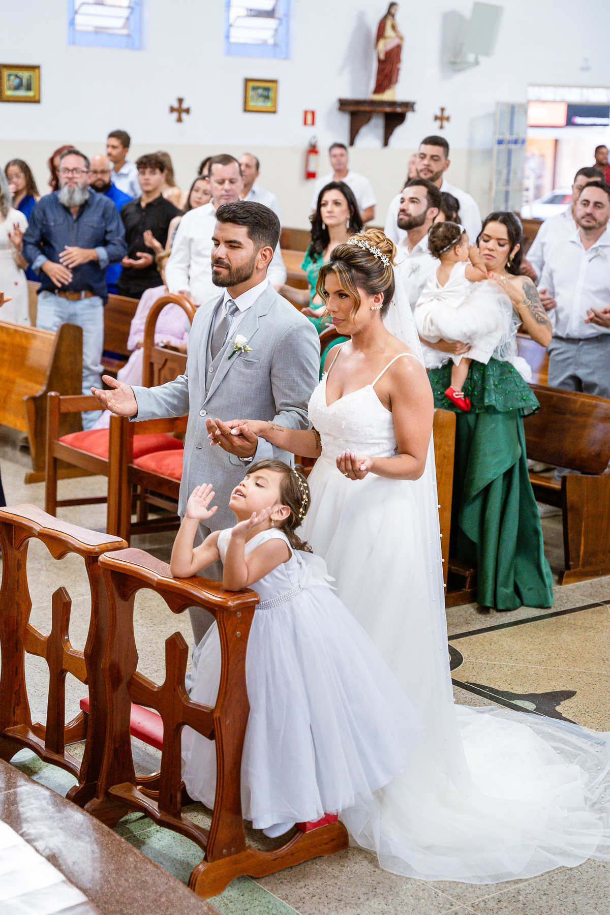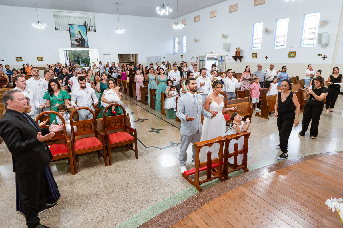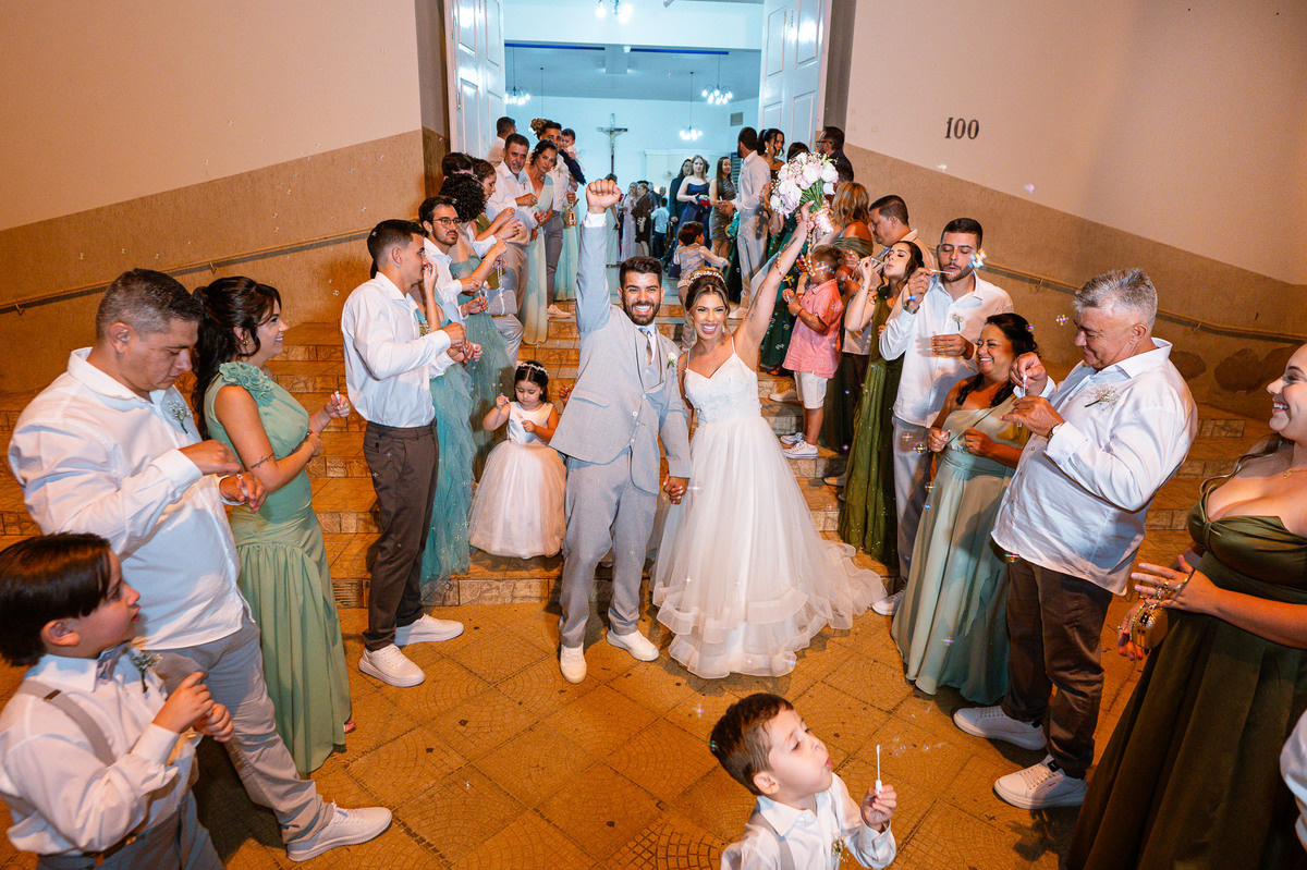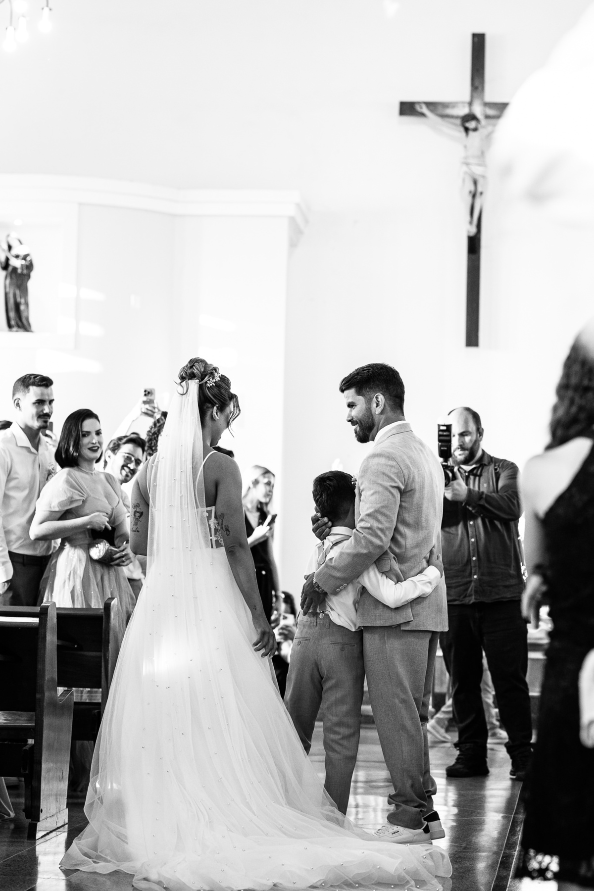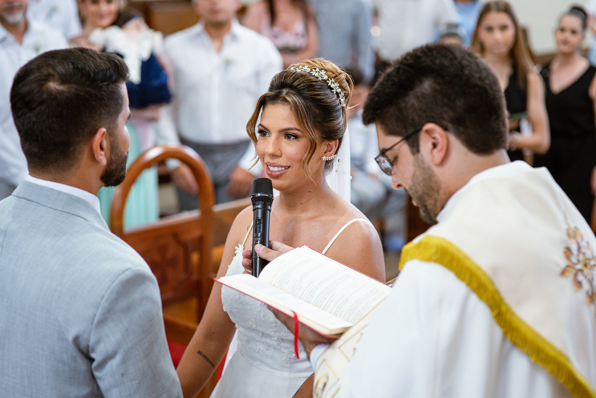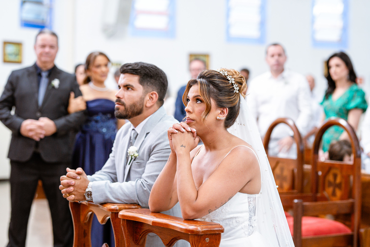 Poucos passos adiante e eles estavam prontos para se encontrar. Bheatriz despediu-se de Matheus. Rayan se aproximou, sendo recebido com um carinhoso abraço do Matheuzinho. Enfim, eram somente noivo e noiva frente a frente. Os olhares de amor e felicidade eram os únicos que se entrelaçavam naquele instante. Com um carinhoso beijo, Rayan selou aquele momento para sempre. Eles agora caminharam juntos, rumo ao altar para depois saírem dali como uma só carne. O padre os recebeu carinhosamente e trouxe uma palavra edificante e que os noivos lembrarão para sempre do que foi dito na homilia. Depois, ele os convidou a trocarem seus votos de amor eterno um para o outro. Convidou as alianças para serem trazidas, as ungiu com a água benta e pediu para que os dois colocassem um no dedo do outro. Com as palavras repetidas por eles, os dois juraram seu amor e fidelidade eternas. Com muitas palmas e festa, Bheatriz e Rayan foram declarados casados perante Deus e as testemunhas. Eles assinaram os documentos e fizemos nossas tradicionais fotografias com os padrinhos e parentes dos dois. Posteriormente, a fila de padrinhos foi formada do lado de fora da Igreja. Com muitas bolhinhas de sabão, os recém-casados foram recebidos com muita festa. Eles se despediram de alguns convidados e partimos pro nosso mini ensaio de casados.