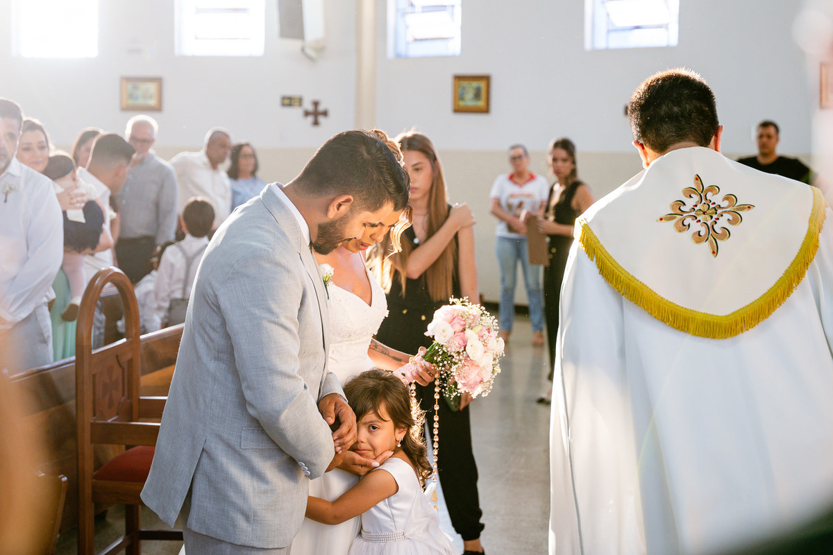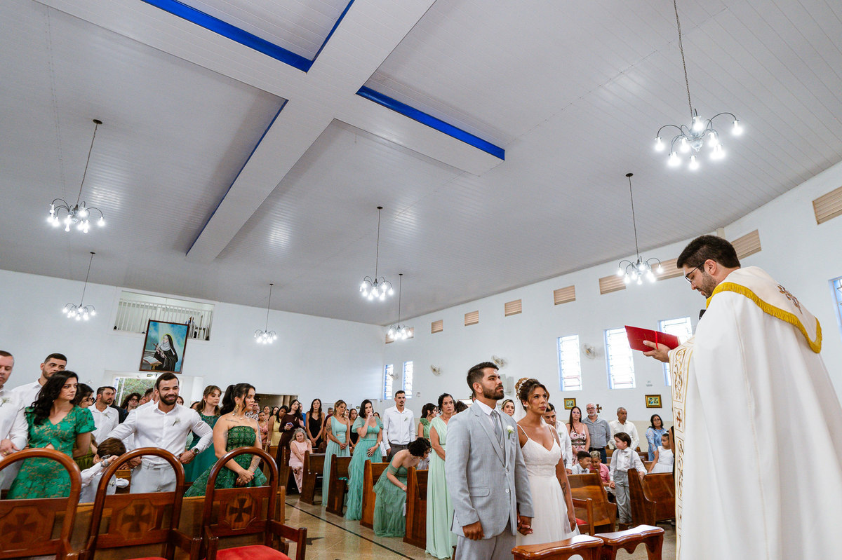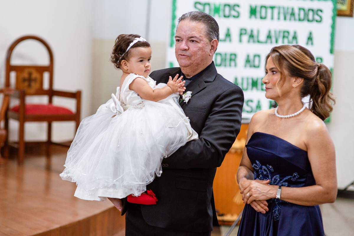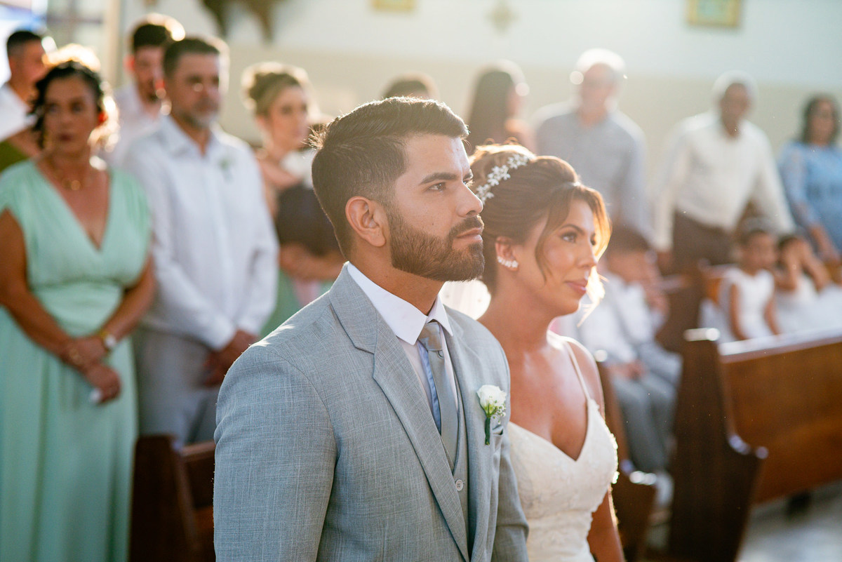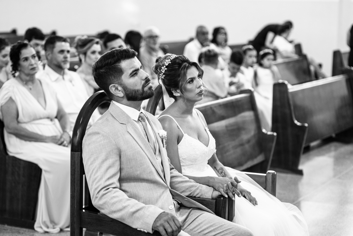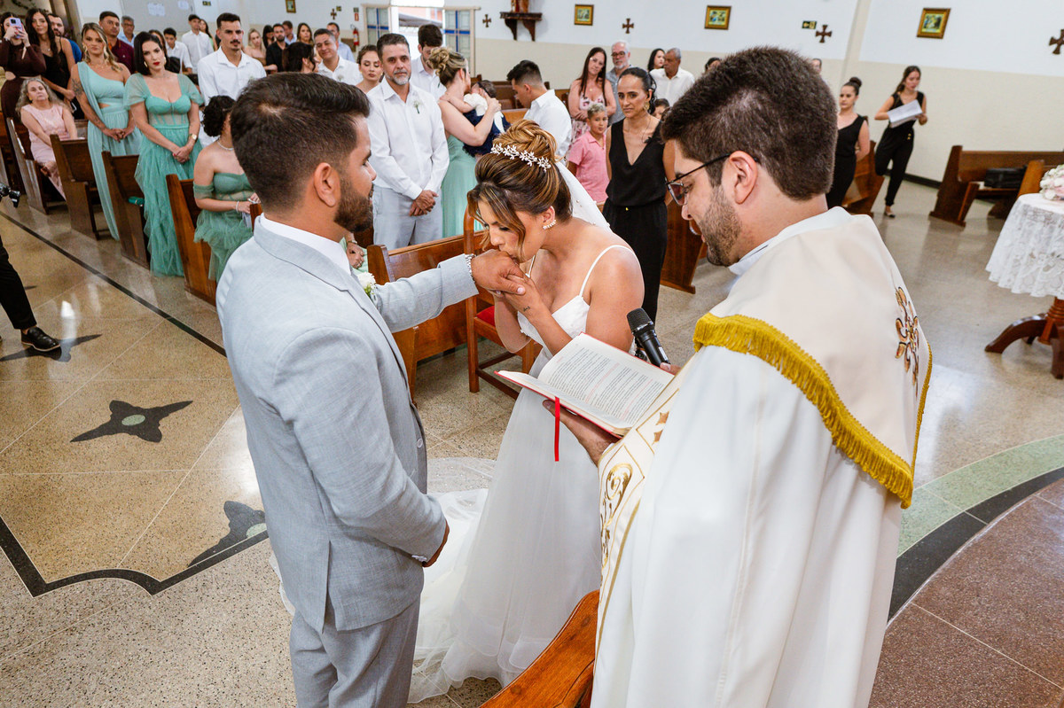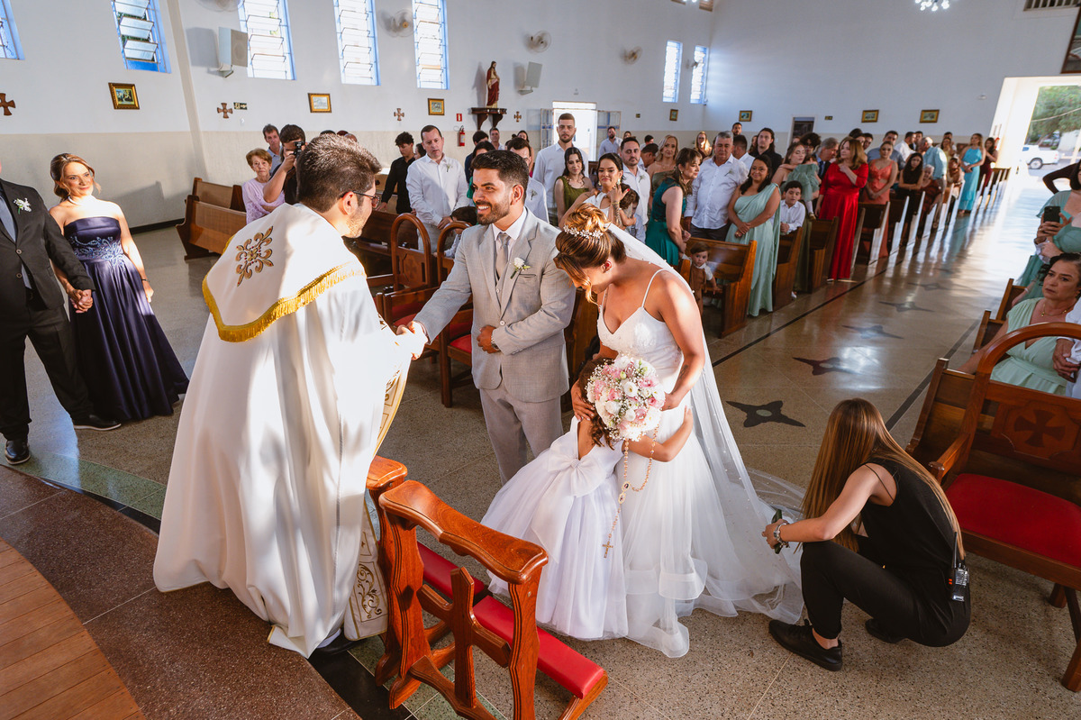Poucos passos adiante e eles estavam prontos para se encontrar. Bheatriz despediu-se de Matheus. Rayan se aproximou, sendo recebido com um carinhoso abraço do Matheuzinho. Enfim, eram somente noivo e noiva frente a frente. Os olhares de amor e felicidade eram os únicos que se entrelaçavam naquele instante. Com um carinhoso beijo, Rayan selou aquele momento para sempre. Eles agora caminharam juntos, rumo ao altar para depois saírem dali como uma só carne. O padre os recebeu carinhosamente e trouxe uma palavra edificante e que os noivos lembrarão para sempre do que foi dito na homilia. Depois, ele os convidou a trocarem seus votos de amor eterno um para o outro. Convidou as alianças para serem trazidas, as ungiu com a água benta e pediu para que os dois colocassem um no dedo do outro. Com as palavras repetidas por eles, os dois juraram seu amor e fidelidade eternas. Com muitas palmas e festa, Bheatriz e Rayan foram declarados casados perante Deus e as testemunhas. Eles assinaram os documentos e fizemos nossas tradicionais fotografias com os padrinhos e parentes dos dois. Posteriormente, a fila de padrinhos foi formada do lado de fora da Igreja. Com muitas bolhinhas de sabão, os recém-casados foram recebidos com muita festa. Eles se despediram de alguns convidados e partimos pro nosso mini ensaio de casados.
