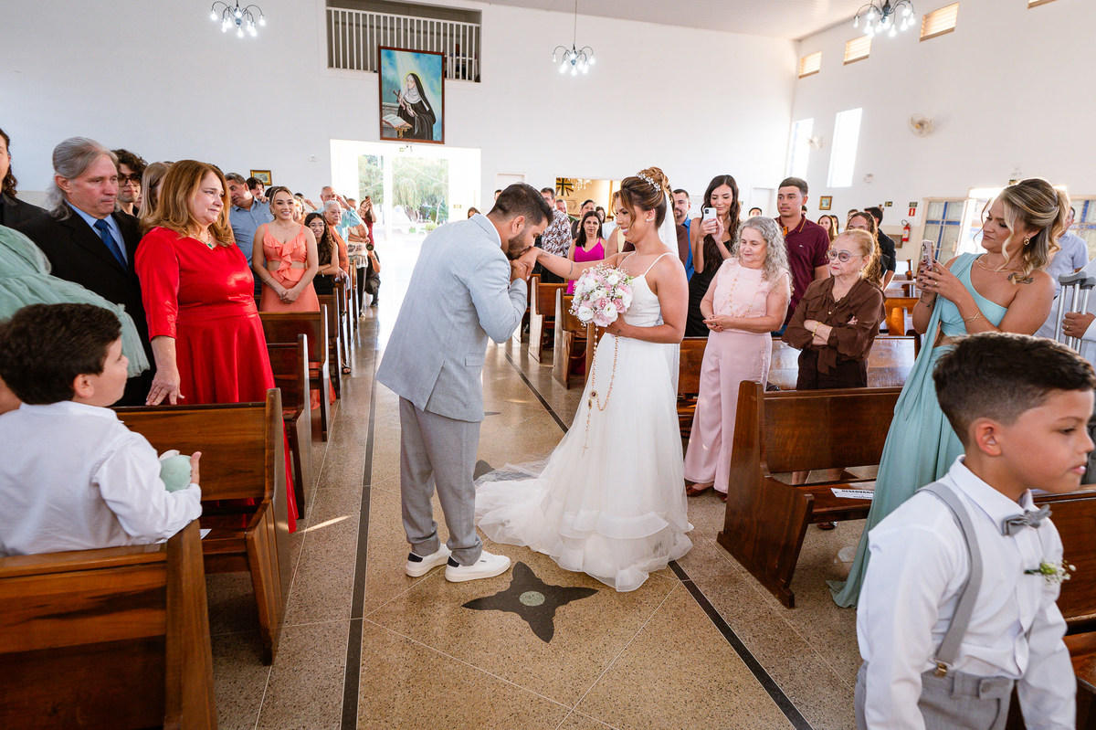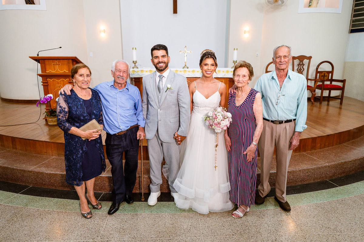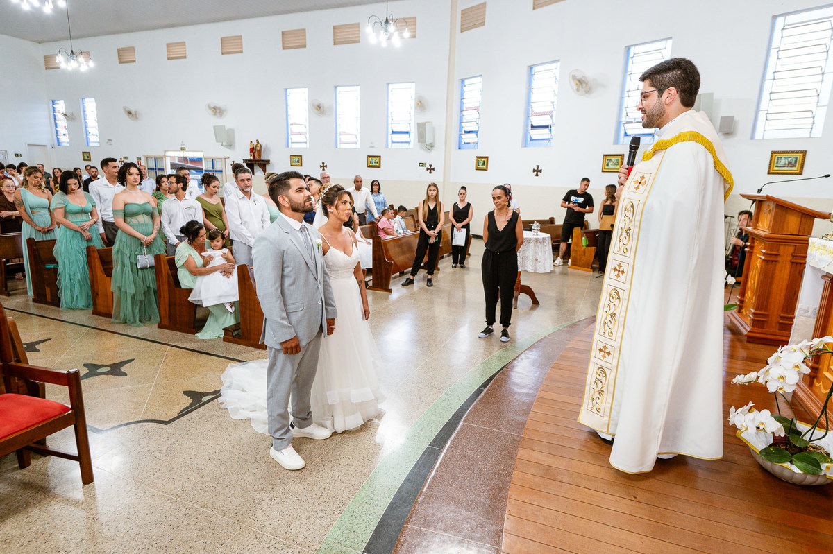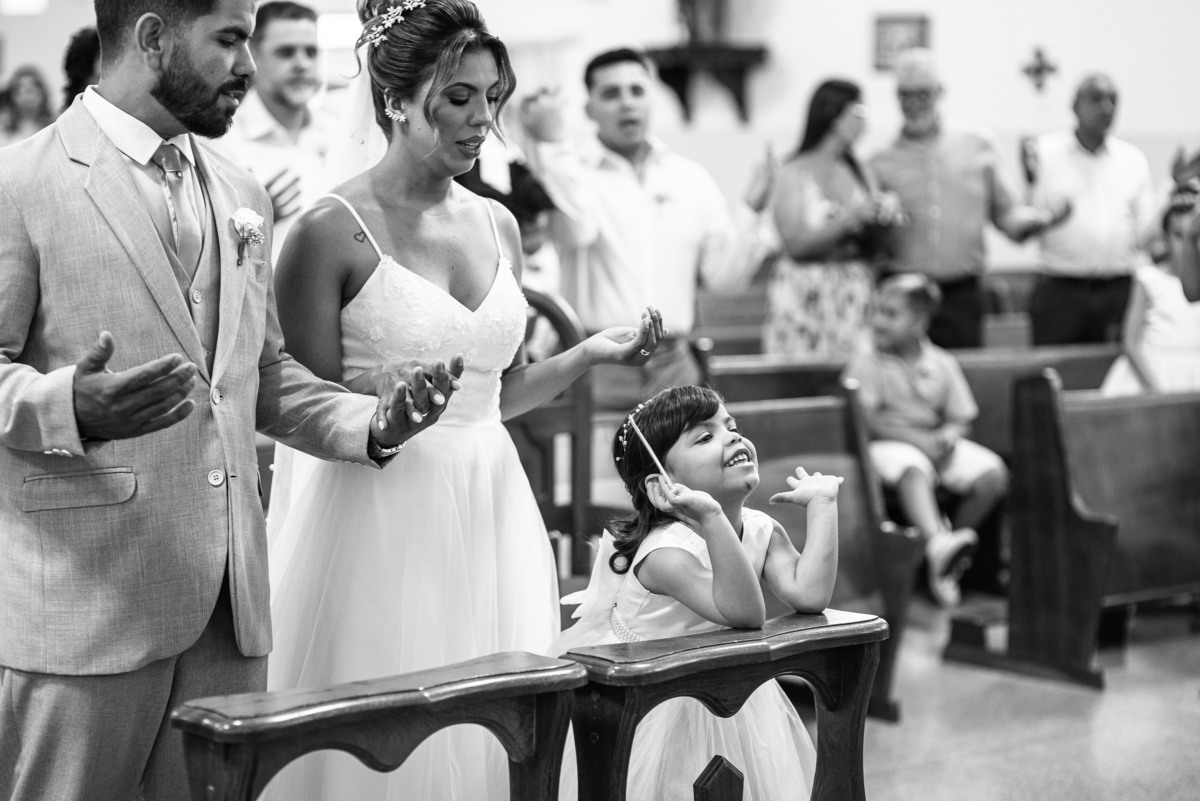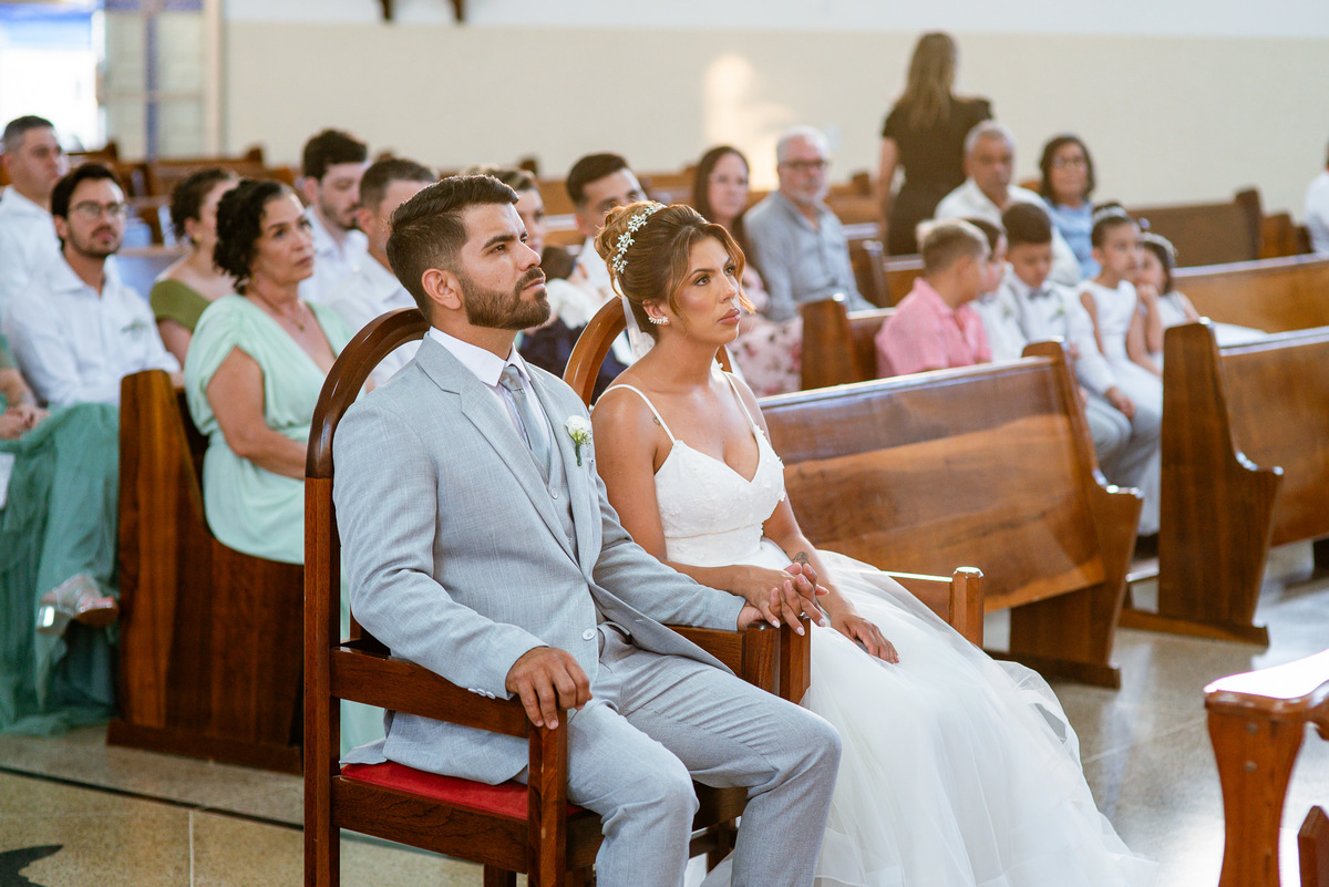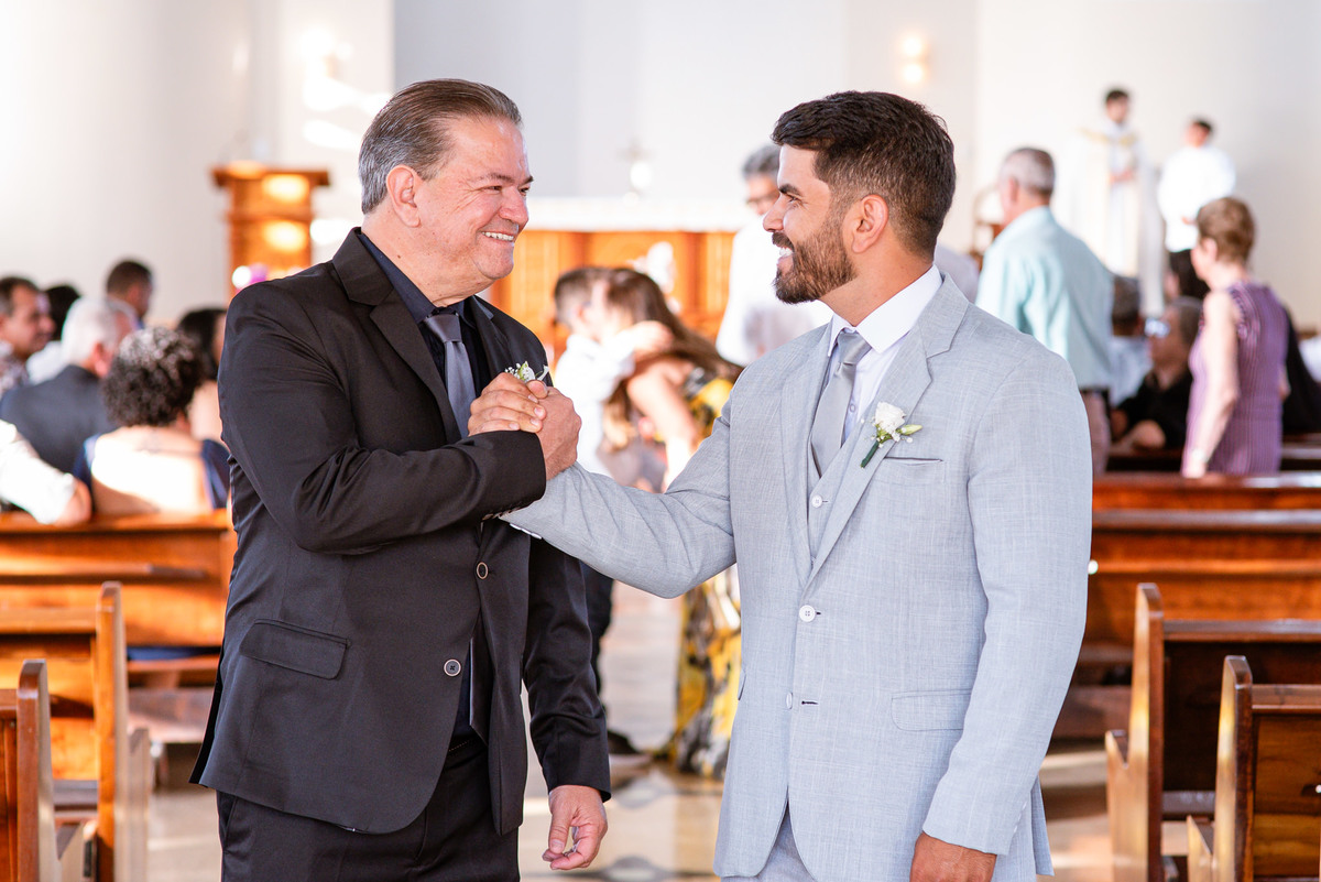 Poucos passos adiante e eles estavam prontos para se encontrar. Bheatriz despediu-se de Matheus. Rayan se aproximou, sendo recebido com um carinhoso abraço do Matheuzinho. Enfim, eram somente noivo e noiva frente a frente. Os olhares de amor e felicidade eram os únicos que se entrelaçavam naquele instante. Com um carinhoso beijo, Rayan selou aquele momento para sempre. Eles agora caminharam juntos, rumo ao altar para depois saírem dali como uma só carne. O padre os recebeu carinhosamente e trouxe uma palavra edificante e que os noivos lembrarão para sempre do que foi dito na homilia. Depois, ele os convidou a trocarem seus votos de amor eterno um para o outro. Convidou as alianças para serem trazidas, as ungiu com a água benta e pediu para que os dois colocassem um no dedo do outro. Com as palavras repetidas por eles, os dois juraram seu amor e fidelidade eternas. Com muitas palmas e festa, Bheatriz e Rayan foram declarados casados perante Deus e as testemunhas. Eles assinaram os documentos e fizemos nossas tradicionais fotografias com os padrinhos e parentes dos dois. Posteriormente, a fila de padrinhos foi formada do lado de fora da Igreja. Com muitas bolhinhas de sabão, os recém-casados foram recebidos com muita festa. Eles se despediram de alguns convidados e partimos pro nosso mini ensaio de casados.