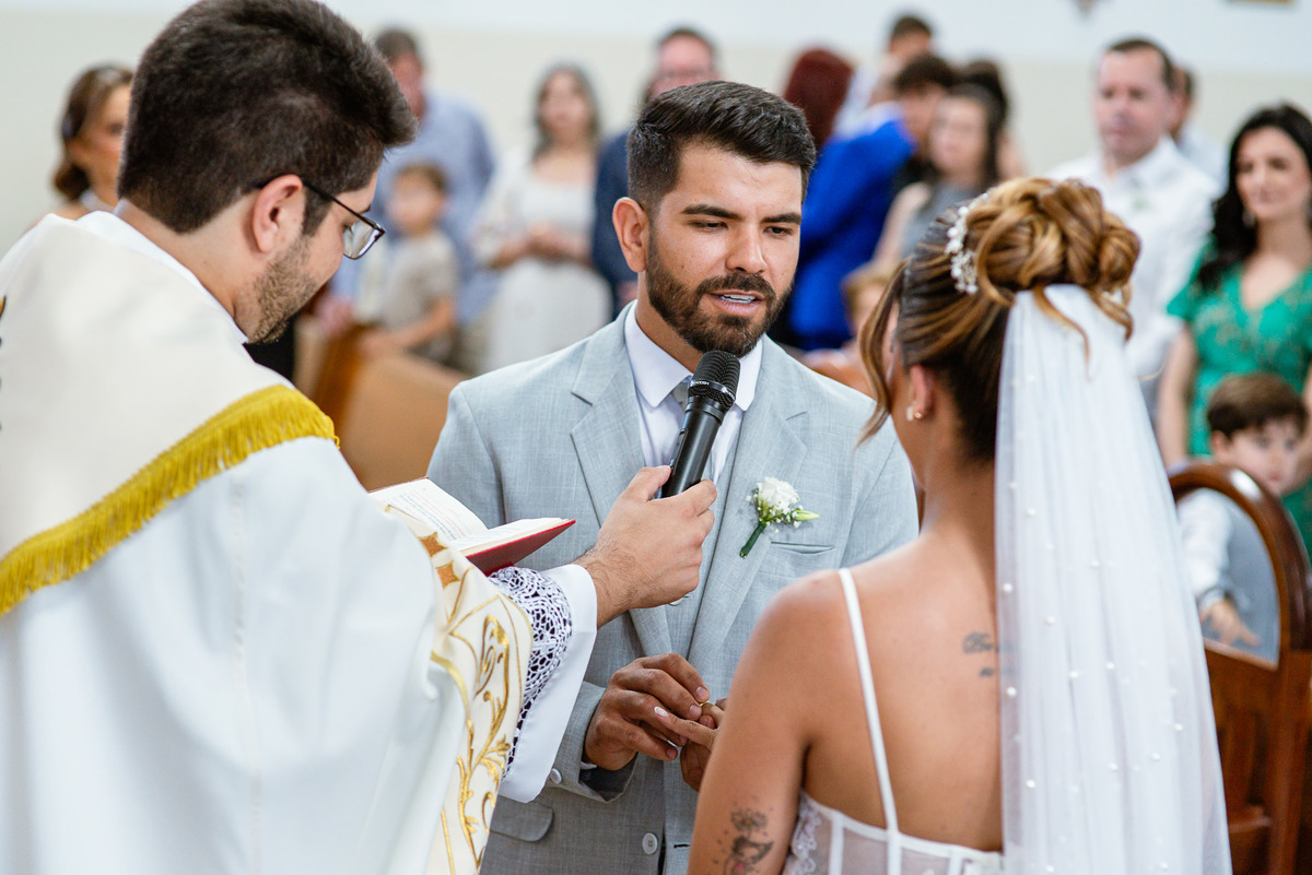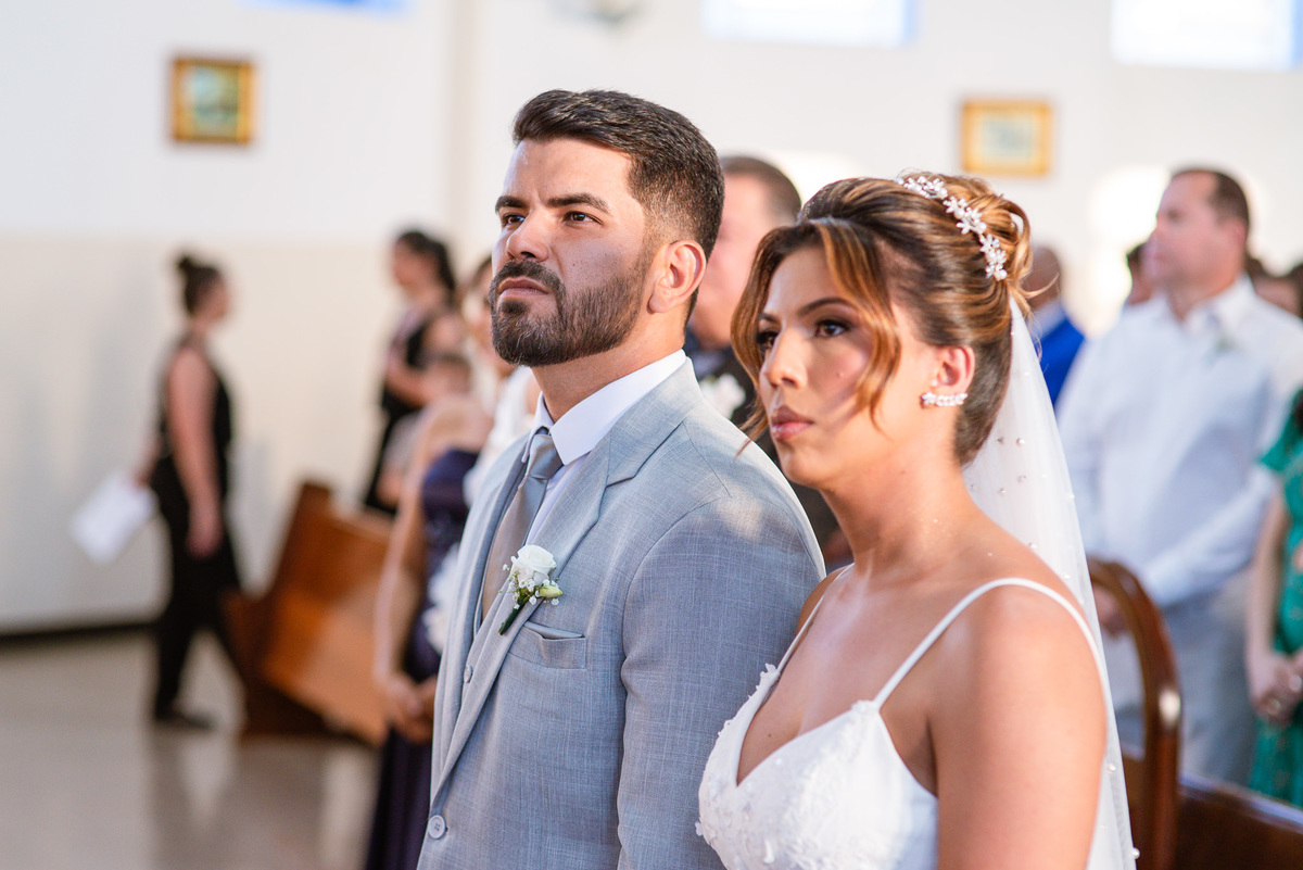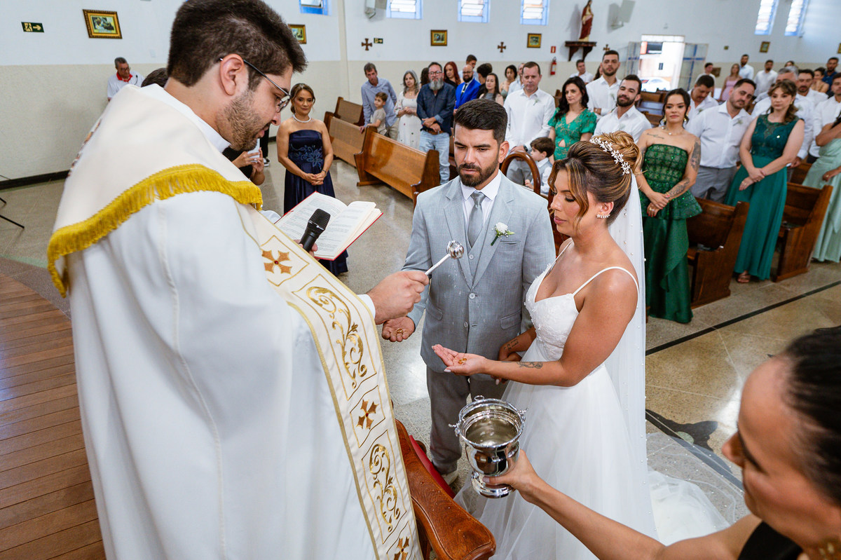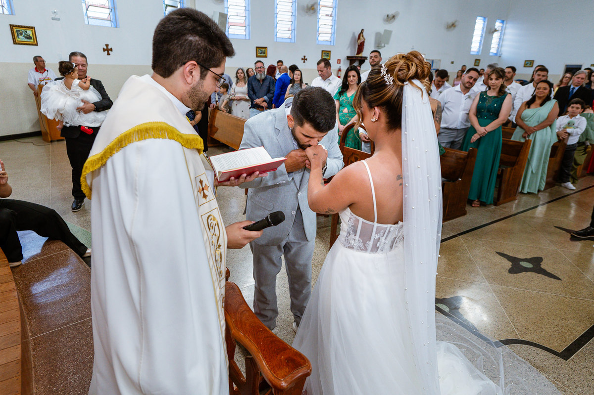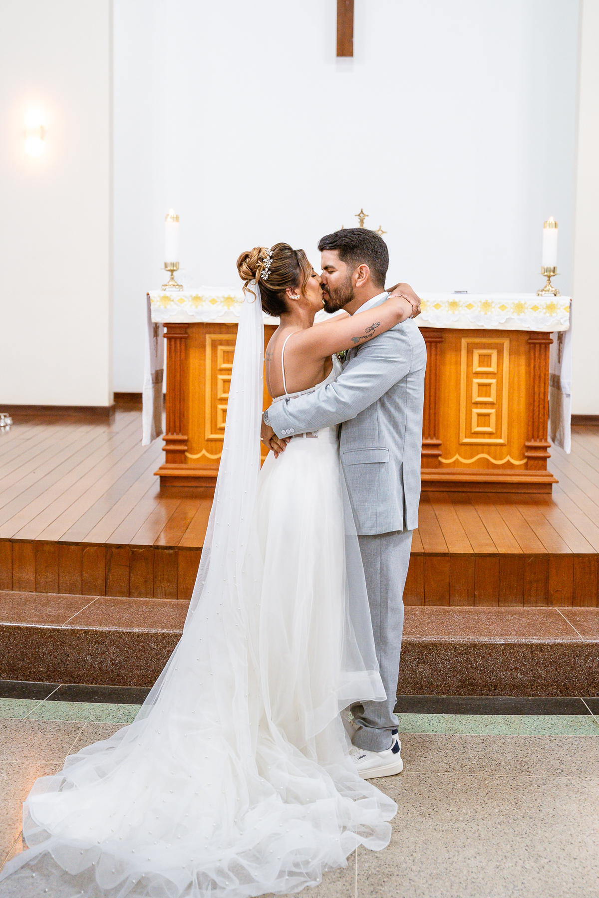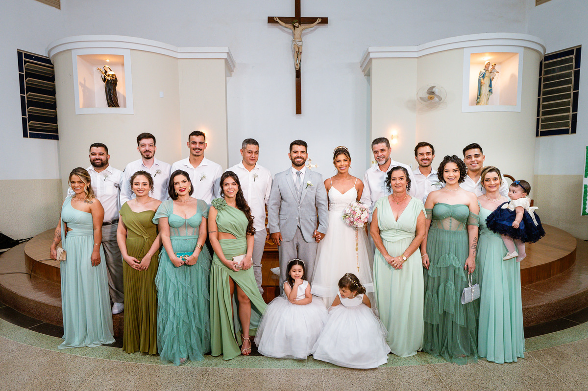 Poucos passos adiante e eles estavam prontos para se encontrar. Bheatriz despediu-se de Matheus. Rayan se aproximou, sendo recebido com um carinhoso abraço do Matheuzinho. Enfim, eram somente noivo e noiva frente a frente. Os olhares de amor e felicidade eram os únicos que se entrelaçavam naquele instante. Com um carinhoso beijo, Rayan selou aquele momento para sempre. Eles agora caminharam juntos, rumo ao altar para depois saírem dali como uma só carne. O padre os recebeu carinhosamente e trouxe uma palavra edificante e que os noivos lembrarão para sempre do que foi dito na homilia. Depois, ele os convidou a trocarem seus votos de amor eterno um para o outro. Convidou as alianças para serem trazidas, as ungiu com a água benta e pediu para que os dois colocassem um no dedo do outro. Com as palavras repetidas por eles, os dois juraram seu amor e fidelidade eternas. Com muitas palmas e festa, Bheatriz e Rayan foram declarados casados perante Deus e as testemunhas. Eles assinaram os documentos e fizemos nossas tradicionais fotografias com os padrinhos e parentes dos dois. Posteriormente, a fila de padrinhos foi formada do lado de fora da Igreja. Com muitas bolhinhas de sabão, os recém-casados foram recebidos com muita festa. Eles se despediram de alguns convidados e partimos pro nosso mini ensaio de casados.