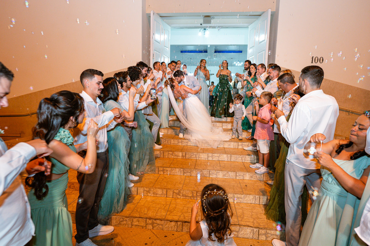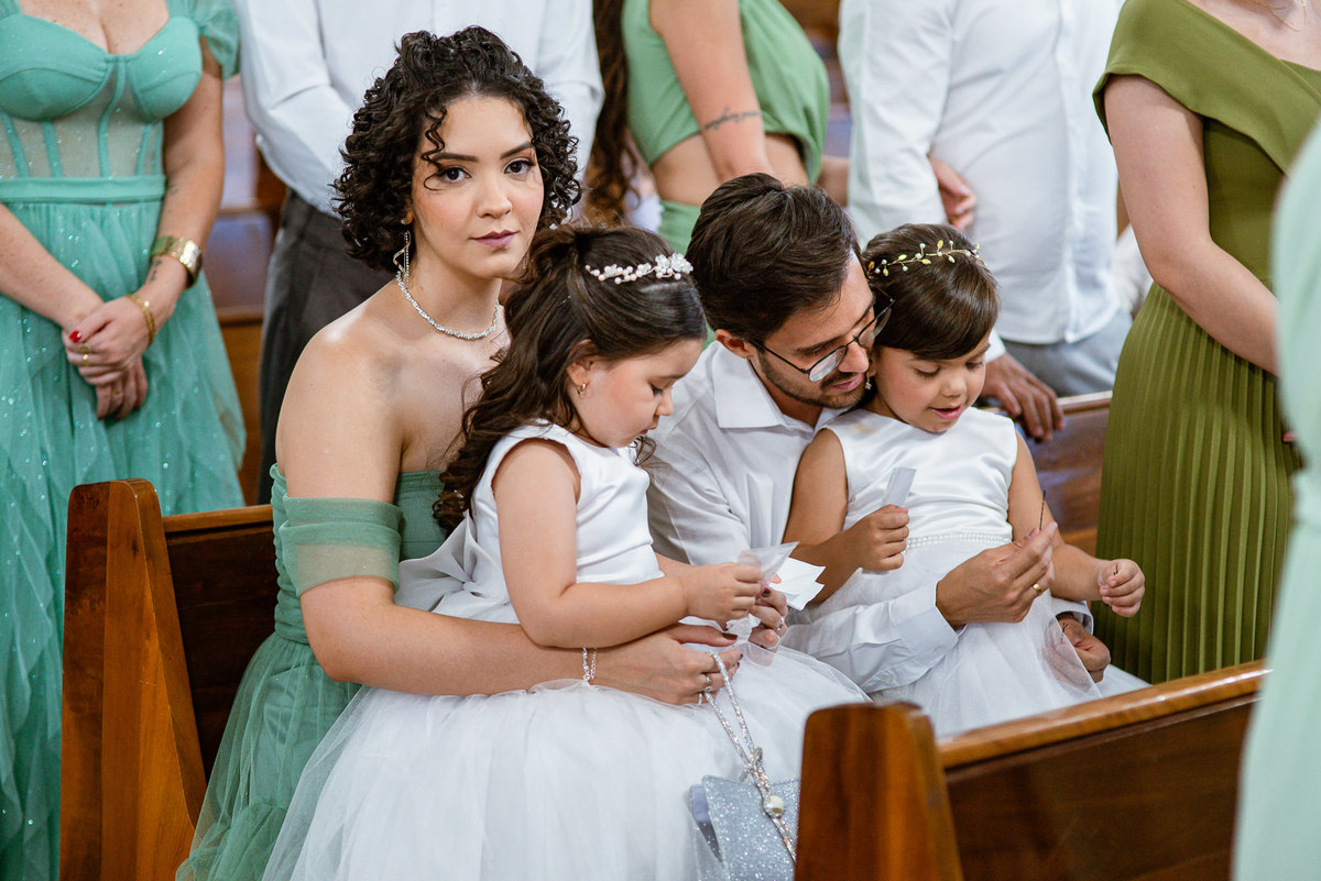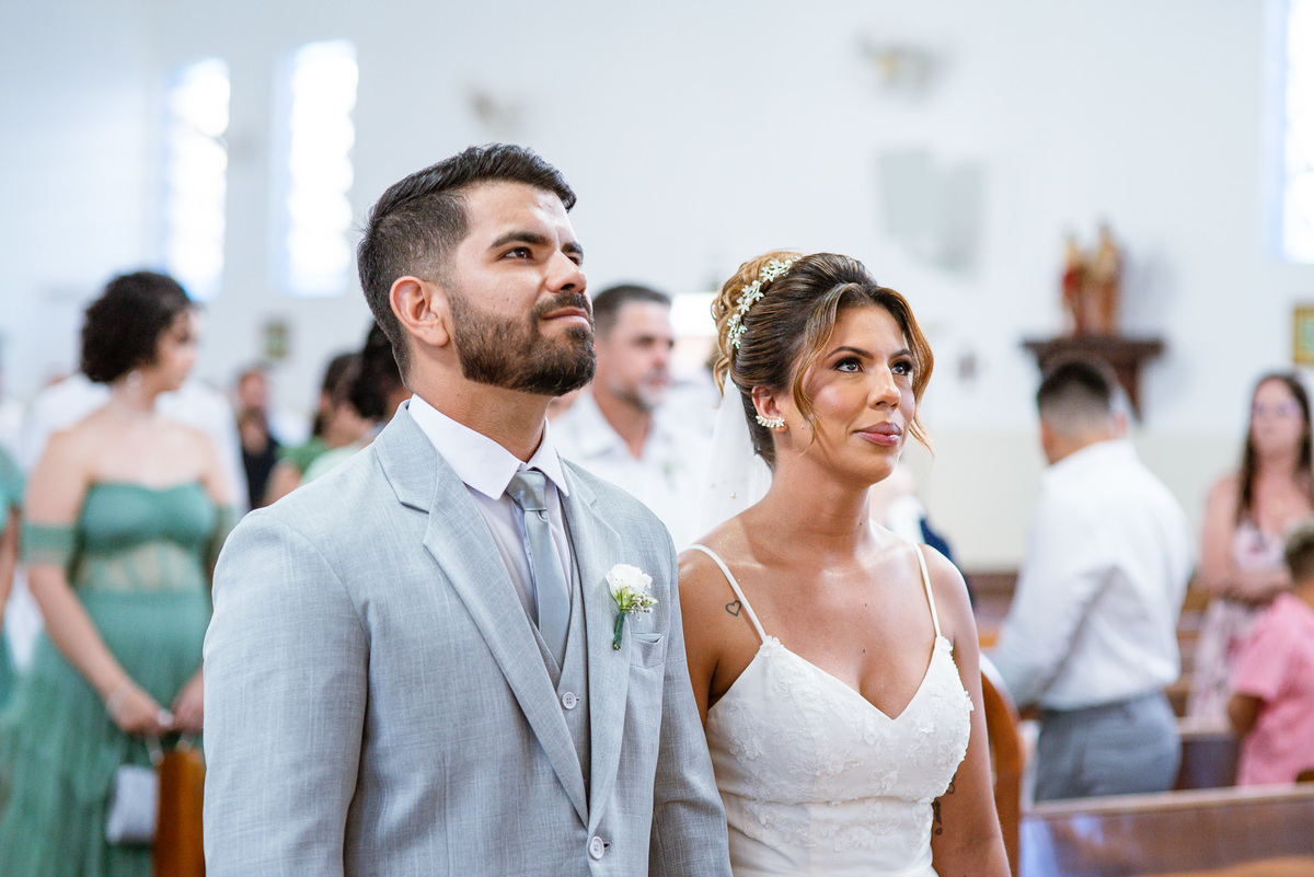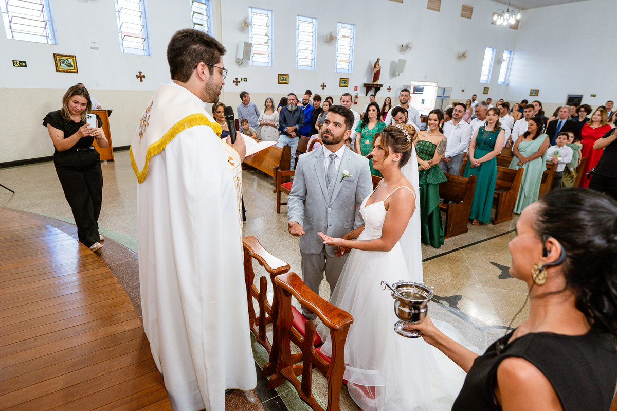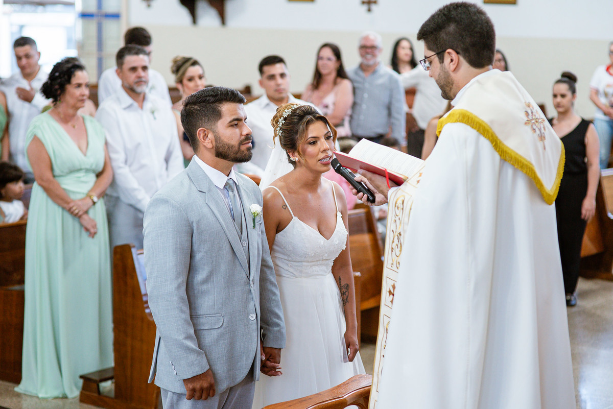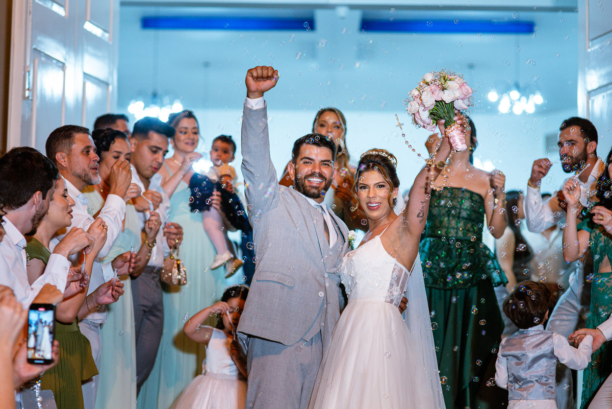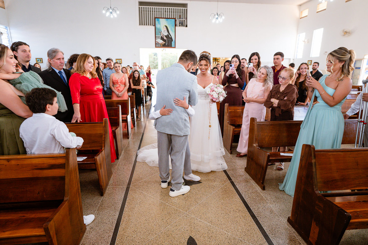 Poucos passos adiante e eles estavam prontos para se encontrar. Bheatriz despediu-se de Matheus. Rayan se aproximou, sendo recebido com um carinhoso abraço do Matheuzinho. Enfim, eram somente noivo e noiva frente a frente. Os olhares de amor e felicidade eram os únicos que se entrelaçavam naquele instante. Com um carinhoso beijo, Rayan selou aquele momento para sempre. Eles agora caminharam juntos, rumo ao altar para depois saírem dali como uma só carne. O padre os recebeu carinhosamente e trouxe uma palavra edificante e que os noivos lembrarão para sempre do que foi dito na homilia. Depois, ele os convidou a trocarem seus votos de amor eterno um para o outro. Convidou as alianças para serem trazidas, as ungiu com a água benta e pediu para que os dois colocassem um no dedo do outro. Com as palavras repetidas por eles, os dois juraram seu amor e fidelidade eternas. Com muitas palmas e festa, Bheatriz e Rayan foram declarados casados perante Deus e as testemunhas. Eles assinaram os documentos e fizemos nossas tradicionais fotografias com os padrinhos e parentes dos dois. Posteriormente, a fila de padrinhos foi formada do lado de fora da Igreja. Com muitas bolhinhas de sabão, os recém-casados foram recebidos com muita festa. Eles se despediram de alguns convidados e partimos pro nosso mini ensaio de casados.
