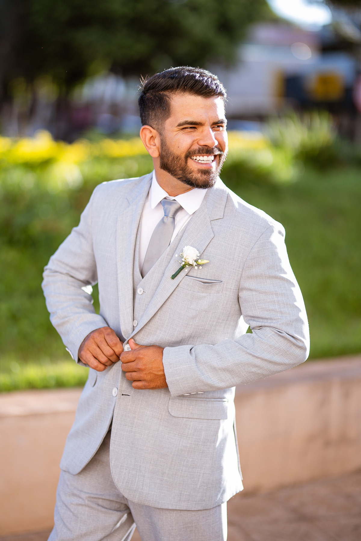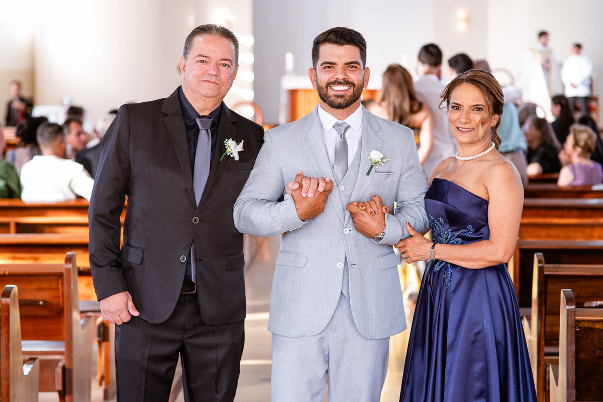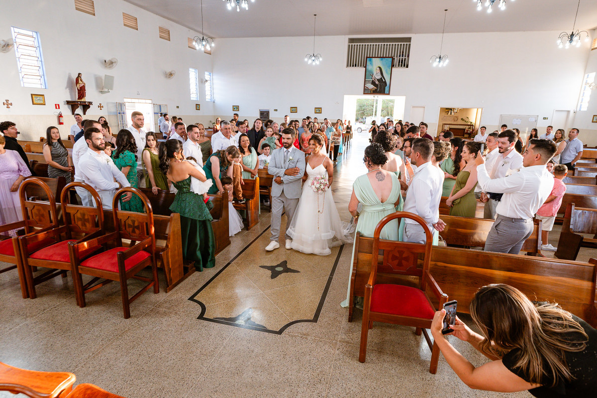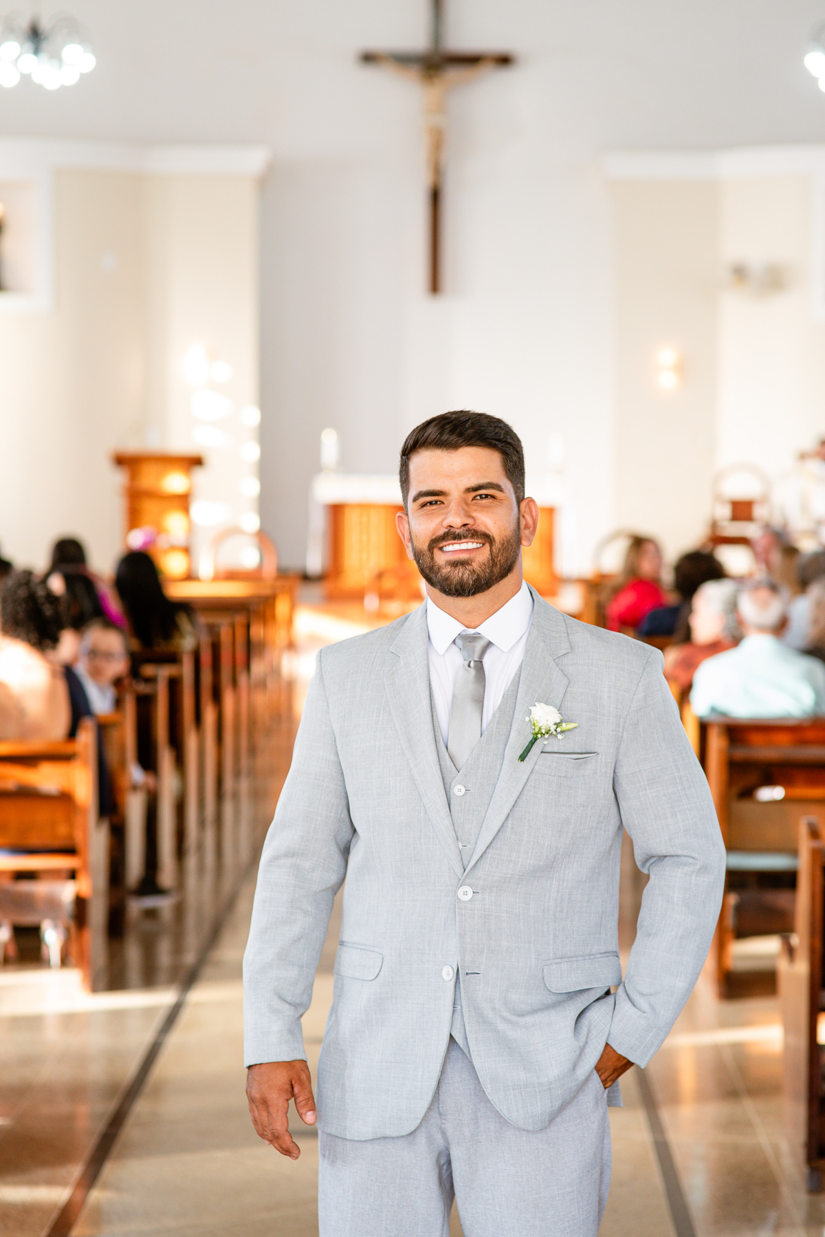 Lá em Presidente Olegário, Rayan realizava os últimos ajustes. Colocou seu terno e partiu para a celebração. A Igreja Matriz já estava de portas abertas aguardando a chegada dos convidados. Enquanto isso, Bheatriz havia terminado seu look. Agora completa, make, penteado e vestido lindo, a noiva finalmente estava pronta para se casar. O coração batia mais forte a cada segundo. Fizemos nossos retratos da noiva e já partimos pra Igreja. Na porta, os padrinhos todos alinhados chegavam e recebiam os cumprimentos do noivos. Rayan estava radiante, sorrindo para todos os seus amigos e padrinhos de casamento. Fotografamos ele e seus pais sempre com sorriso no rosto característico dele. Ouvimos o carro da noiva chegar e corremos para lá. Ela estava linda, radiante como o noivo. O brilho da luz do sol reluzia em seu rosto, seus olhos brilhavam e o sorriso vinha automaticamente. Fizemos nossas fotografias da noiva no carro e deixamos ela ali para iniciarmos a cerimônia. A cantora Aletis Garcia e sua equipe, foram os responsáveis por trazer as notas musicais doces ao evento.