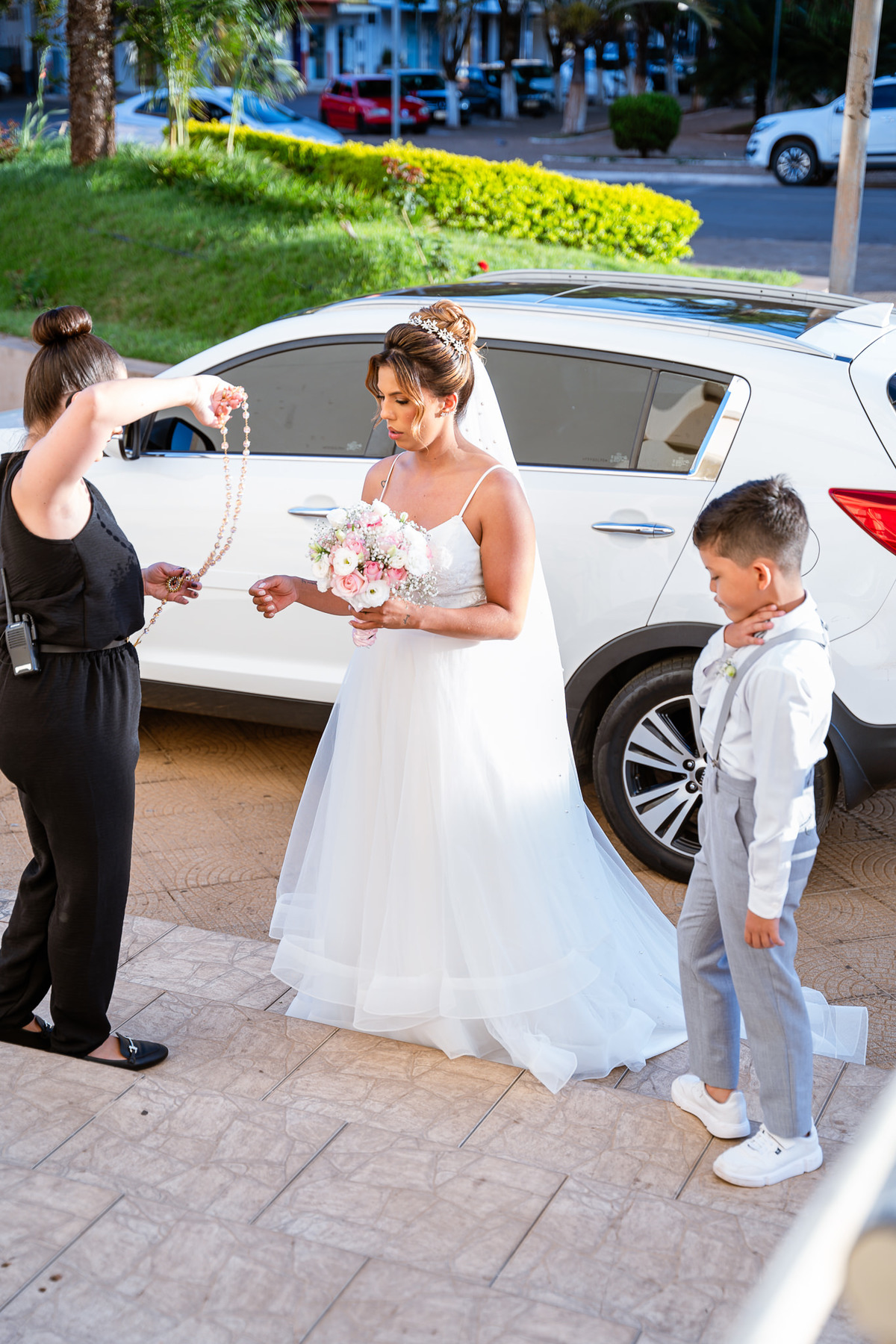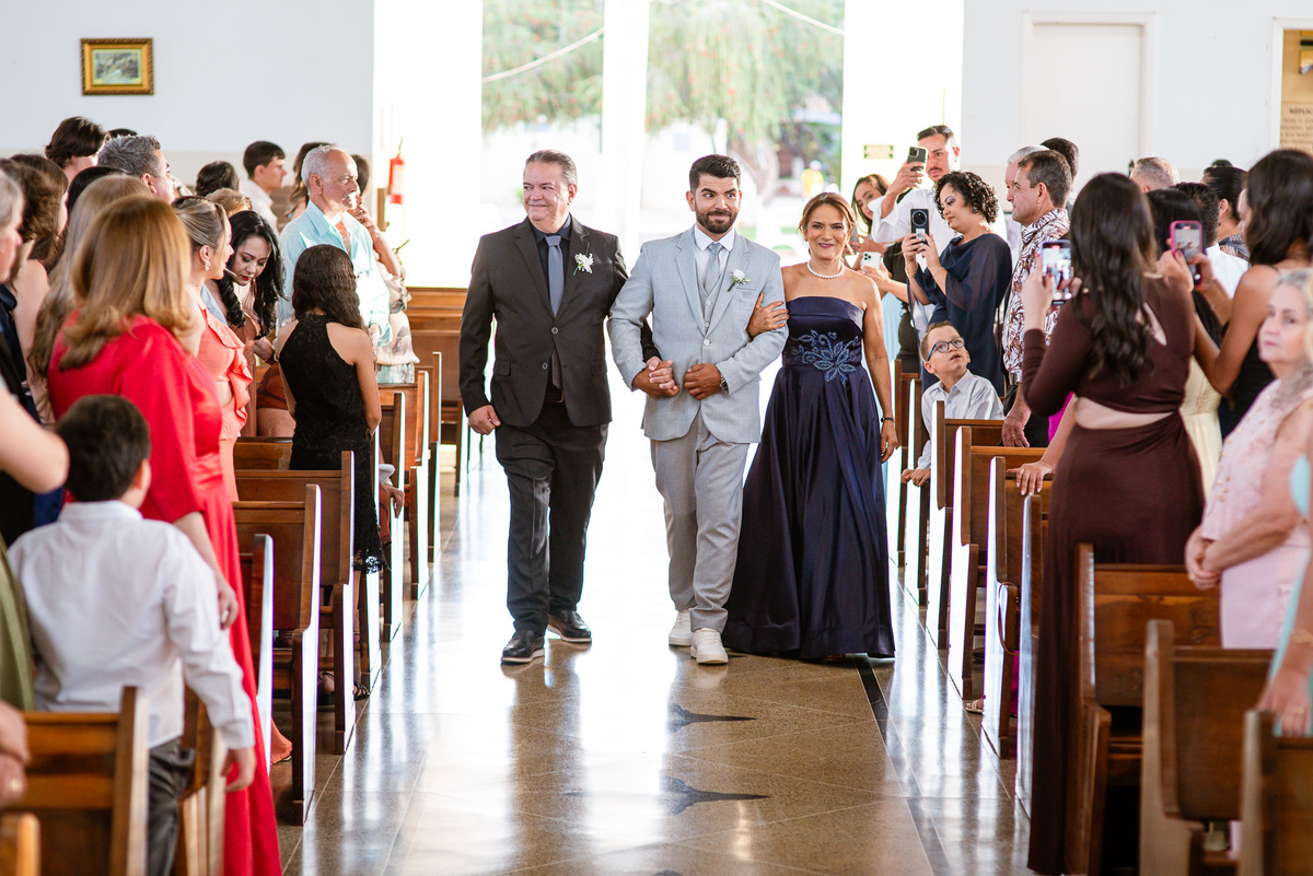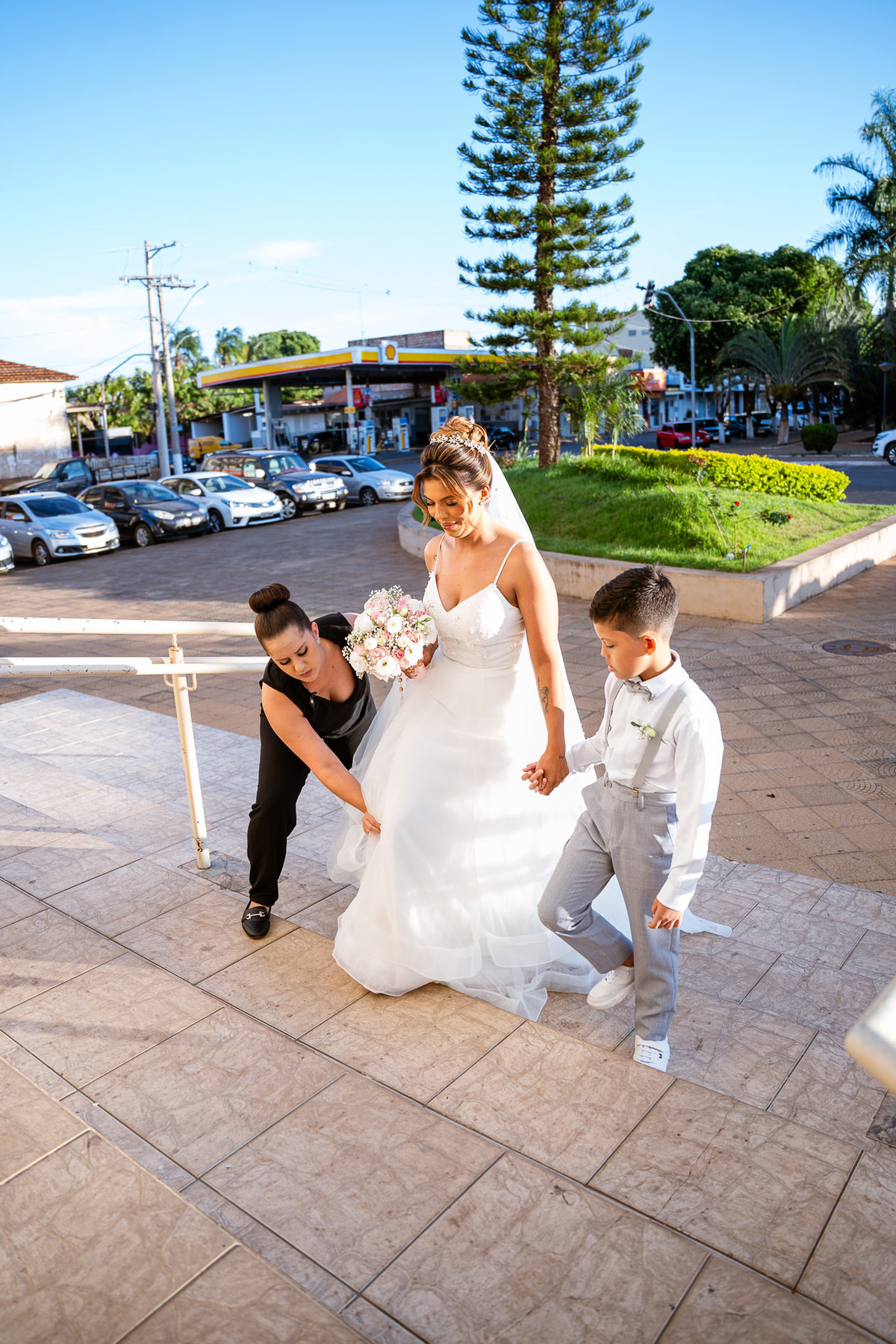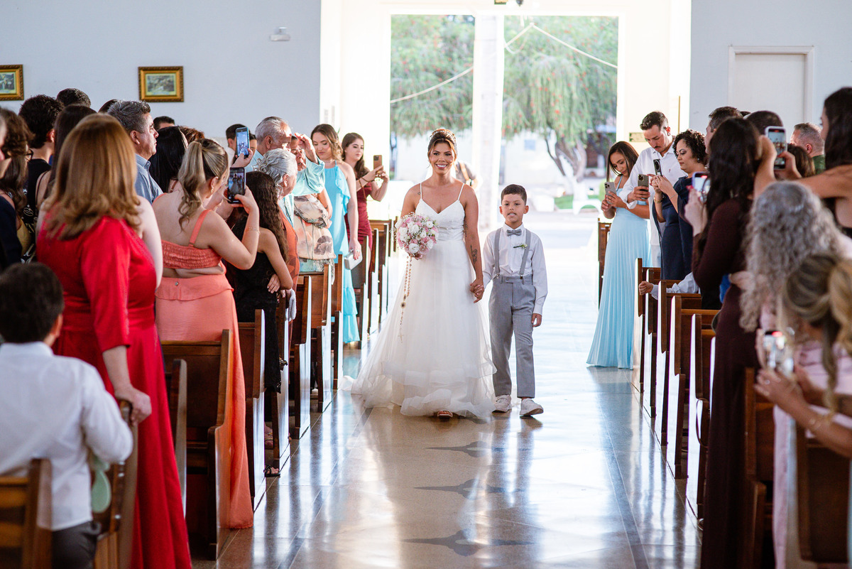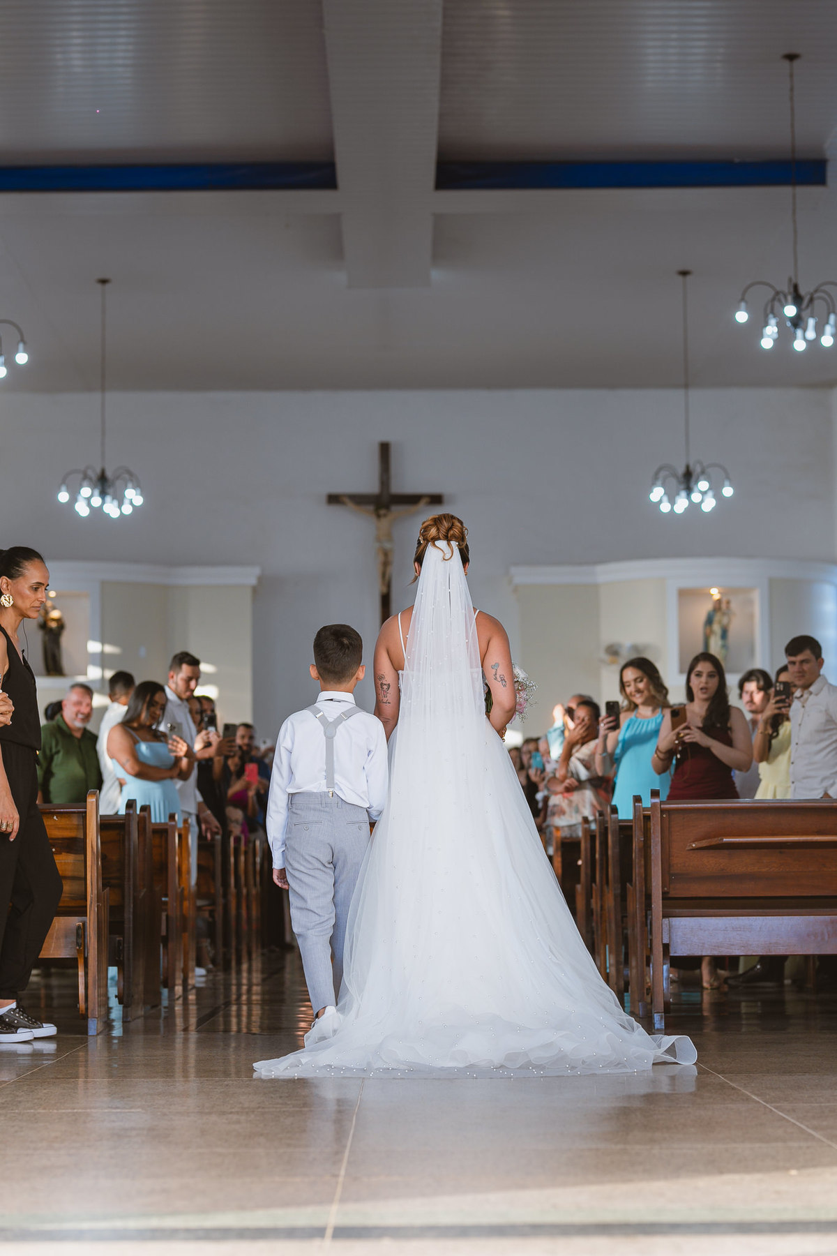 A cerimônia teve seu início imediato. Aos poucos, padrinhos e madrinhas começaram a entrar. Os noivos prepararam uma homenagem para sua parente falecida há poucos dias. Com uma foto em sinal de respeito e saudade, um dos padrinhos trouxe essa homenagem póstuma à ela. Foi uma emoção contagiante. Rayan se posicionou de braços dados com seus pais na porta. Caminhando juntos, todos sorridentes e felizes, eles adentraram ao recinto. Os pajens vieram logo após, trazendo um pouco de alento para os que se emocionaram. A leveza das crianças faz com que o nosso coração se quebranta de tal forma que esquecemos os momentos de dor. Enfim, era chegada a hora da noiva. Bheatriz desceu do carro e com o auxilio da equipe cerimonial, posicionou-se atrás da porta de mãos dadas com seu filho Matheus. Os olhares todos voltados para lá, principalmente do noivo. A sua música escolhida foi iniciada, trazendo toda a fé da noiva naquele momento. Poucos segundos depois, as portas da Igreja se abriram e surgiu a noiva, com seu vestido maravilhoso, toda feliz e sorridente, de braços dados com seu filho. Eles caminharam rumo ao encontro final com o noivo. Os olhares emocionados dividiam-se entre ver toda a beleza e exuberância da noiva e ver a reação do noivo.