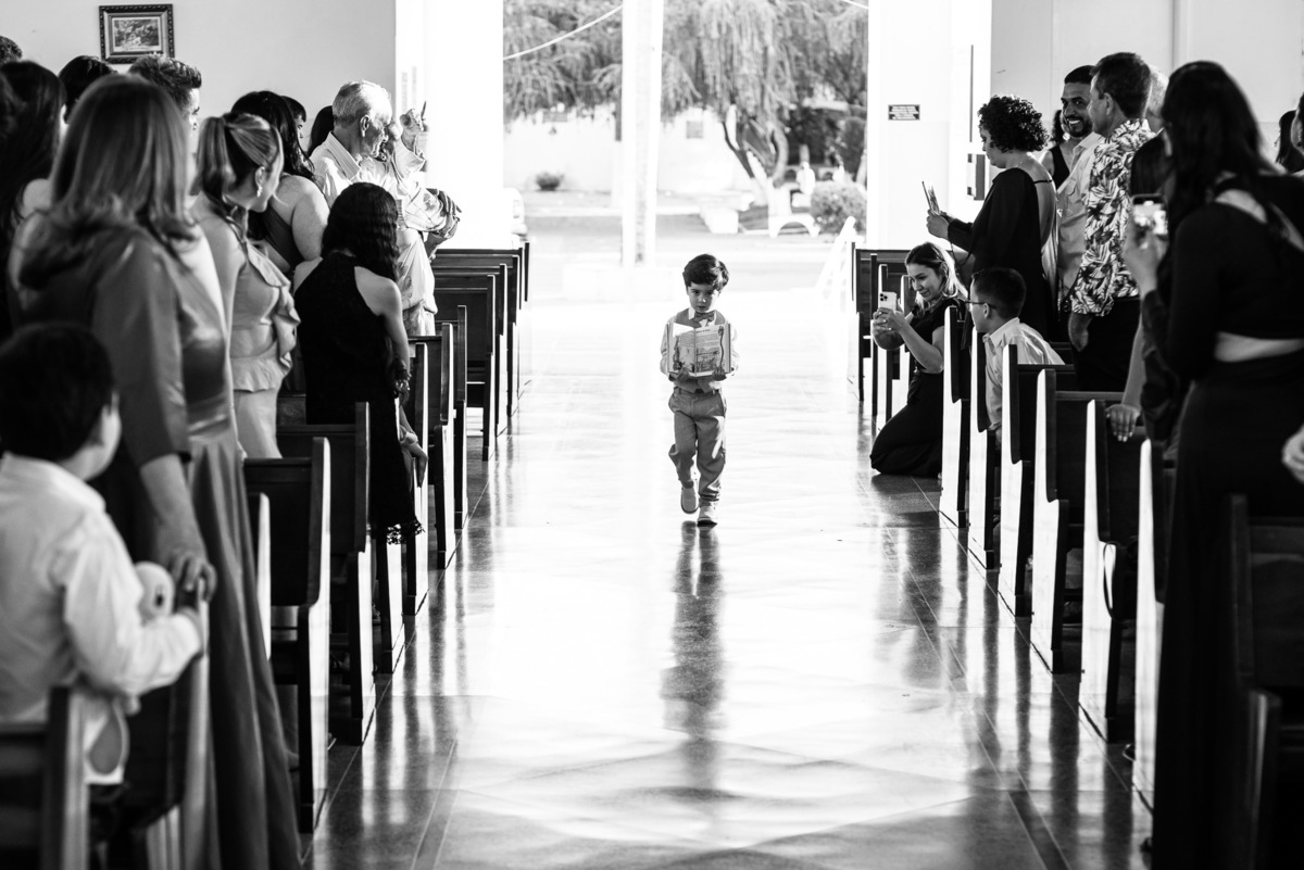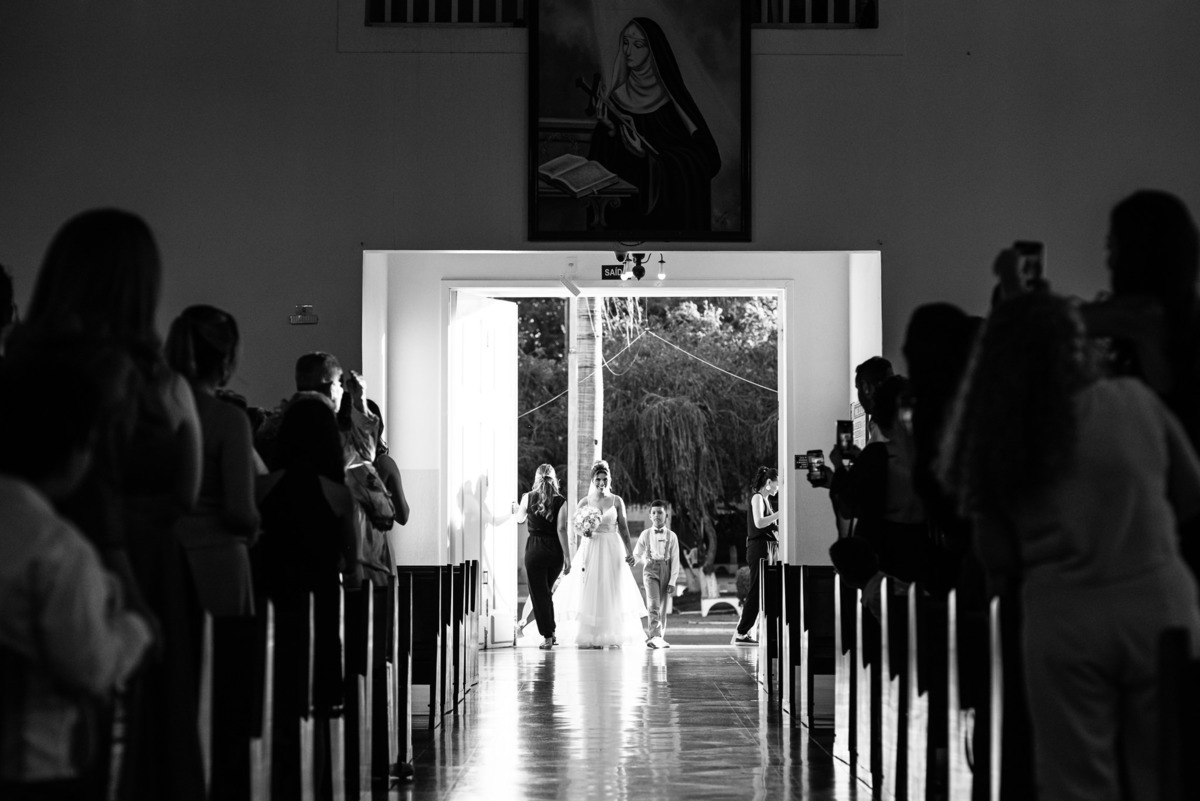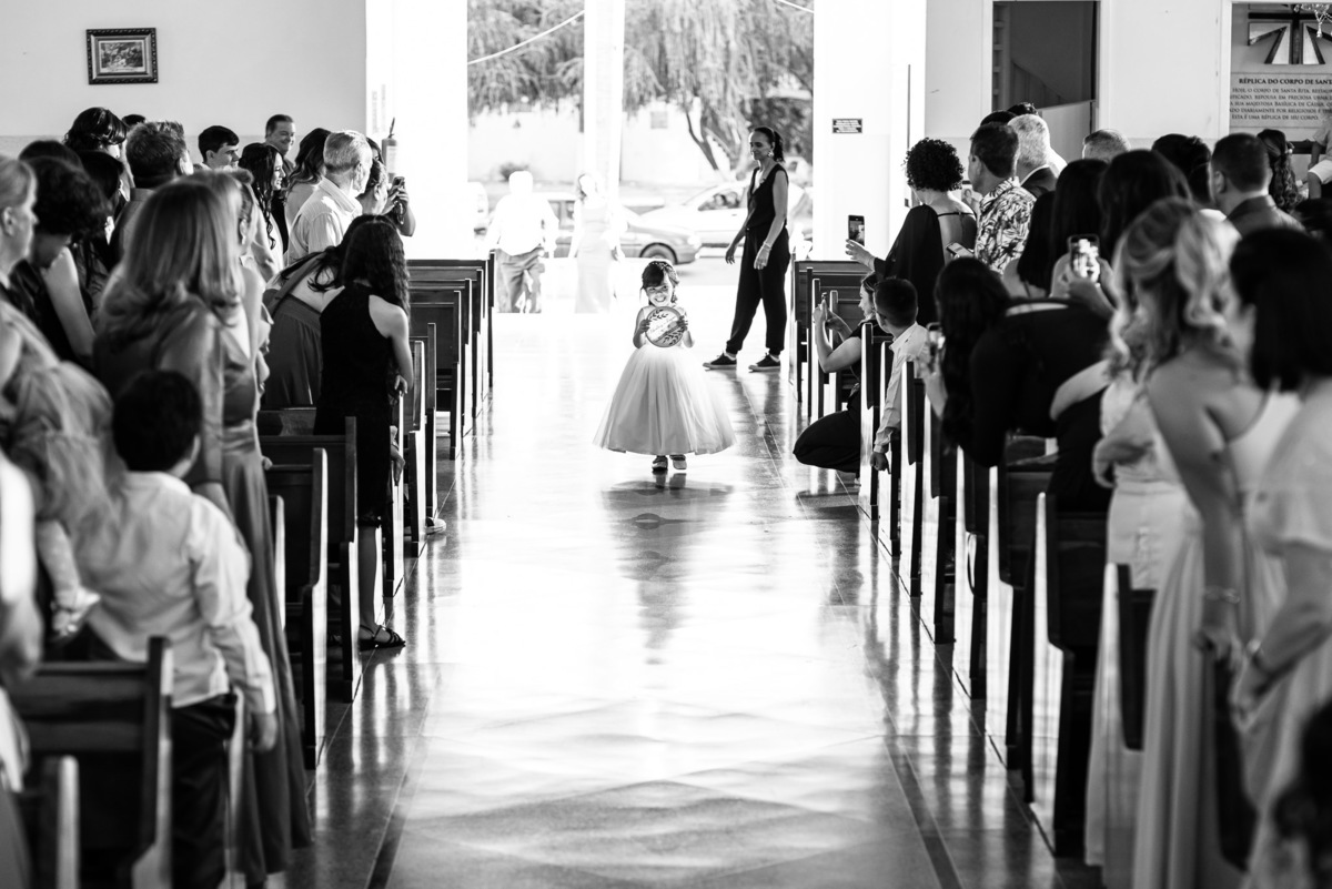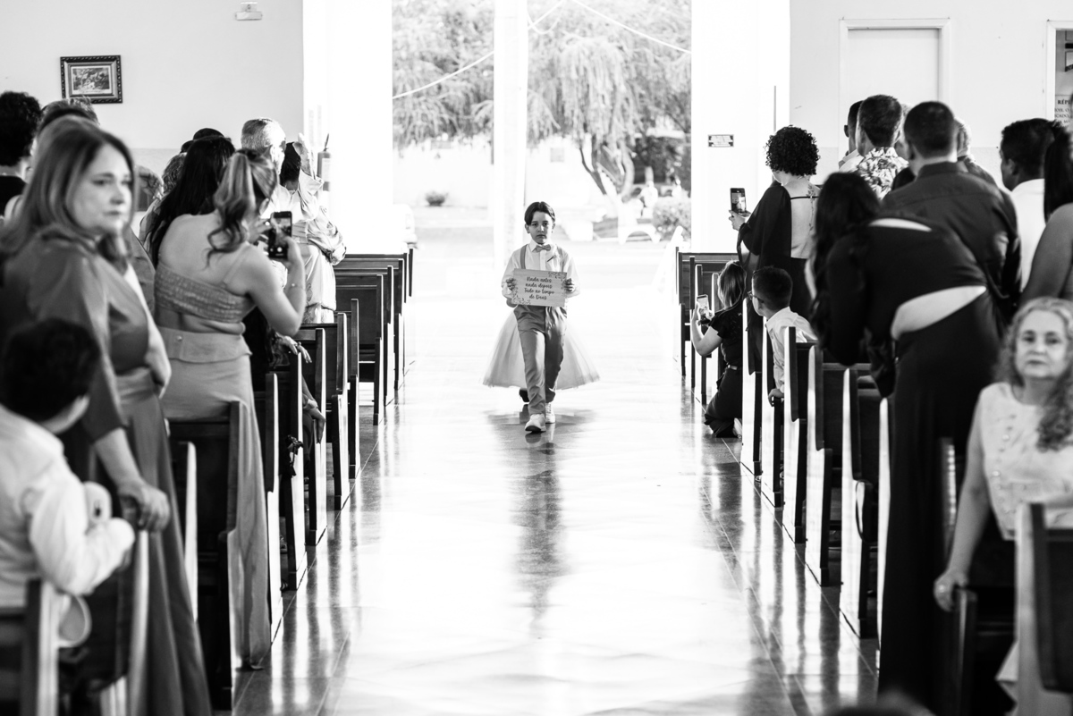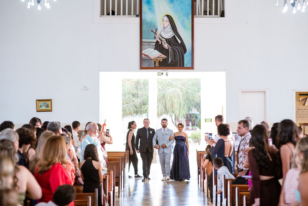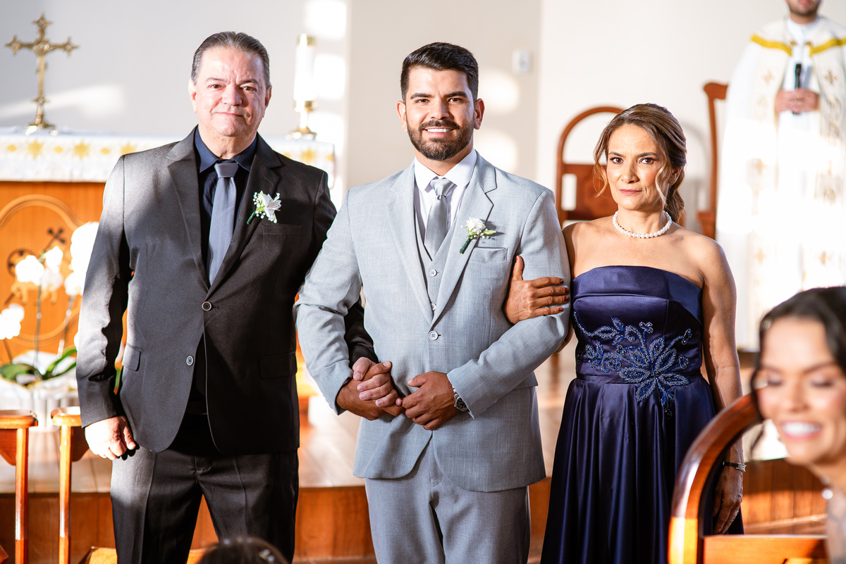 A cerimônia teve seu início imediato. Aos poucos, padrinhos e madrinhas começaram a entrar. Os noivos prepararam uma homenagem para sua parente falecida há poucos dias. Com uma foto em sinal de respeito e saudade, um dos padrinhos trouxe essa homenagem póstuma à ela. Foi uma emoção contagiante. Rayan se posicionou de braços dados com seus pais na porta. Caminhando juntos, todos sorridentes e felizes, eles adentraram ao recinto. Os pajens vieram logo após, trazendo um pouco de alento para os que se emocionaram. A leveza das crianças faz com que o nosso coração se quebranta de tal forma que esquecemos os momentos de dor. Enfim, era chegada a hora da noiva. Bheatriz desceu do carro e com o auxilio da equipe cerimonial, posicionou-se atrás da porta de mãos dadas com seu filho Matheus. Os olhares todos voltados para lá, principalmente do noivo. A sua música escolhida foi iniciada, trazendo toda a fé da noiva naquele momento. Poucos segundos depois, as portas da Igreja se abriram e surgiu a noiva, com seu vestido maravilhoso, toda feliz e sorridente, de braços dados com seu filho. Eles caminharam rumo ao encontro final com o noivo. Os olhares emocionados dividiam-se entre ver toda a beleza e exuberância da noiva e ver a reação do noivo.