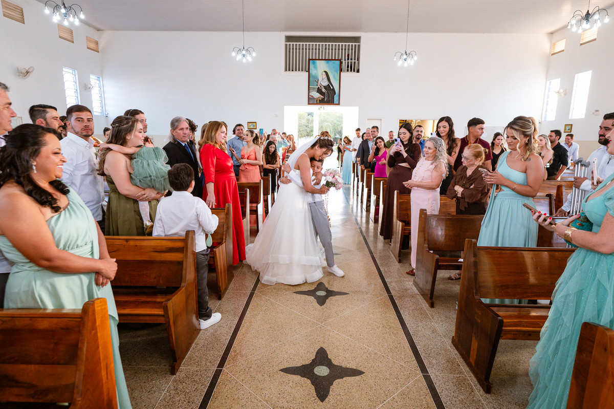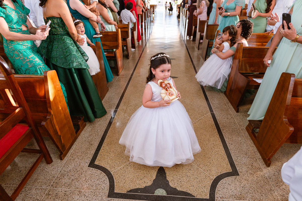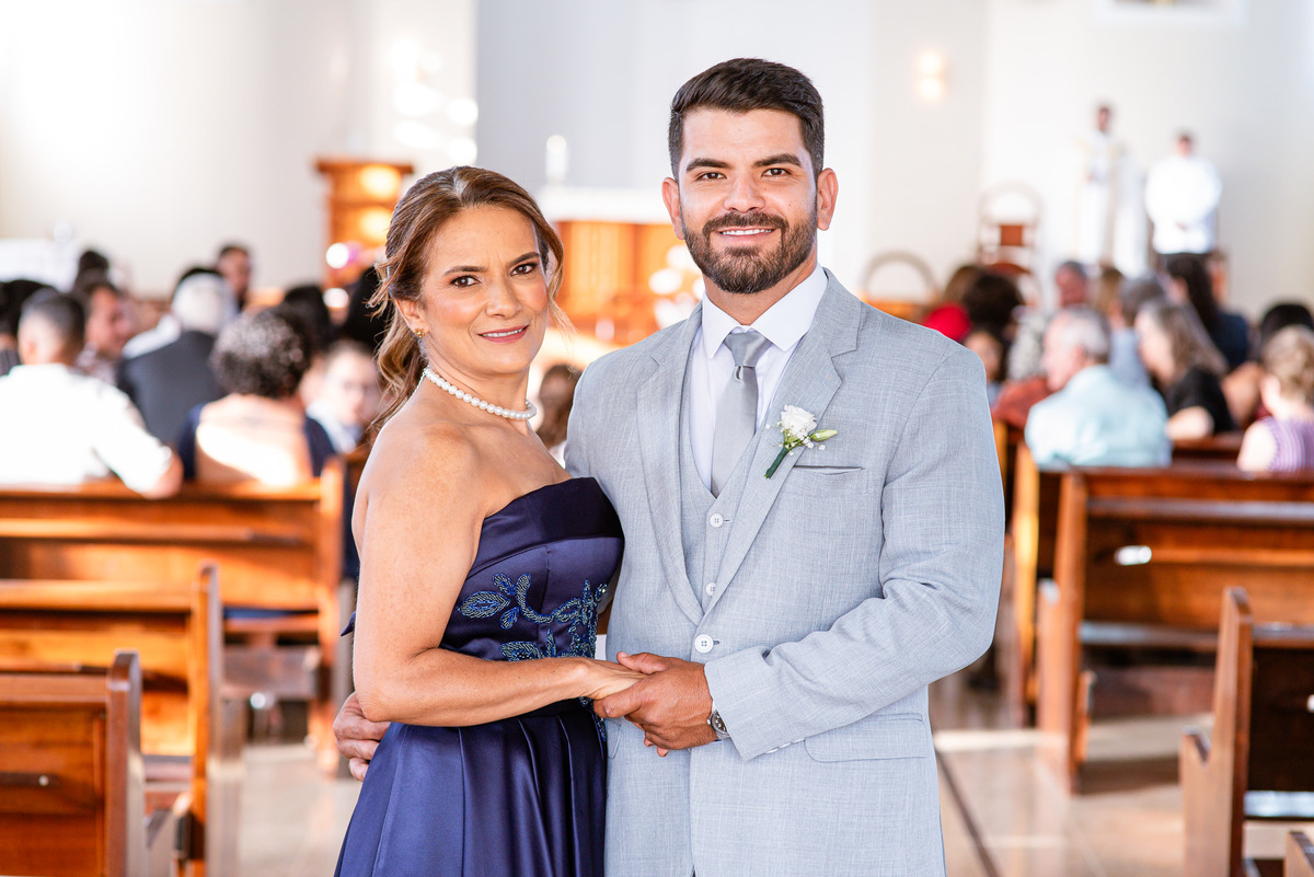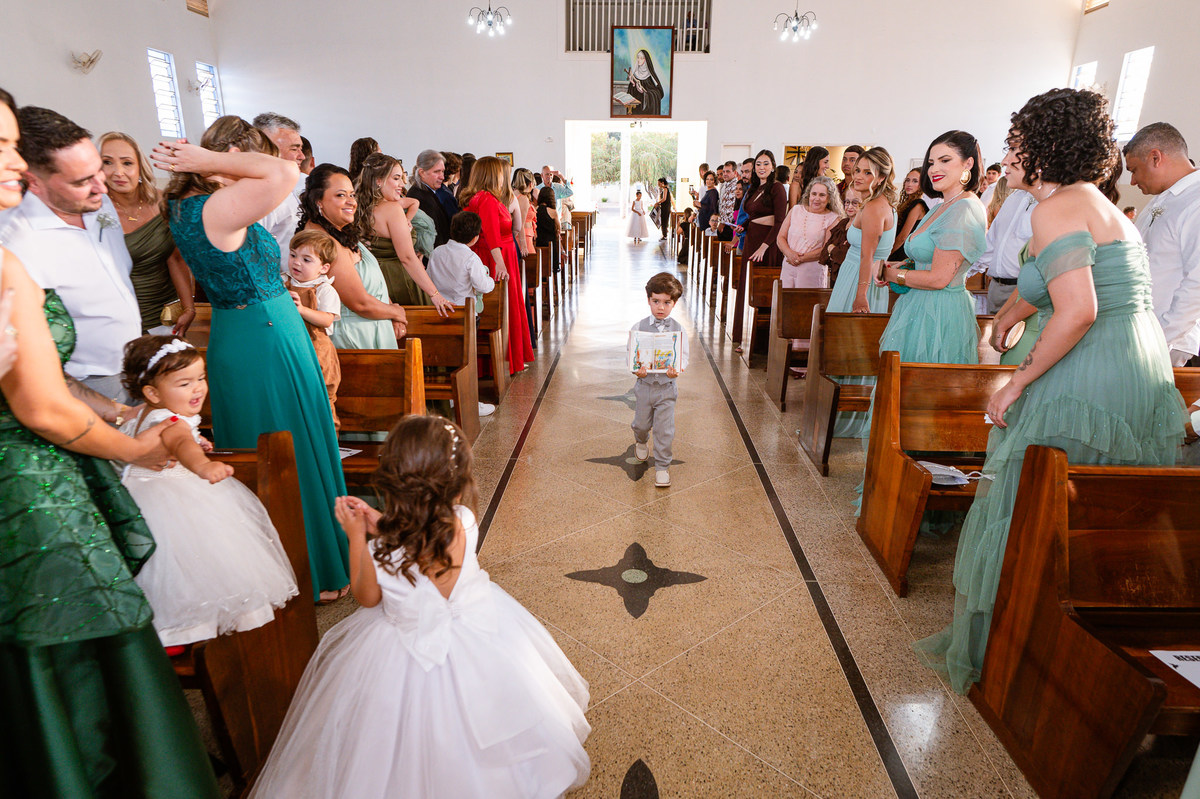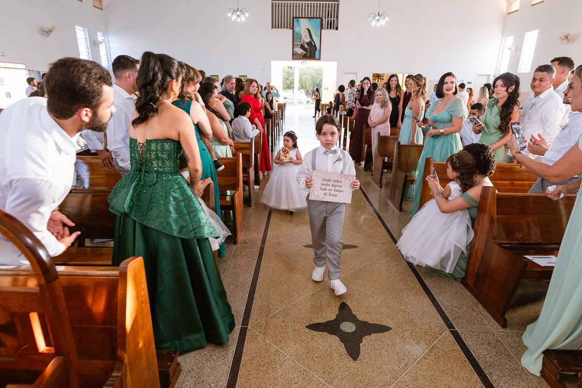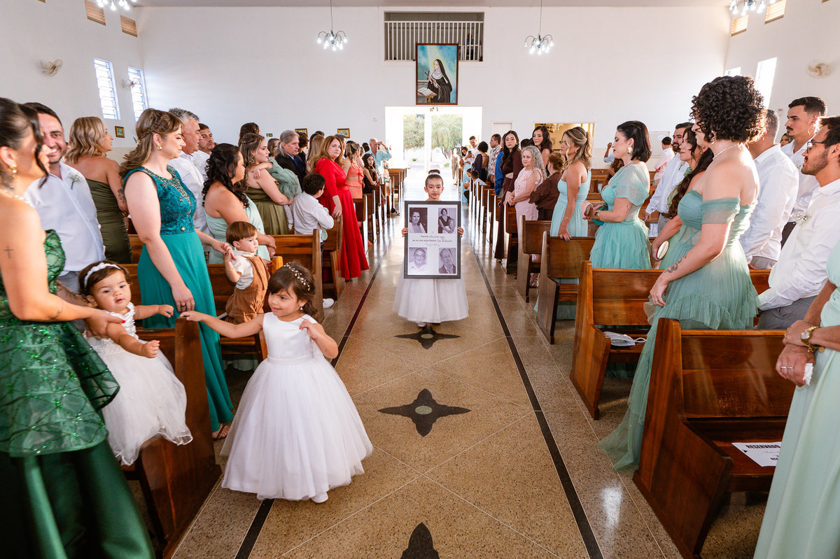 A cerimônia teve seu início imediato. Aos poucos, padrinhos e madrinhas começaram a entrar. Os noivos prepararam uma homenagem para sua parente falecida há poucos dias. Com uma foto em sinal de respeito e saudade, um dos padrinhos trouxe essa homenagem póstuma à ela. Foi uma emoção contagiante. Rayan se posicionou de braços dados com seus pais na porta. Caminhando juntos, todos sorridentes e felizes, eles adentraram ao recinto. Os pajens vieram logo após, trazendo um pouco de alento para os que se emocionaram. A leveza das crianças faz com que o nosso coração se quebranta de tal forma que esquecemos os momentos de dor. Enfim, era chegada a hora da noiva. Bheatriz desceu do carro e com o auxilio da equipe cerimonial, posicionou-se atrás da porta de mãos dadas com seu filho Matheus. Os olhares todos voltados para lá, principalmente do noivo. A sua música escolhida foi iniciada, trazendo toda a fé da noiva naquele momento. Poucos segundos depois, as portas da Igreja se abriram e surgiu a noiva, com seu vestido maravilhoso, toda feliz e sorridente, de braços dados com seu filho. Eles caminharam rumo ao encontro final com o noivo. Os olhares emocionados dividiam-se entre ver toda a beleza e exuberância da noiva e ver a reação do noivo.
