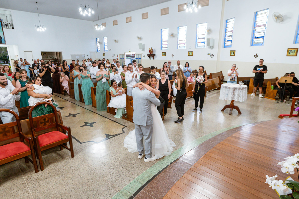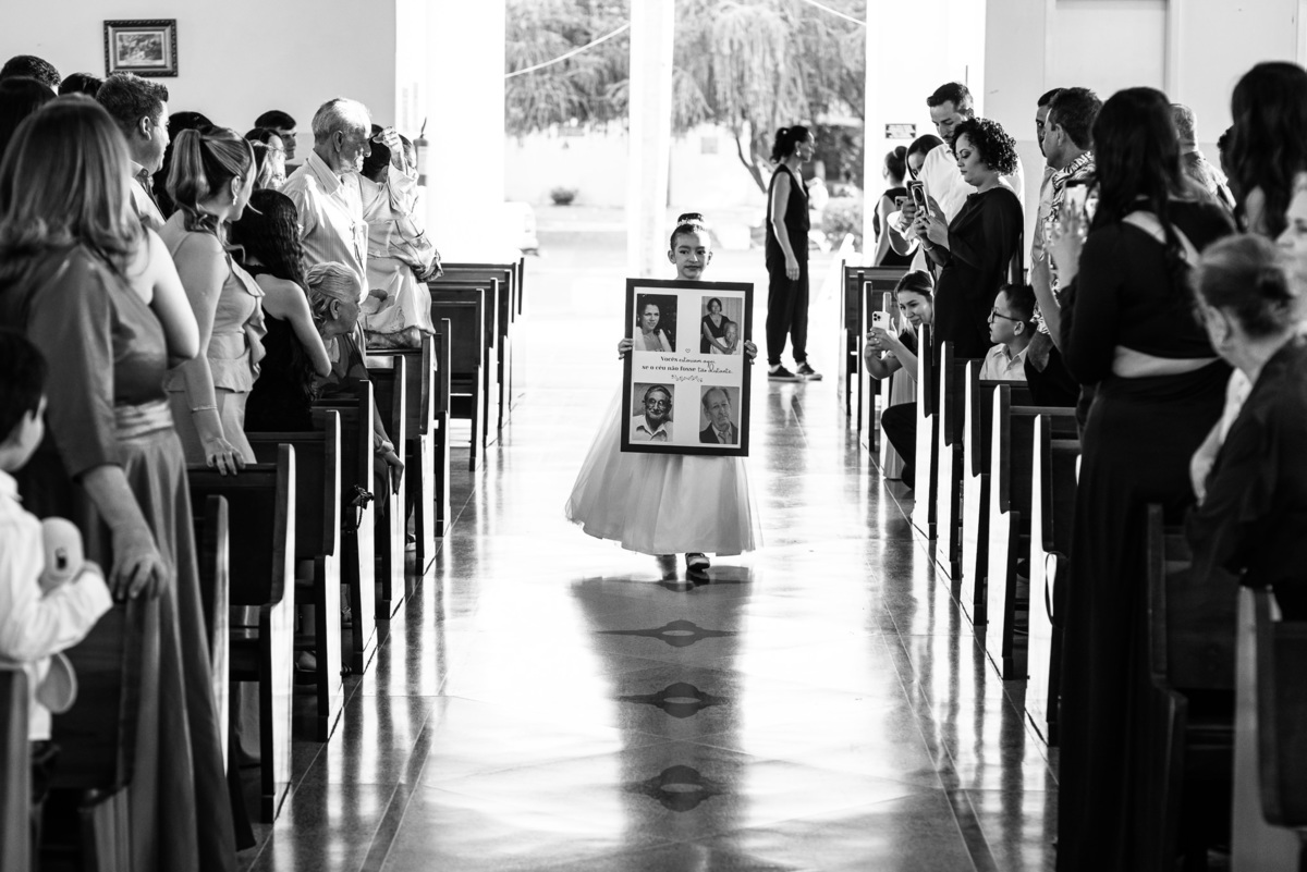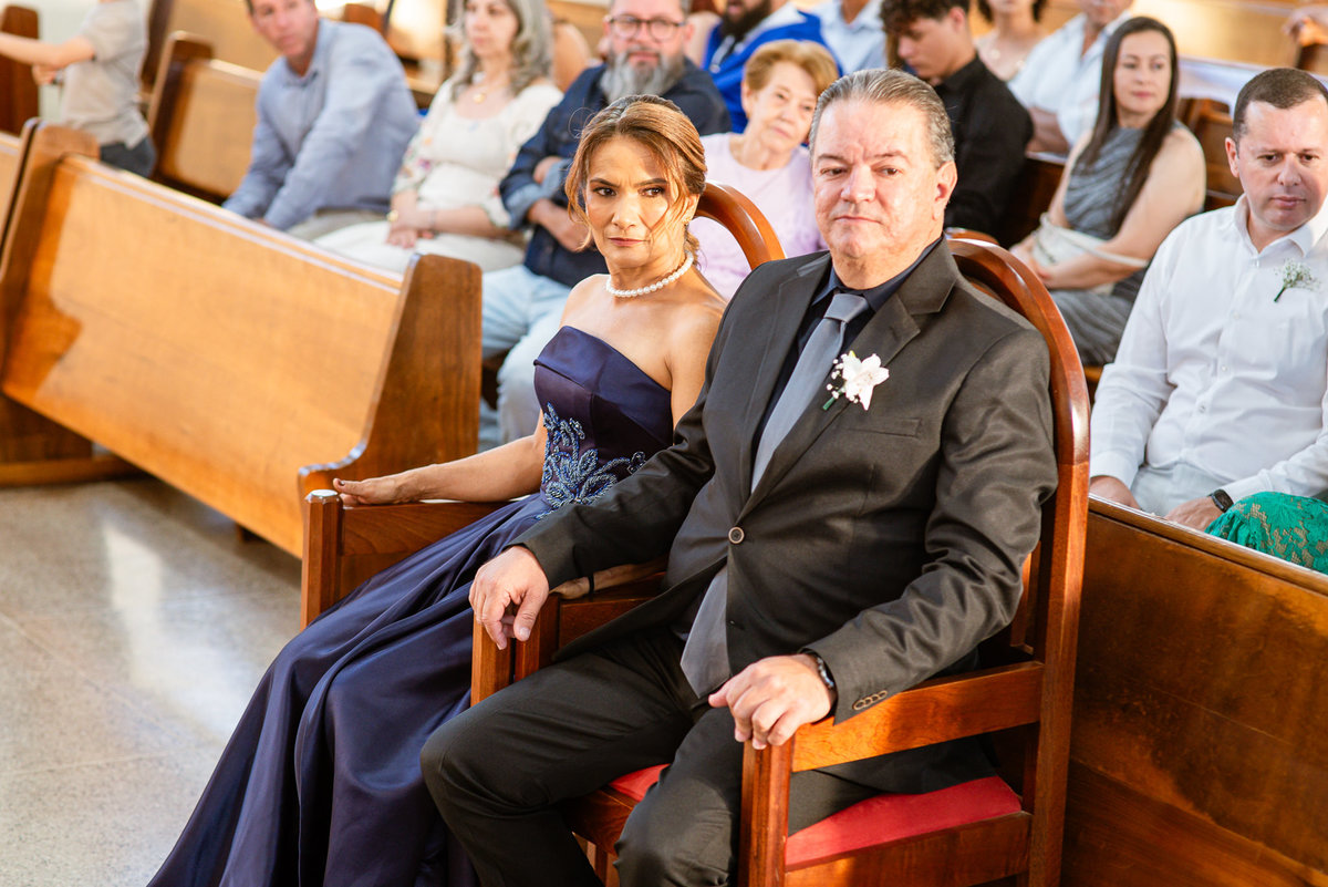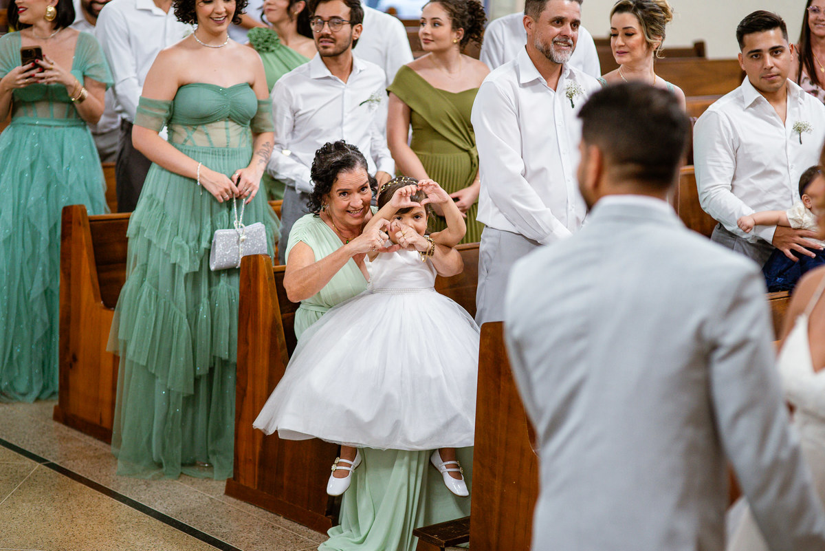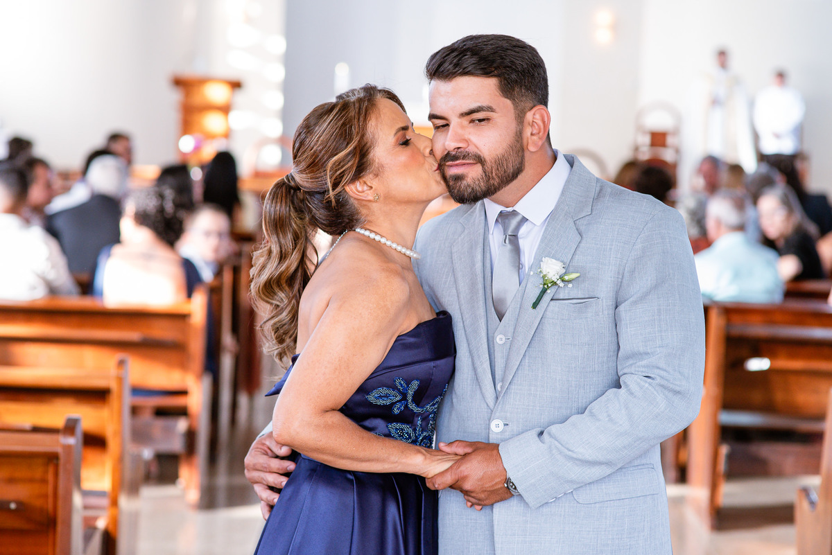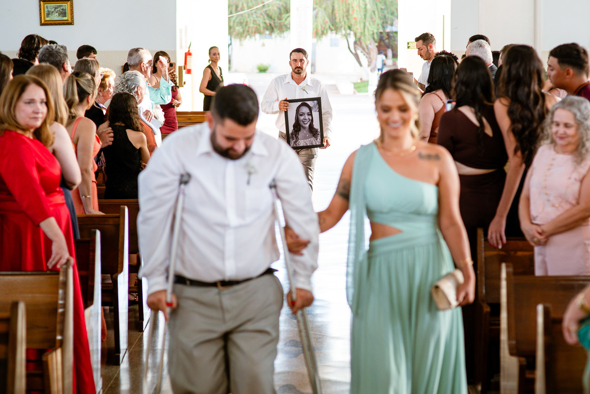 A cerimônia teve seu início imediato. Aos poucos, padrinhos e madrinhas começaram a entrar. Os noivos prepararam uma homenagem para sua parente falecida há poucos dias. Com uma foto em sinal de respeito e saudade, um dos padrinhos trouxe essa homenagem póstuma à ela. Foi uma emoção contagiante. Rayan se posicionou de braços dados com seus pais na porta. Caminhando juntos, todos sorridentes e felizes, eles adentraram ao recinto. Os pajens vieram logo após, trazendo um pouco de alento para os que se emocionaram. A leveza das crianças faz com que o nosso coração se quebranta de tal forma que esquecemos os momentos de dor. Enfim, era chegada a hora da noiva. Bheatriz desceu do carro e com o auxilio da equipe cerimonial, posicionou-se atrás da porta de mãos dadas com seu filho Matheus. Os olhares todos voltados para lá, principalmente do noivo. A sua música escolhida foi iniciada, trazendo toda a fé da noiva naquele momento. Poucos segundos depois, as portas da Igreja se abriram e surgiu a noiva, com seu vestido maravilhoso, toda feliz e sorridente, de braços dados com seu filho. Eles caminharam rumo ao encontro final com o noivo. Os olhares emocionados dividiam-se entre ver toda a beleza e exuberância da noiva e ver a reação do noivo.