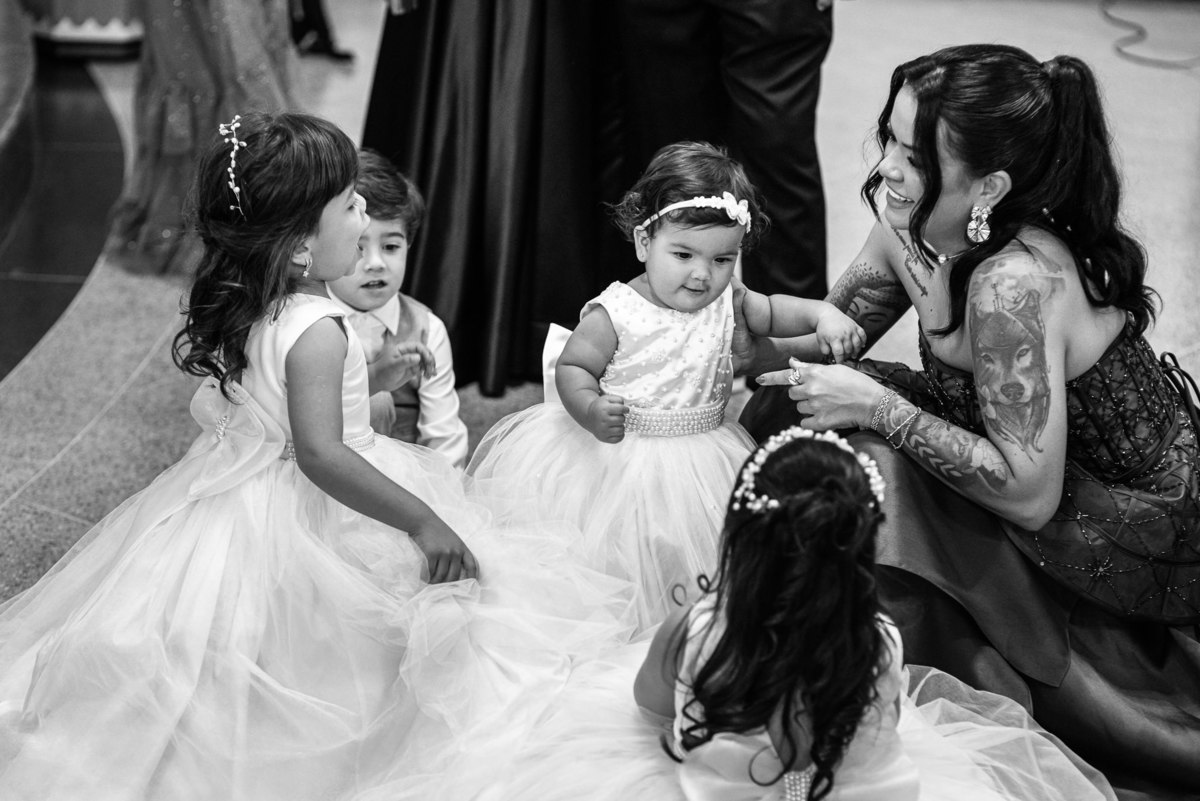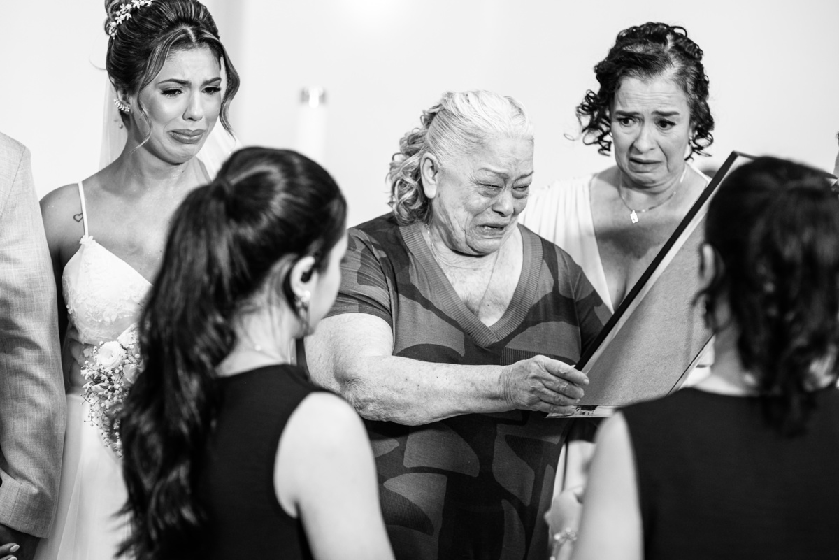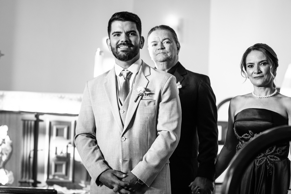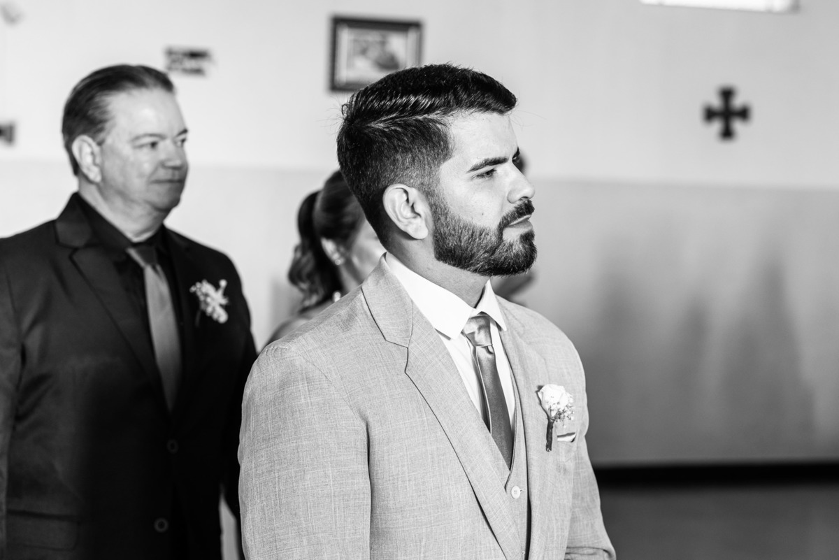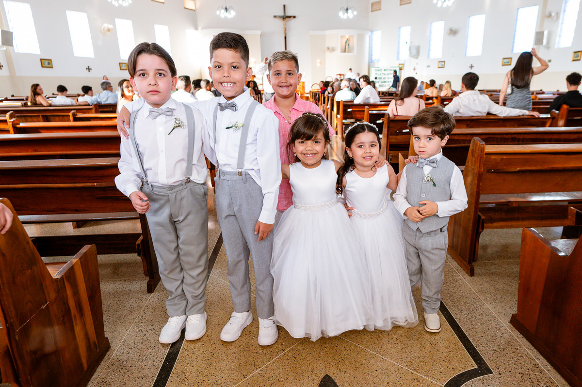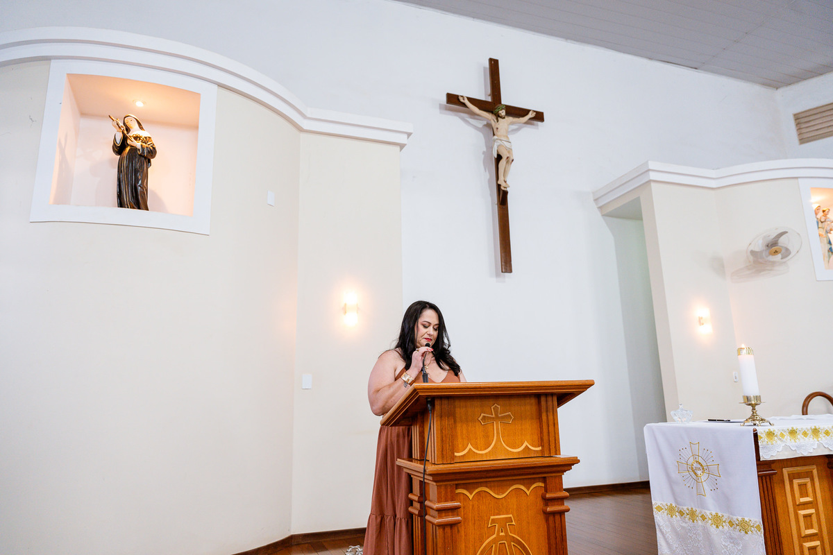A cerimônia teve seu início imediato. Aos poucos, padrinhos e madrinhas começaram a entrar. Os noivos prepararam uma homenagem para sua parente falecida há poucos dias. Com uma foto em sinal de respeito e saudade, um dos padrinhos trouxe essa homenagem póstuma à ela. Foi uma emoção contagiante. Rayan se posicionou de braços dados com seus pais na porta. Caminhando juntos, todos sorridentes e felizes, eles adentraram ao recinto. Os pajens vieram logo após, trazendo um pouco de alento para os que se emocionaram. A leveza das crianças faz com que o nosso coração se quebranta de tal forma que esquecemos os momentos de dor. Enfim, era chegada a hora da noiva. Bheatriz desceu do carro e com o auxilio da equipe cerimonial, posicionou-se atrás da porta de mãos dadas com seu filho Matheus. Os olhares todos voltados para lá, principalmente do noivo. A sua música escolhida foi iniciada, trazendo toda a fé da noiva naquele momento. Poucos segundos depois, as portas da Igreja se abriram e surgiu a noiva, com seu vestido maravilhoso, toda feliz e sorridente, de braços dados com seu filho. Eles caminharam rumo ao encontro final com o noivo. Os olhares emocionados dividiam-se entre ver toda a beleza e exuberância da noiva e ver a reação do noivo.