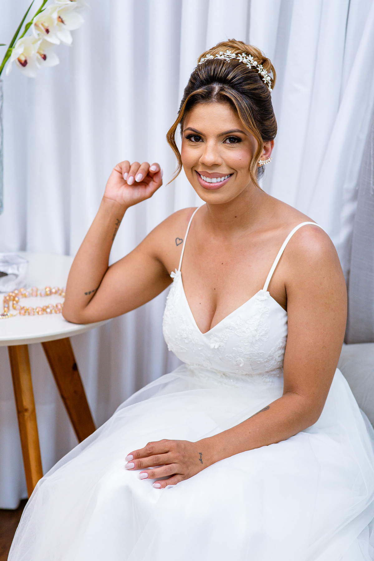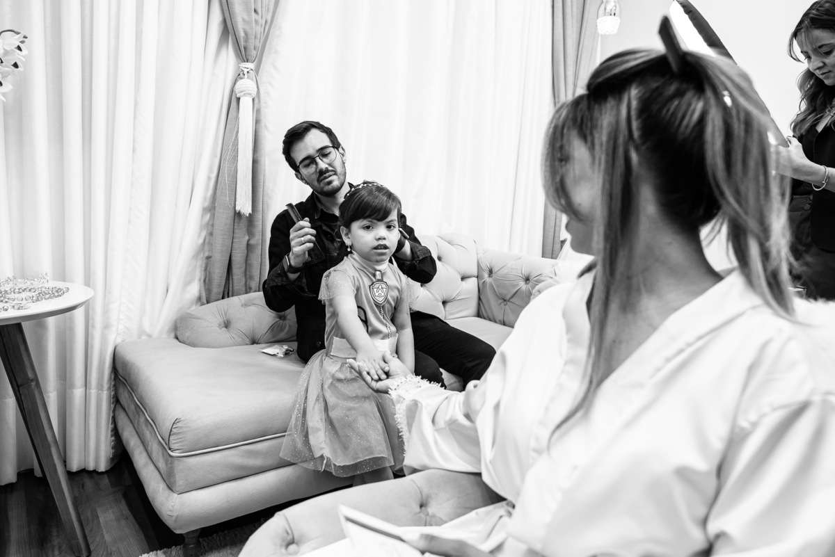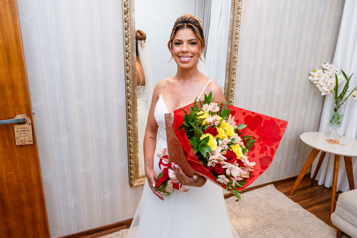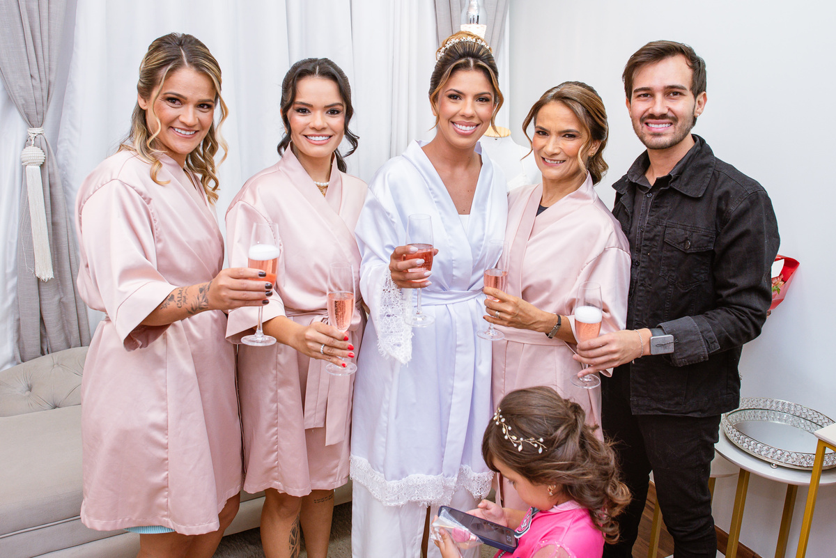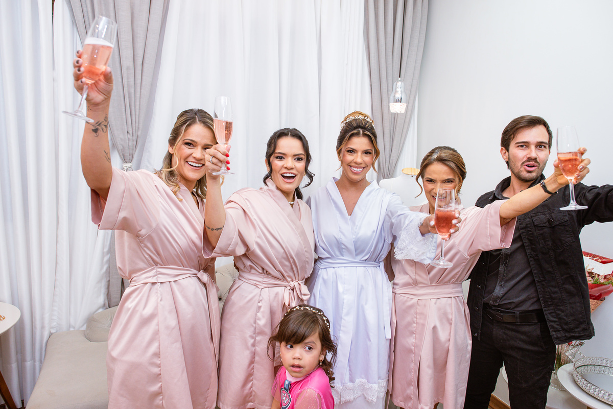 Bheatriz, por sua vez, fez seu dia de noiva aqui em Patos. Pelas mãos talentosíssimas de Brisley Ariel, quando chegamos no local, a make estava prontinha. A noiva plena, aguardando somente o penteado ser produzido. E ninguém menos do que seu padrinho e amigo de infância - Marcos Allvez, que ficou encarregado dessa tarefa muito especial. Bheatriz contou ainda com uma ajuda importante: a filha do casal. A pequena fez questão de acompanhar de perto, brincou, correu e fez a alegria de todos com sua graça e simpatia. A mãe do noivo e a sua madrinha de confiança a acompanharam também. Estávamos fazendo as fotografias quando de repente, somos surpreendidos com um lindíssimo presente do noivo. Ele enviou um buquê maravilhoso, com cartinha escrita à mão lembrando ela dos 10 anos de amor até ali. Bheatriz ficou muito feliz. Além do mais, ela ama amarelo, e as flores escolhidas por ele foram certeiras. A cada minuto que se passava, a ansiedade insistia em rondar o salão. Por mais tranquila que a noiva é, os minutos não davam trégua. Fizemos o brinde para quebrar um pouco da ansiedade do momento. Elas brindaram super felizes e deixaram a noiva a sós. Enfim, depois de fazermos mais algumas fotos e o penteado ficar pronto, era hora de colocar o vestido.