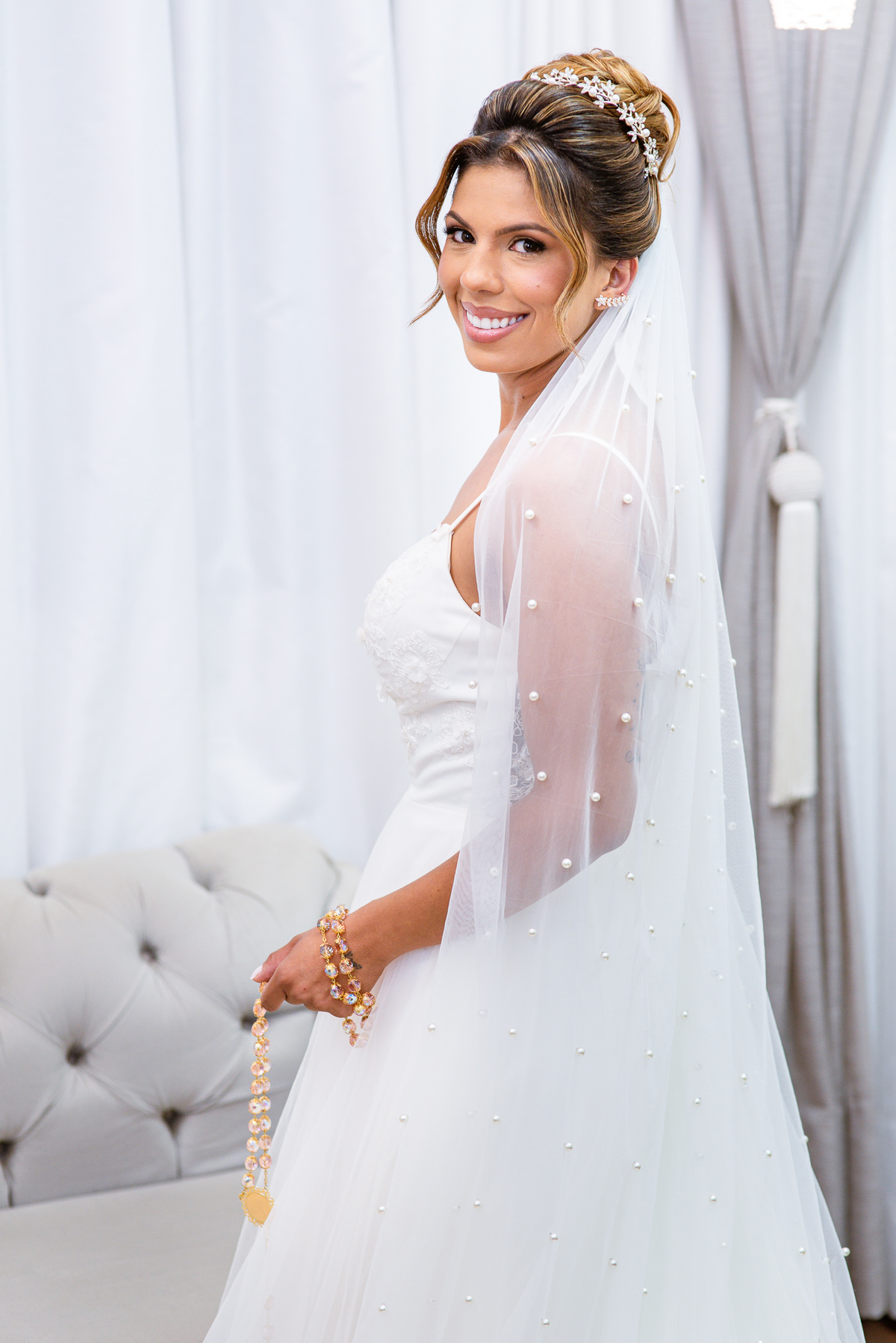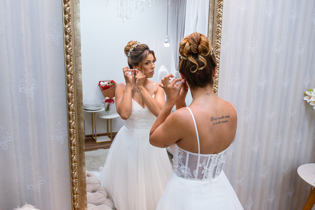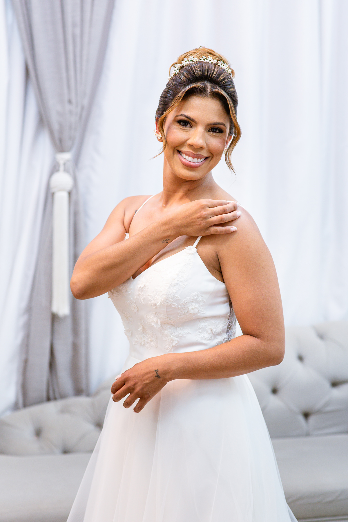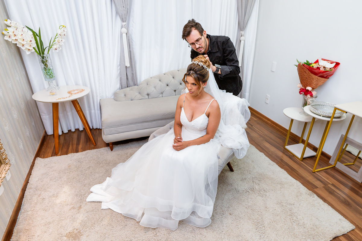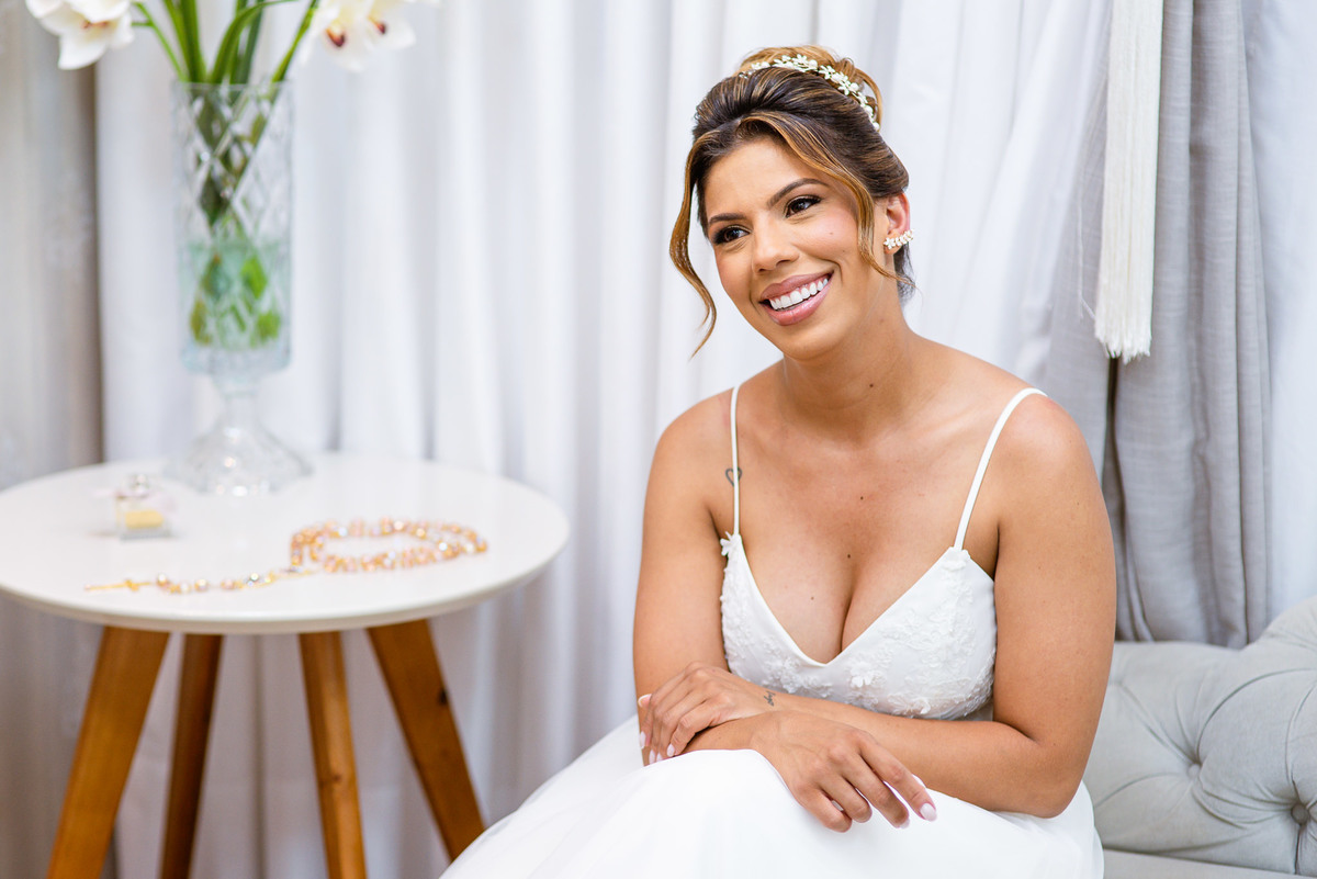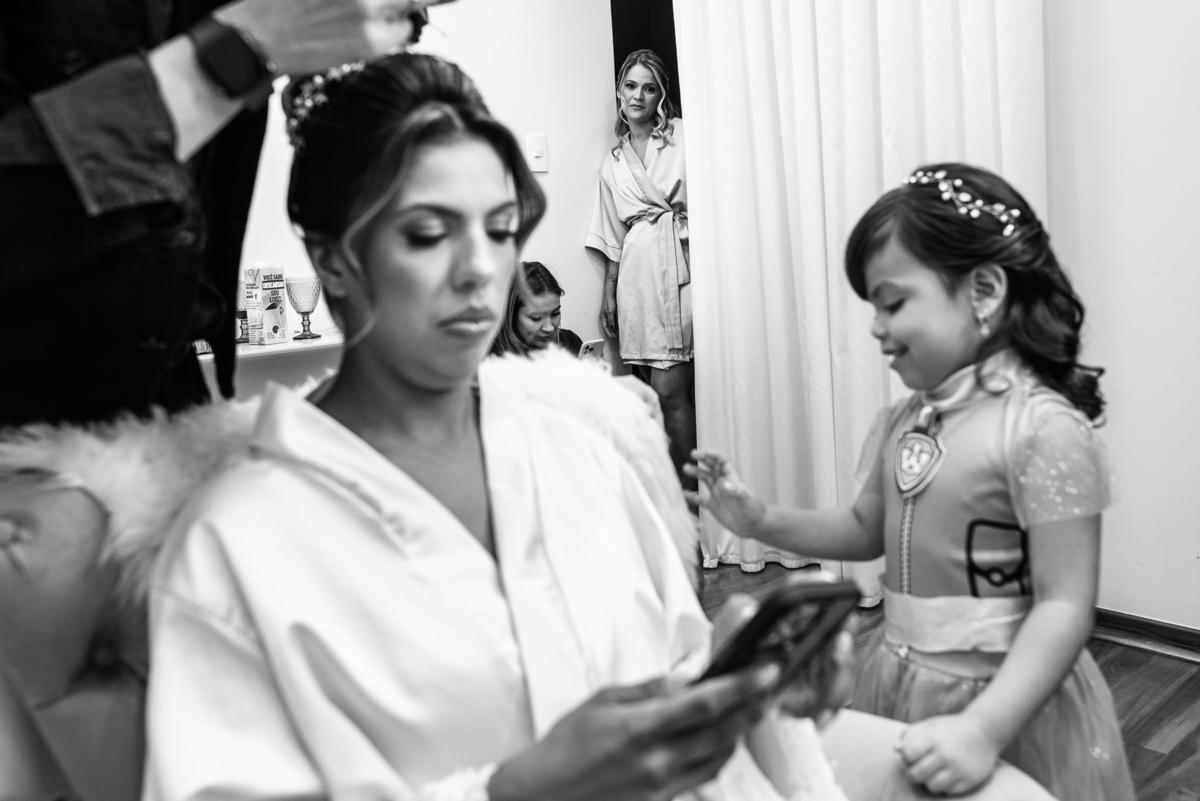 Bheatriz, por sua vez, fez seu dia de noiva aqui em Patos. Pelas mãos talentosíssimas de Brisley Ariel, quando chegamos no local, a make estava prontinha. A noiva plena, aguardando somente o penteado ser produzido. E ninguém menos do que seu padrinho e amigo de infância - Marcos Allvez, que ficou encarregado dessa tarefa muito especial. Bheatriz contou ainda com uma ajuda importante: a filha do casal. A pequena fez questão de acompanhar de perto, brincou, correu e fez a alegria de todos com sua graça e simpatia. A mãe do noivo e a sua madrinha de confiança a acompanharam também. Estávamos fazendo as fotografias quando de repente, somos surpreendidos com um lindíssimo presente do noivo. Ele enviou um buquê maravilhoso, com cartinha escrita à mão lembrando ela dos 10 anos de amor até ali. Bheatriz ficou muito feliz. Além do mais, ela ama amarelo, e as flores escolhidas por ele foram certeiras. A cada minuto que se passava, a ansiedade insistia em rondar o salão. Por mais tranquila que a noiva é, os minutos não davam trégua. Fizemos o brinde para quebrar um pouco da ansiedade do momento. Elas brindaram super felizes e deixaram a noiva a sós. Enfim, depois de fazermos mais algumas fotos e o penteado ficar pronto, era hora de colocar o vestido.